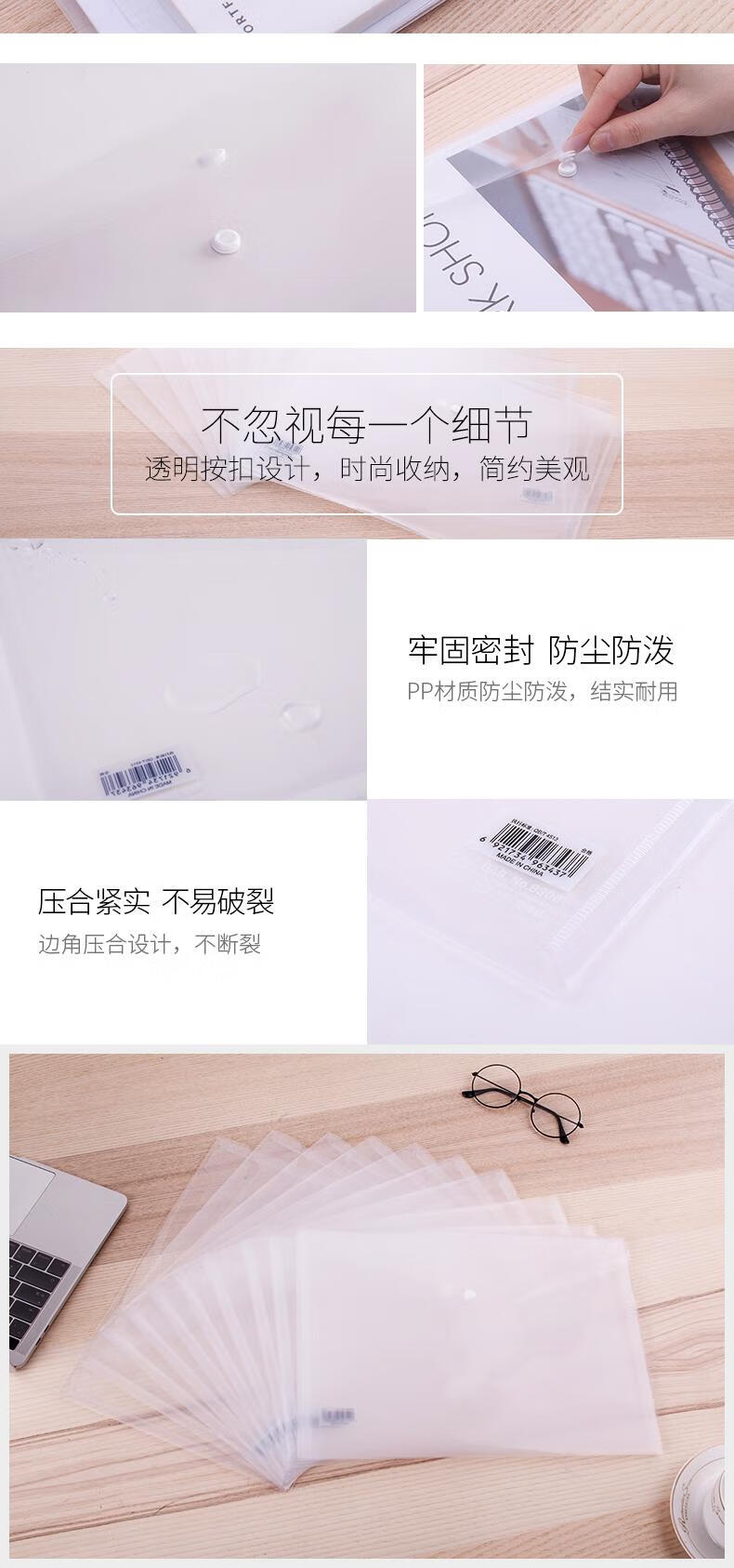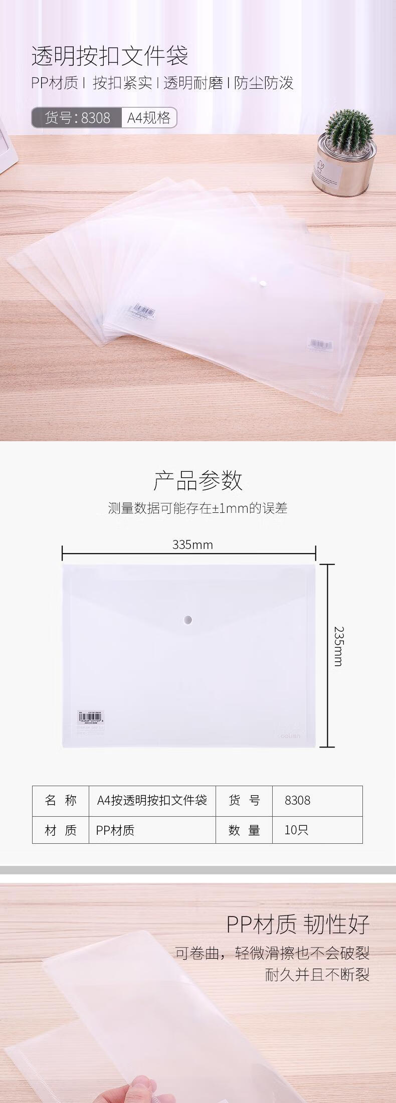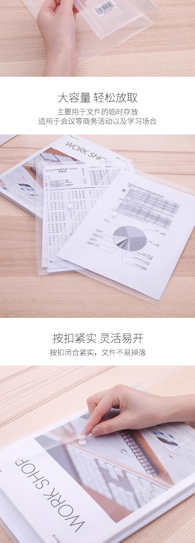 得力(deli)10只A4透明文件袋 按扣资料袋 塑料档案袋票据档案合同标书学生试卷收纳袋学习用品 P08308