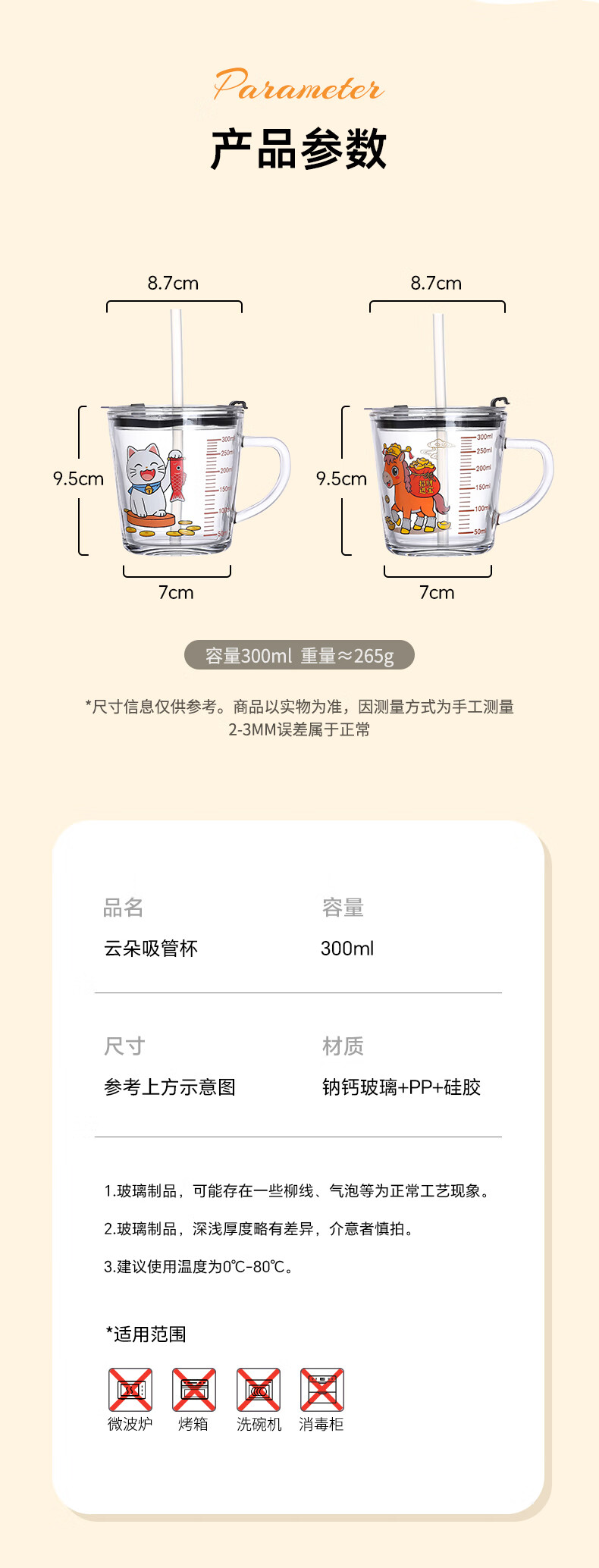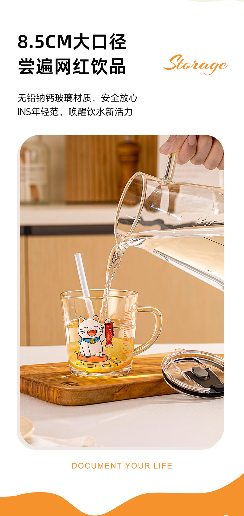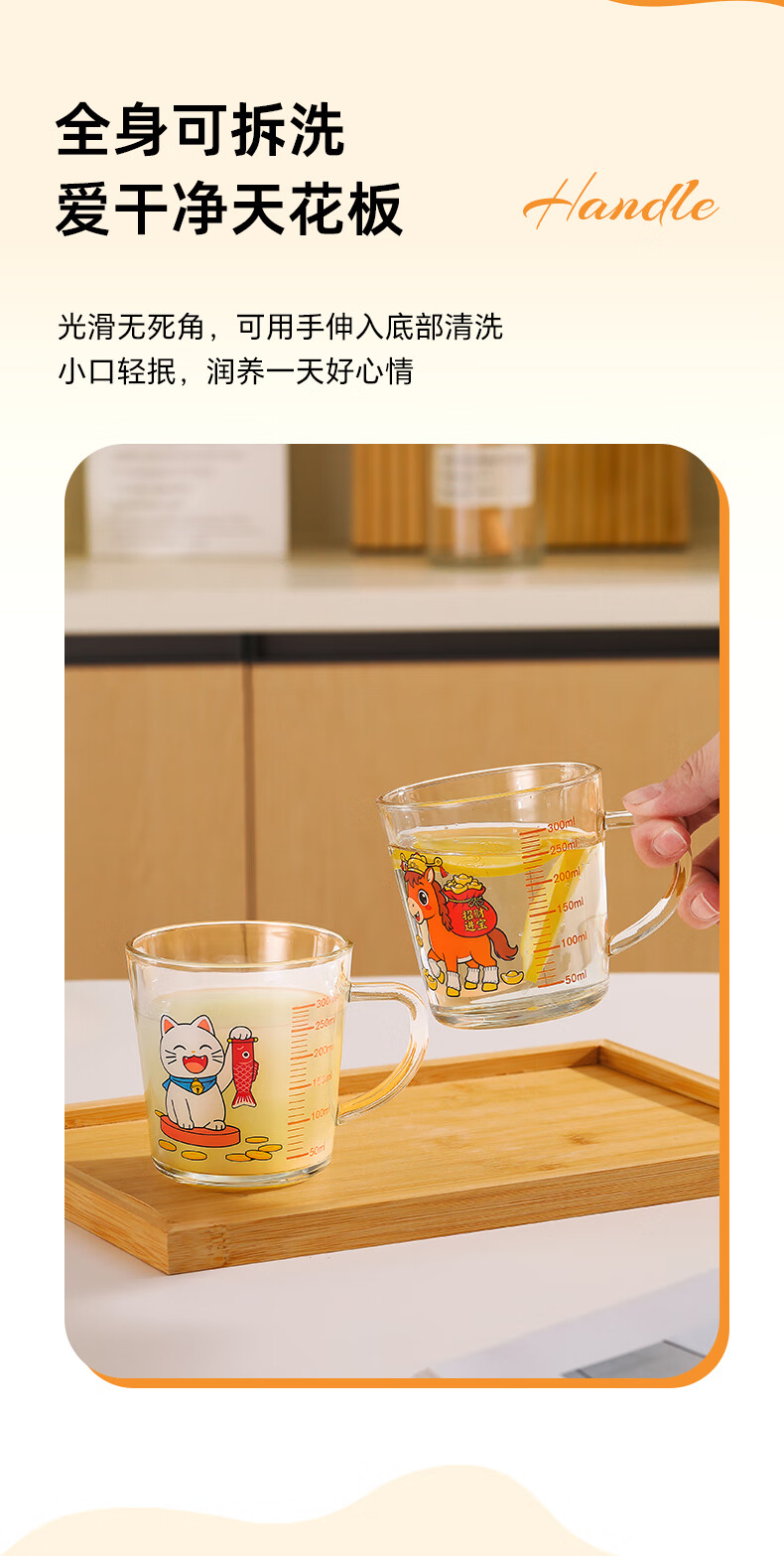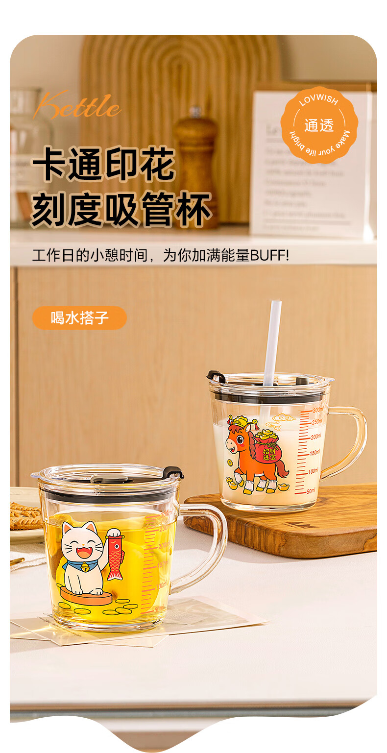乐唯诗(LOVWISH)玻璃带刻度牛奶杯儿童吸管水杯喝奶杯泡冲奶粉专用大宝宝早餐杯 卡通吸管杯【恐龙】300ml1只