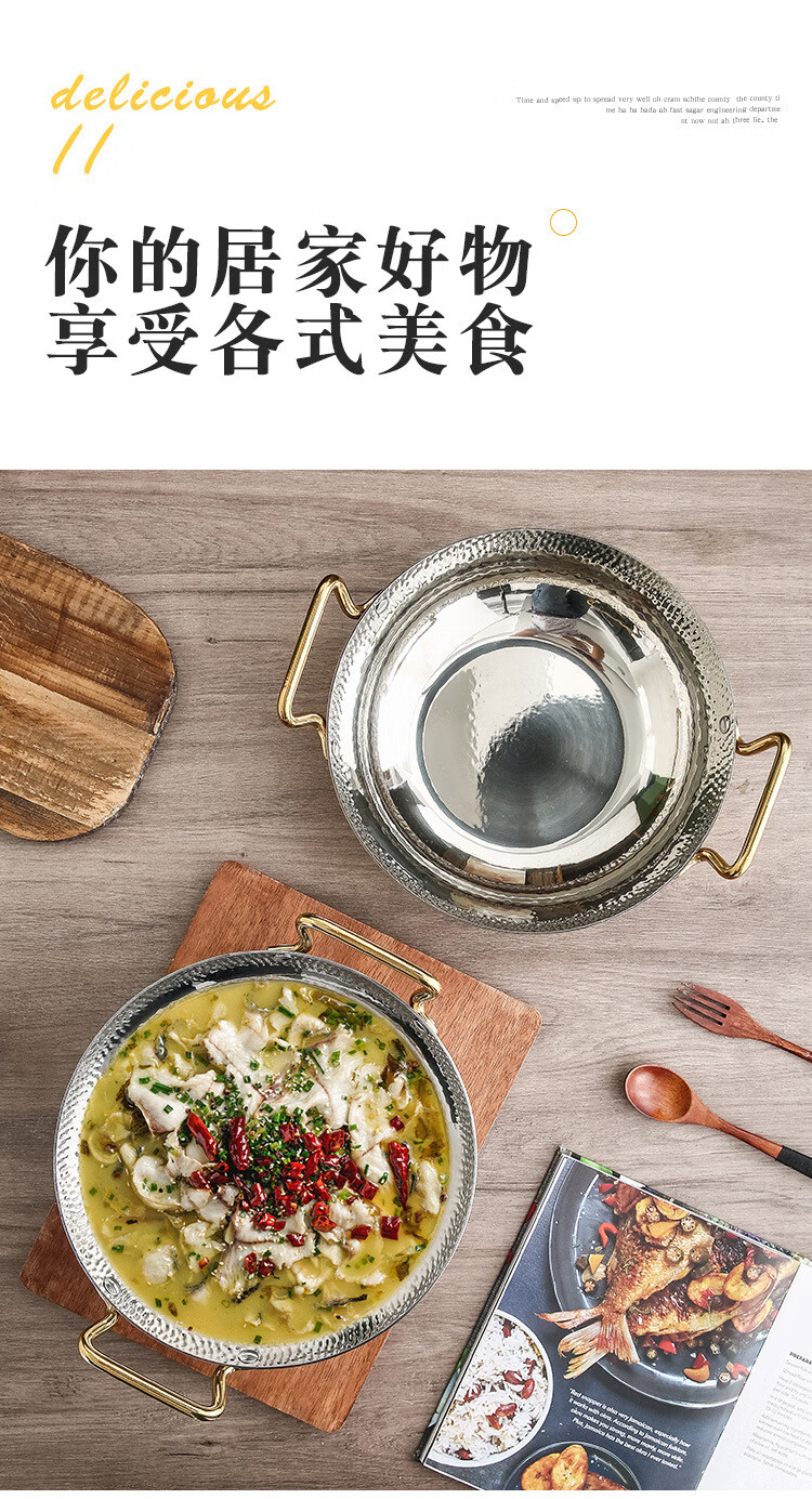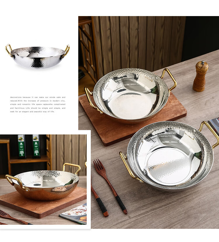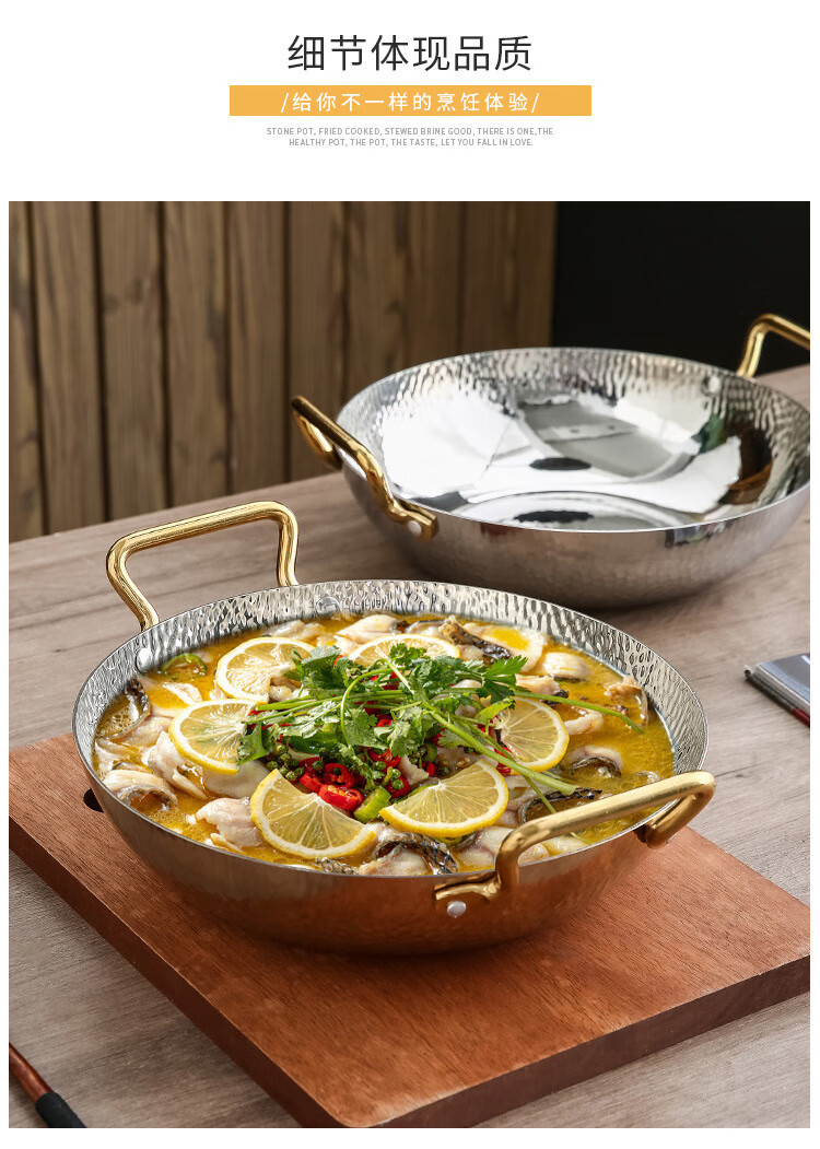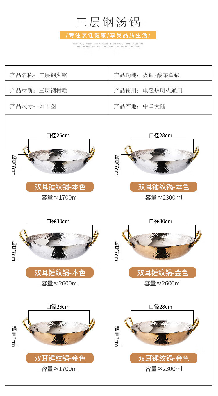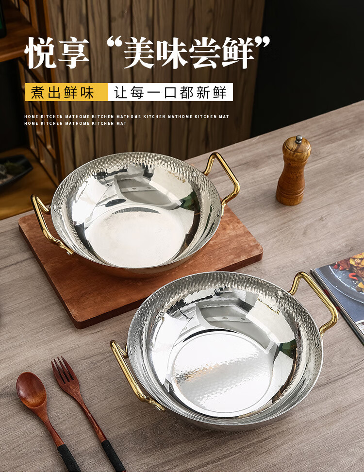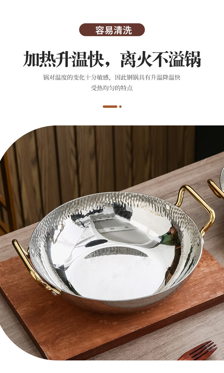 妙乐熊不锈钢锤纹双耳金色火锅锅加厚酸菜水煮鱼盆商用干锅电磁炉清汤锅 本色内口径30*高 7cm