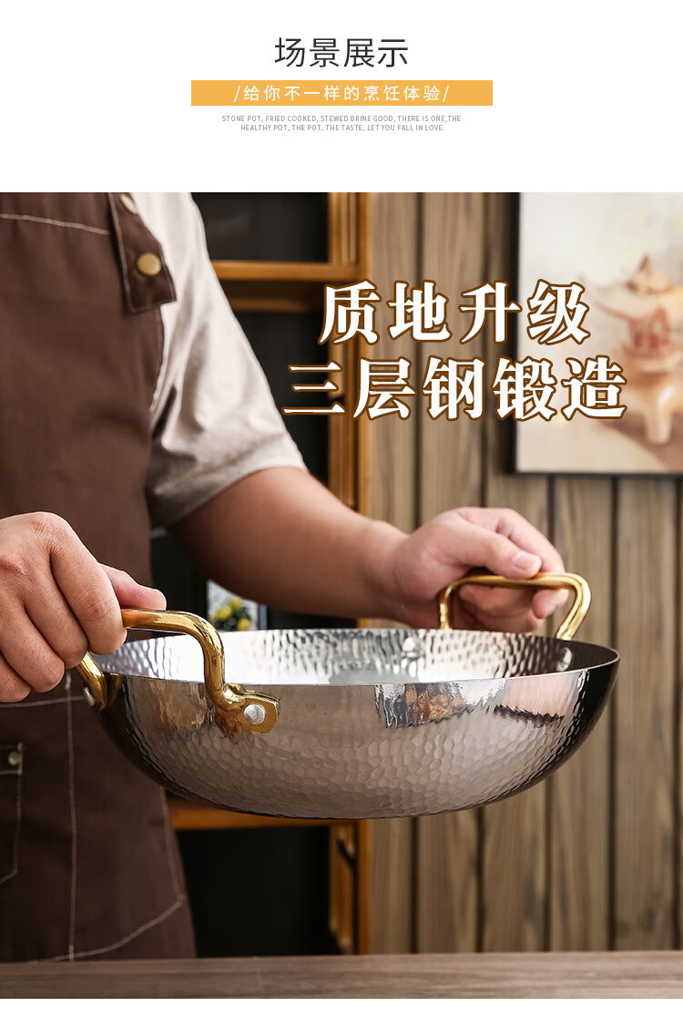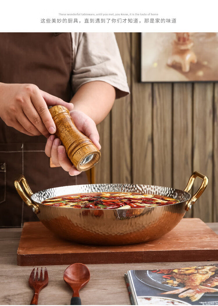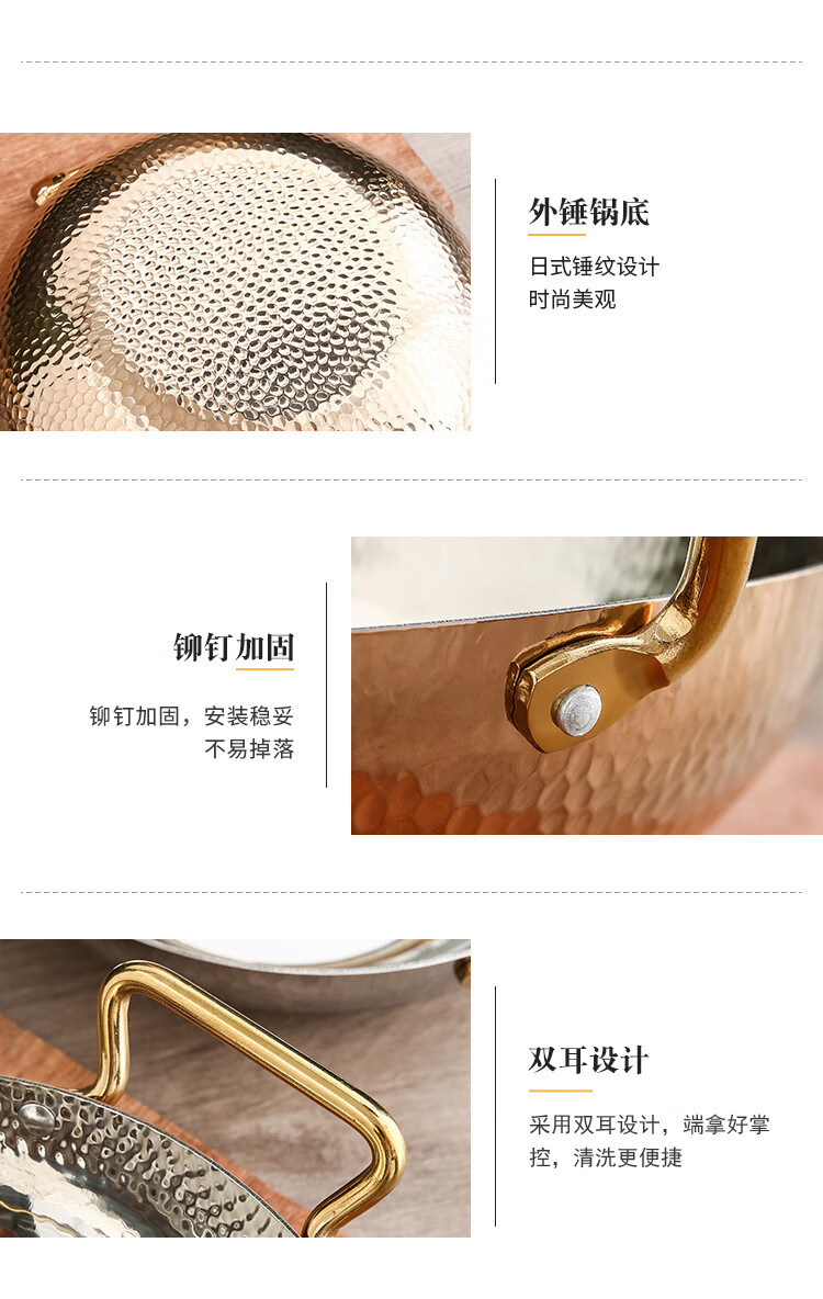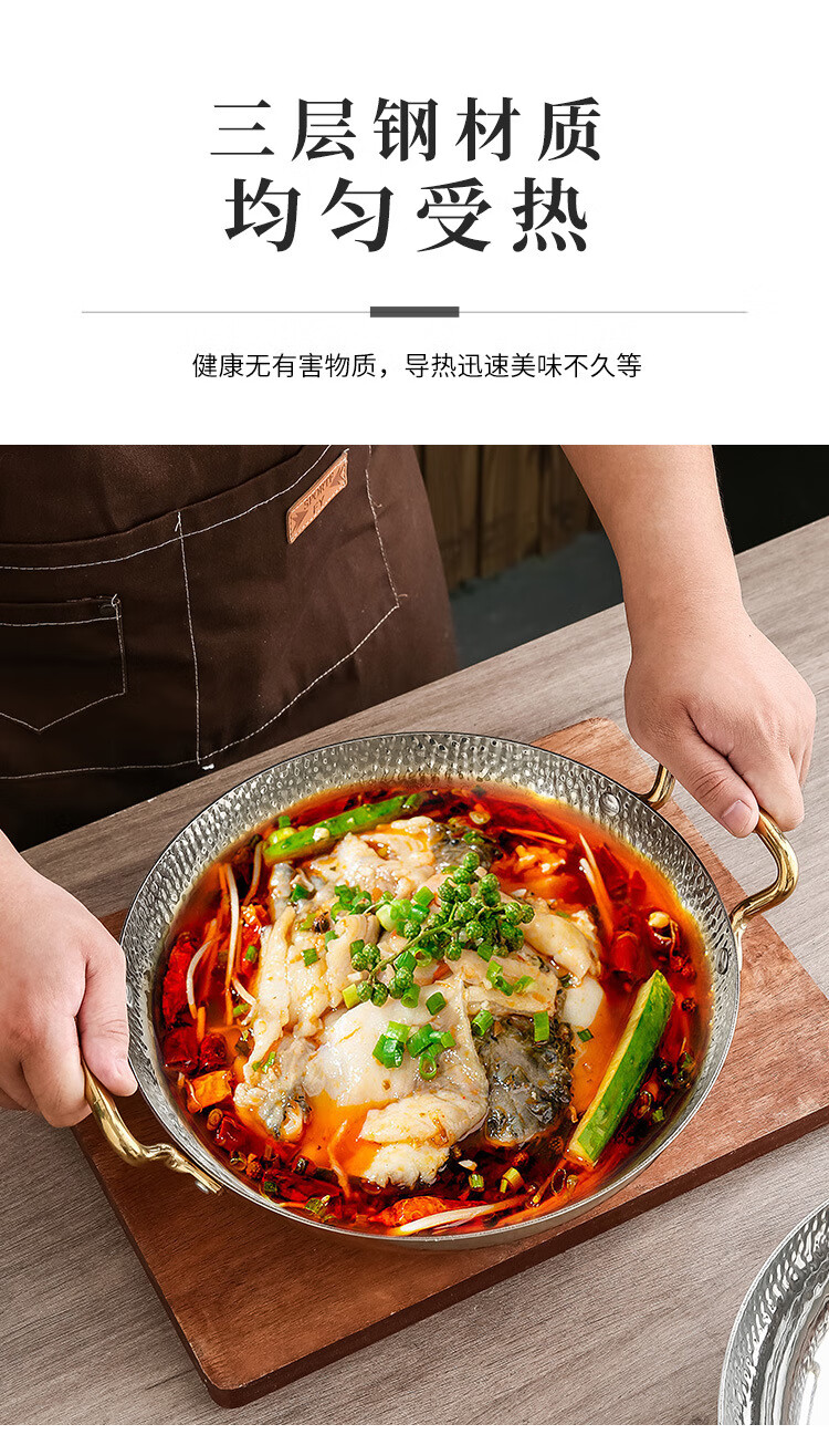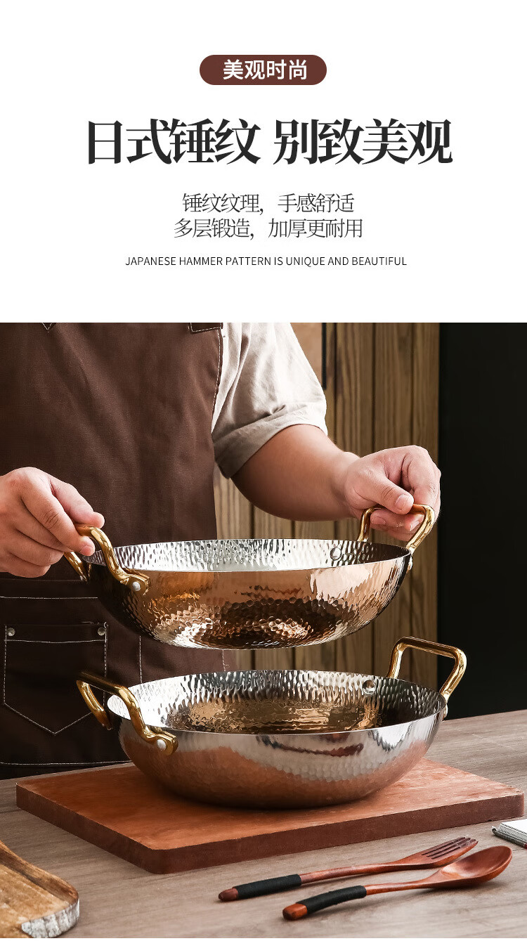 妙乐熊不锈钢锤纹双耳金色火锅锅加厚酸菜水煮鱼盆商用干锅电磁炉清汤锅 本色内口径30*高 7cm