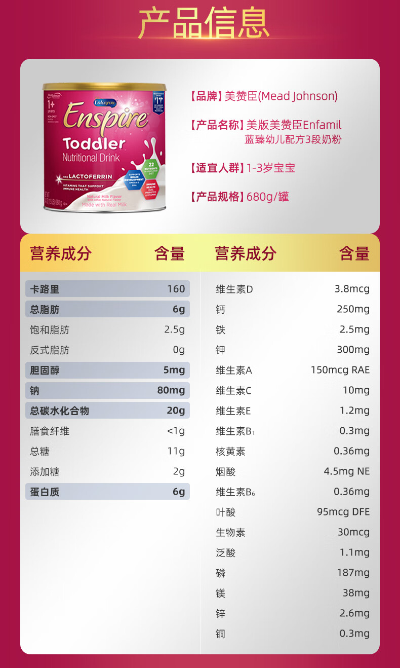 美赞臣蓝臻3段 婴幼儿奶粉 美版原装(1-3岁)680g 蓝臻3段 680g*1罐