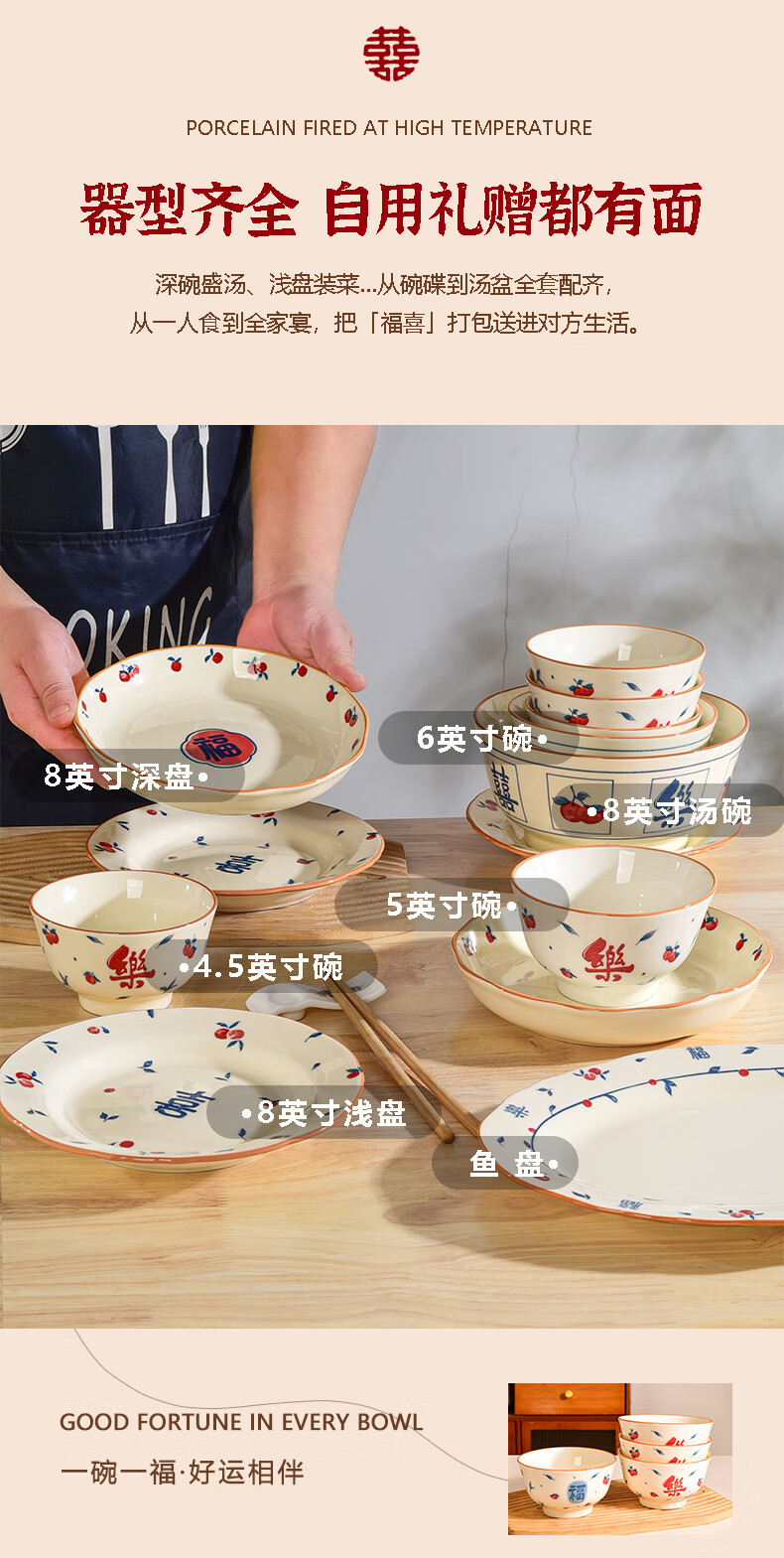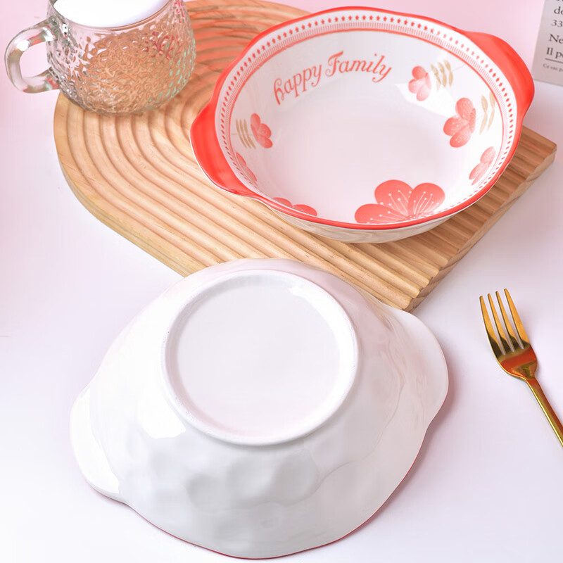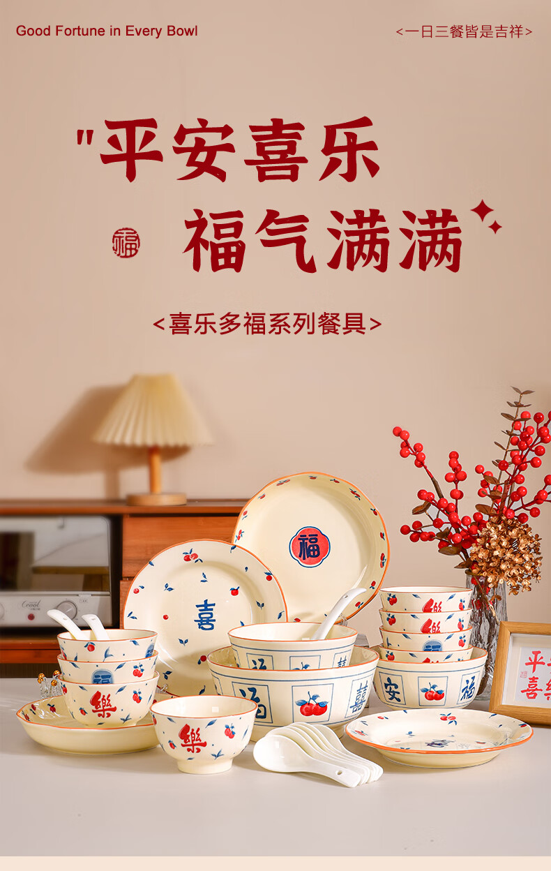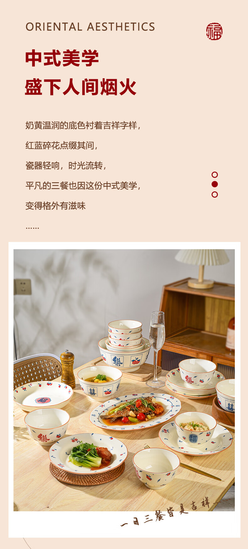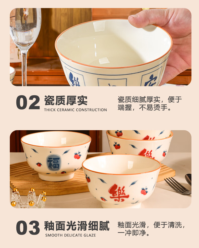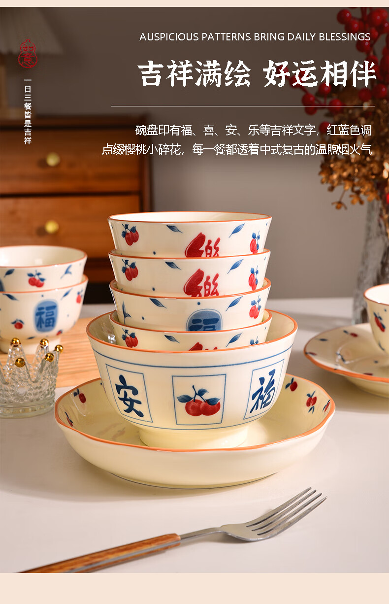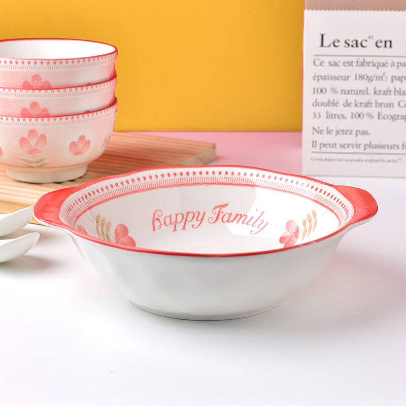 想迦喜乐多福系列陶瓷餐具中式家用陶瓷春节送礼餐具套装釉下彩 2只8.5英寸粉黛双耳碗