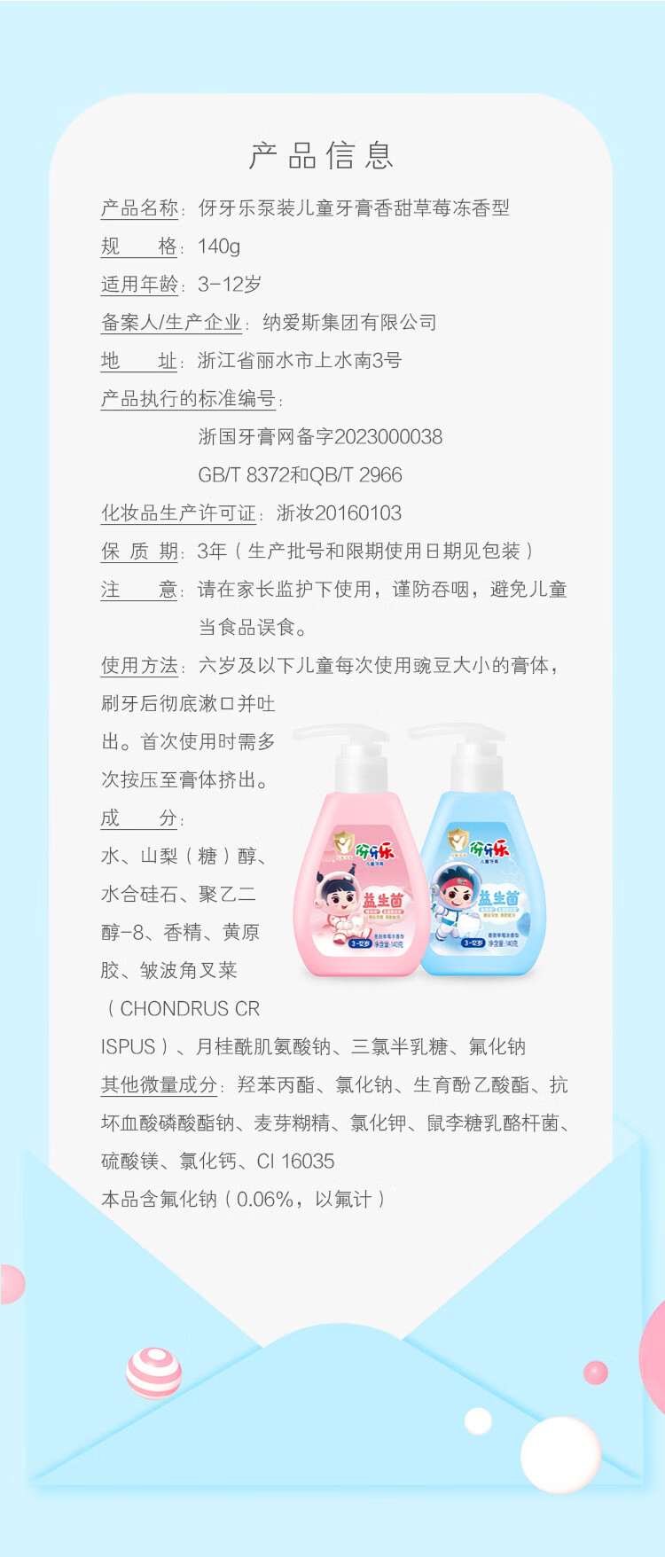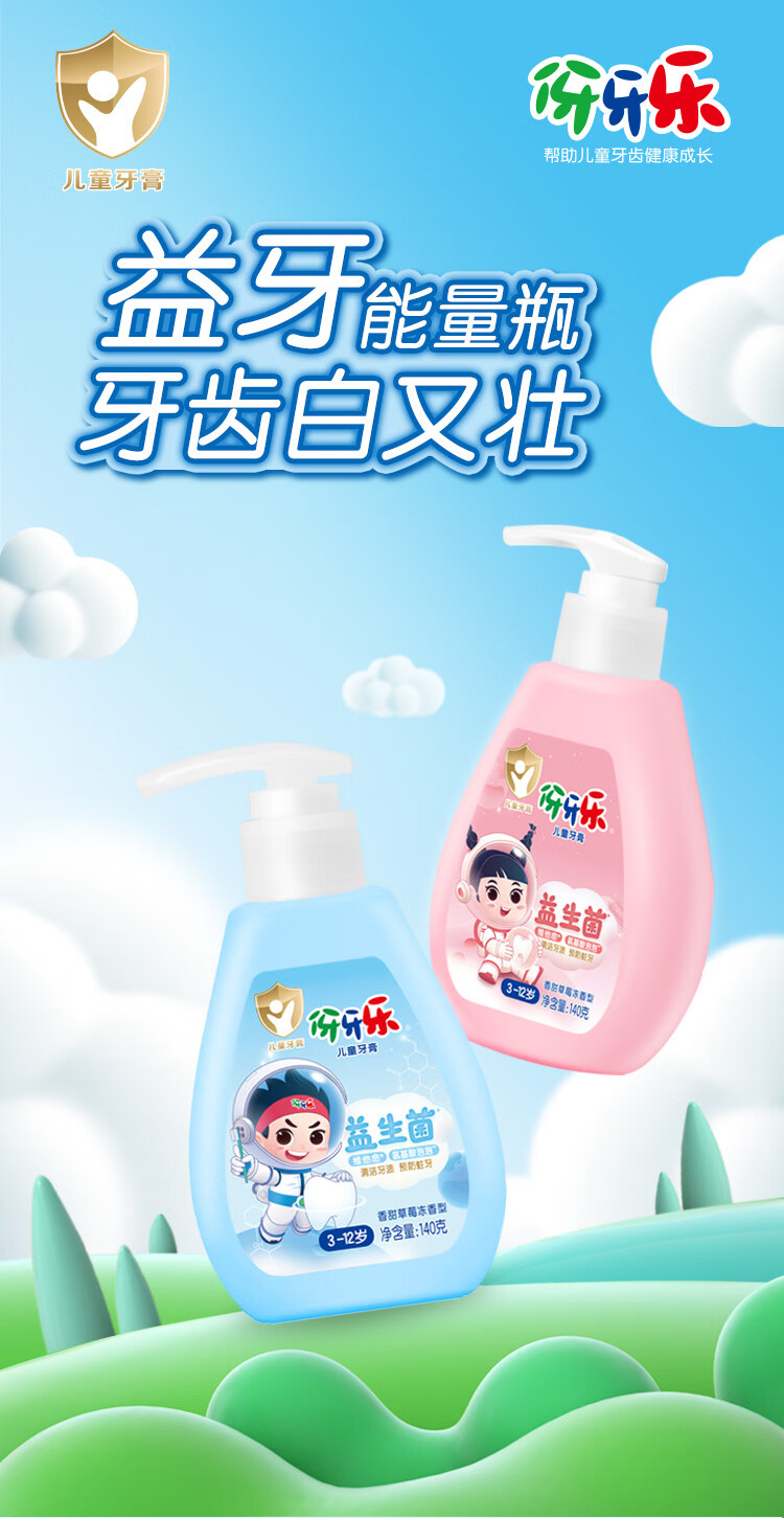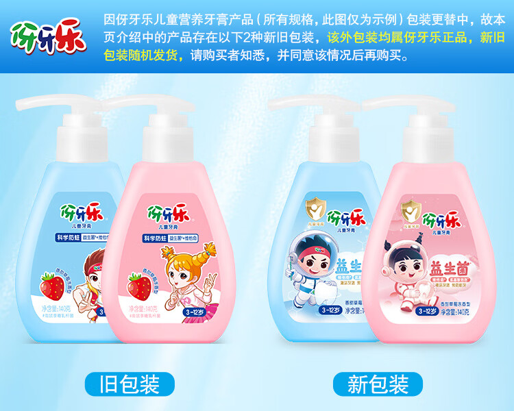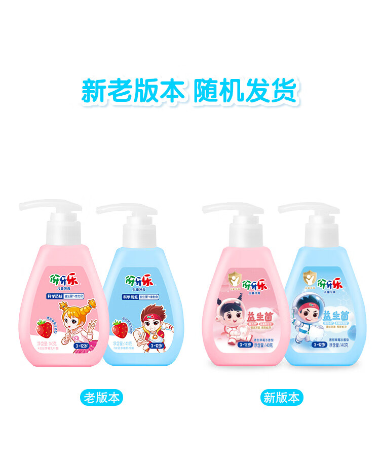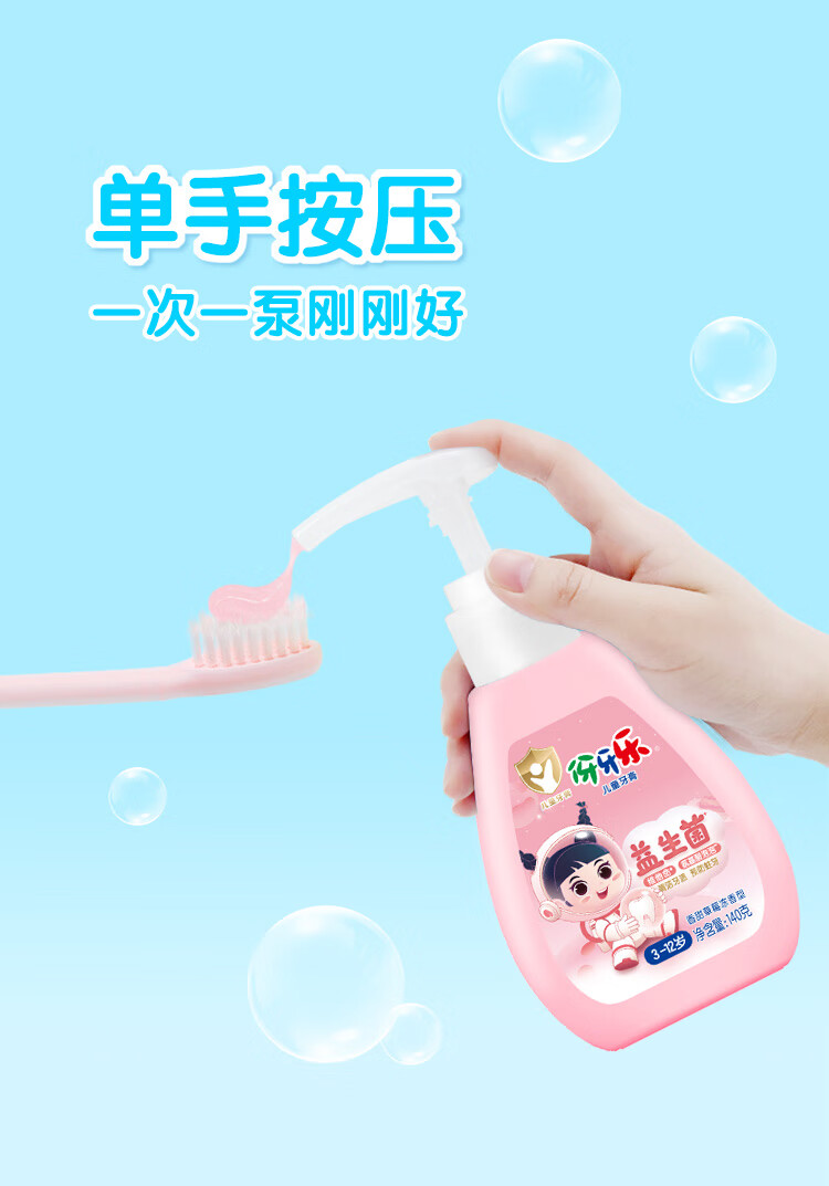 伢牙乐140g儿童按压式液体牙膏3-12岁科学含氟防蛀益生菌 低泡设计 140g*2支(粉瓶香甜草莓冻)