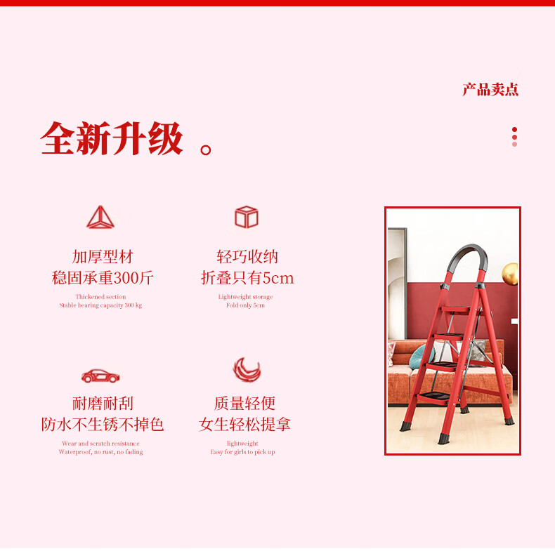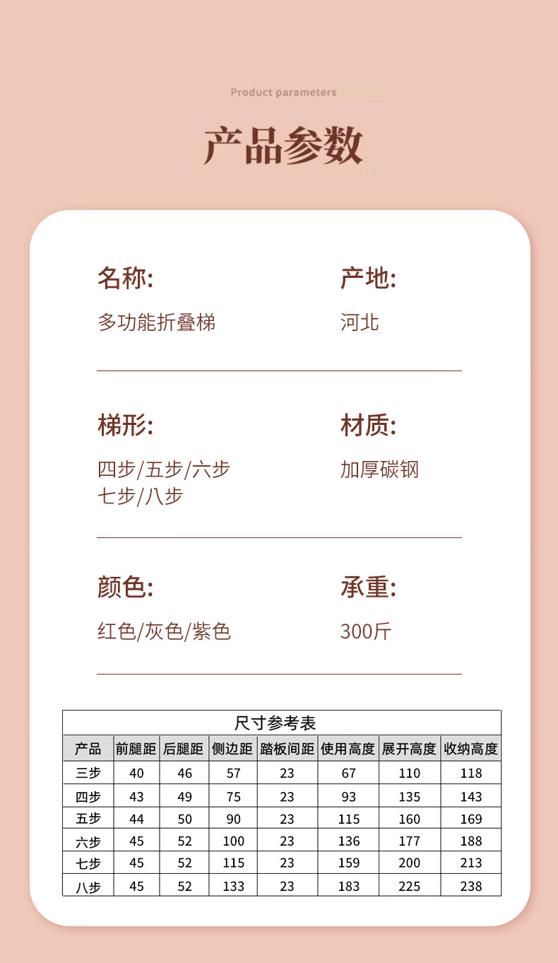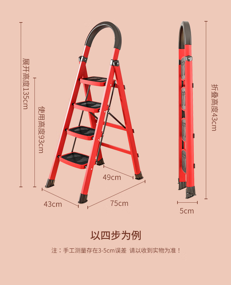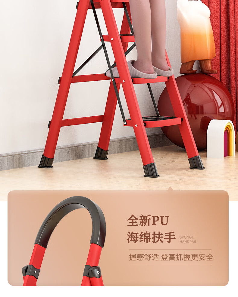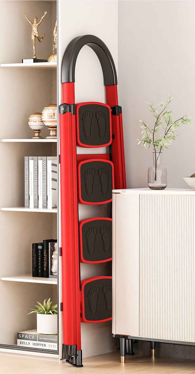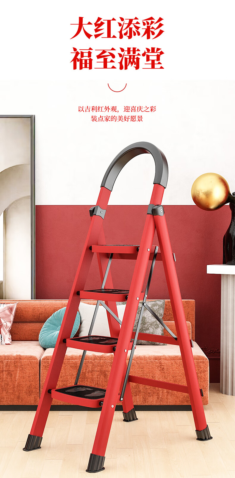 宝优妮家用人字梯多功能折叠梯电工程梯防滑梯子加固踏板加厚碳钢梯凳 红色四步梯马蹄脚椭圆踏板