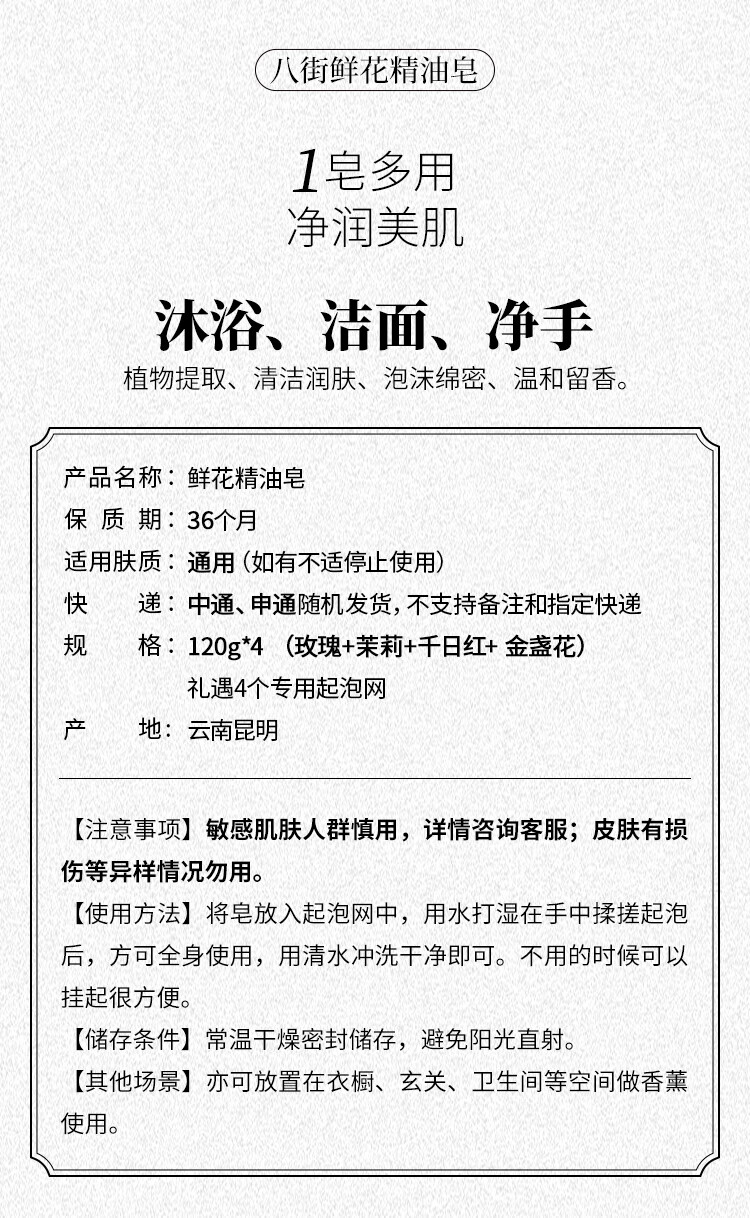 八街云南鲜花精油皂120g*4盒玫瑰茉莉洗脸澡洗头发肥皂洗手手工香皂 精油皂120g*4【玫瑰+茉莉+金盏花+千日红】+起泡网*4