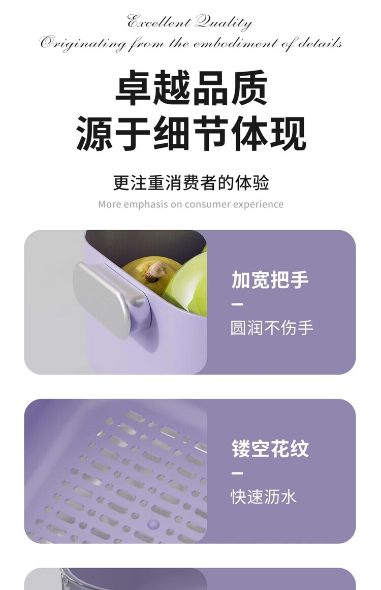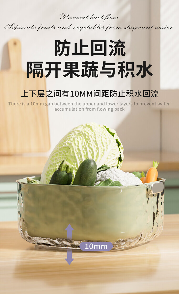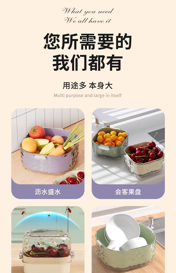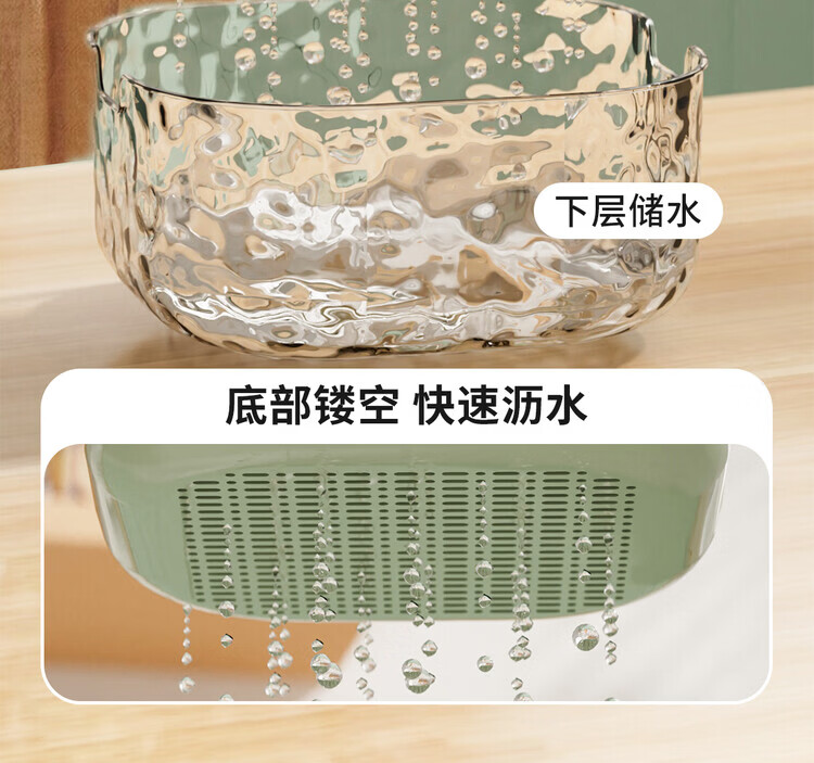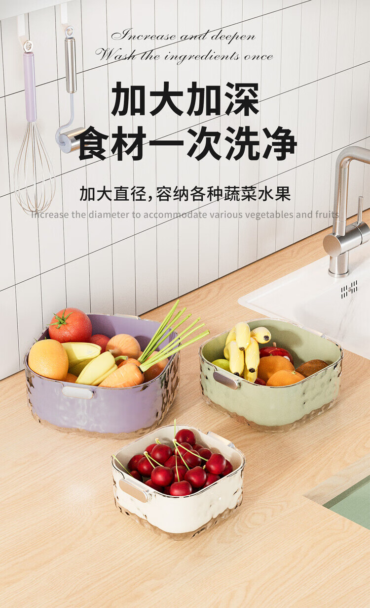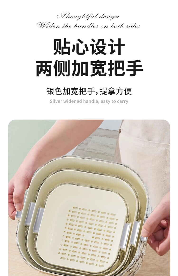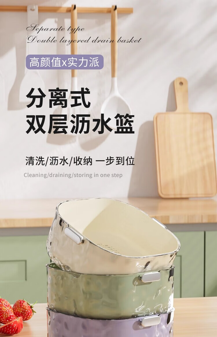 简漾双层洗菜盆沥水篮八件套厨房客厅家用洗水果盘简约塑料淘菜菜篮子 牛奶白-小号-双层沥水篮