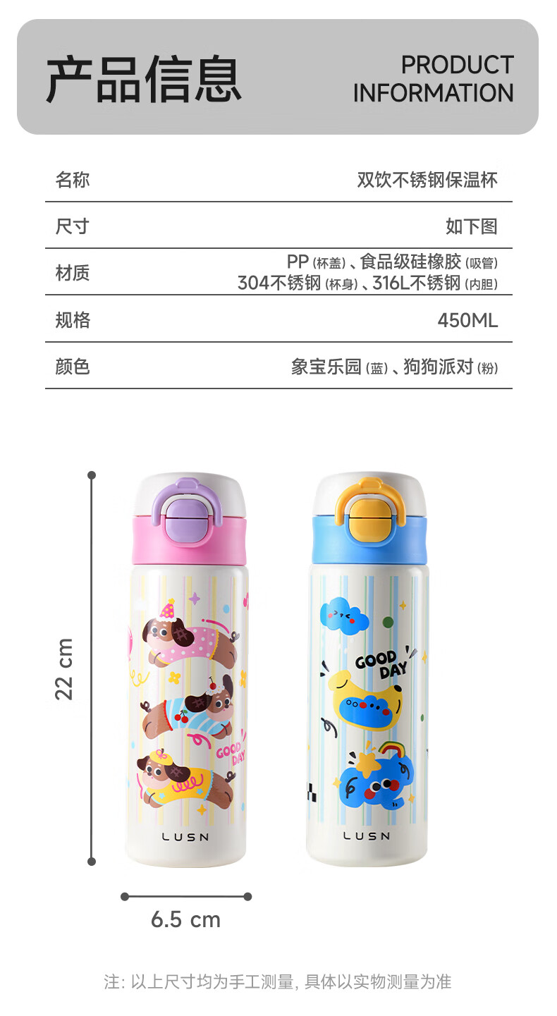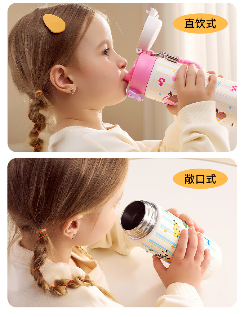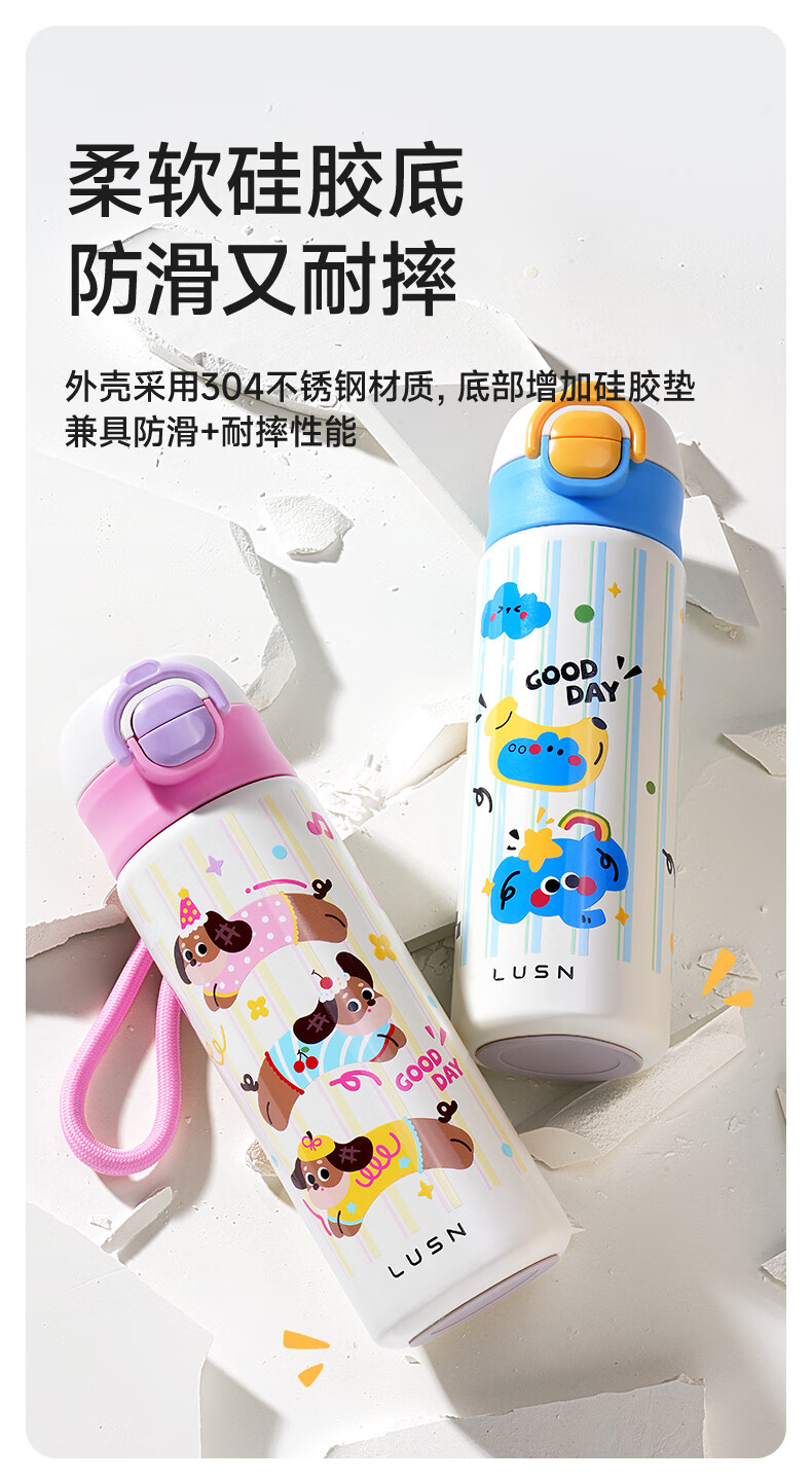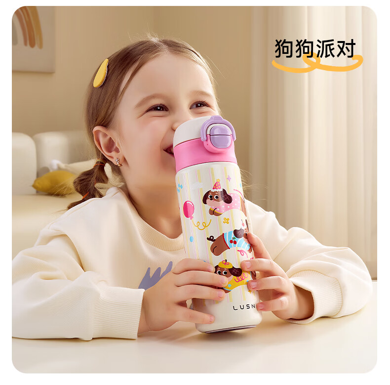 如山保温杯学生上学专用便携水杯女生高颜值儿童316L不锈钢吸管杯 狗狗派对【一盖双饮赠挂绳】450ml