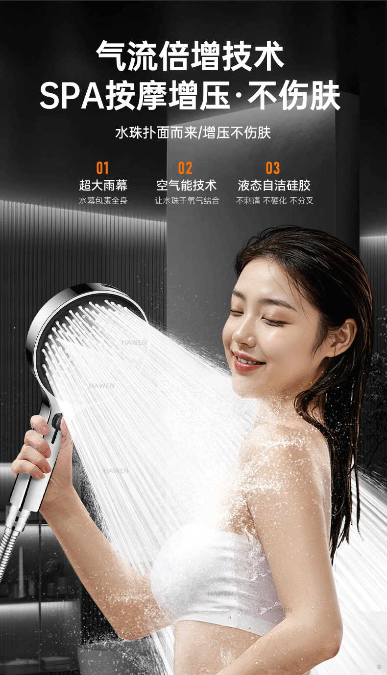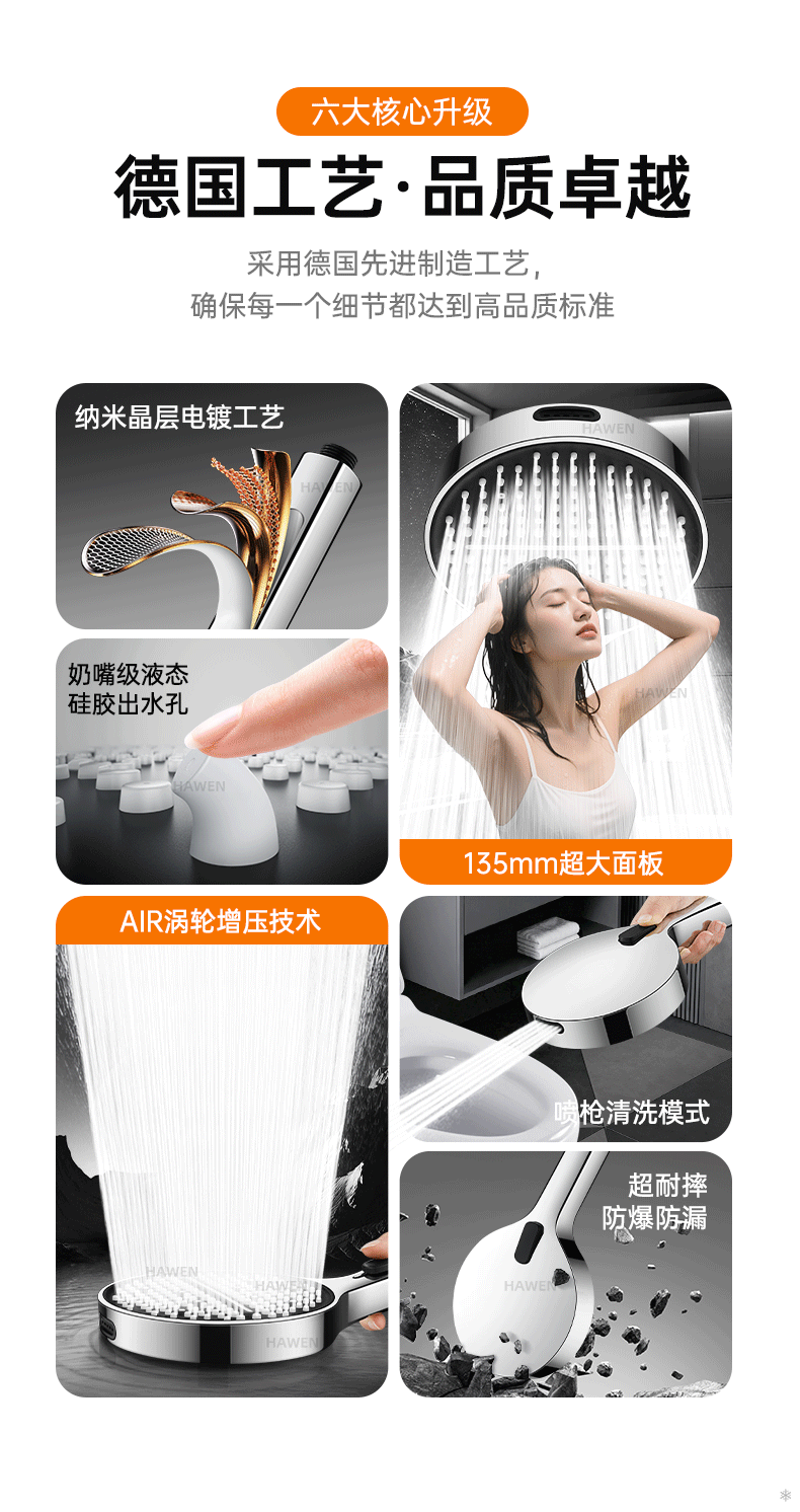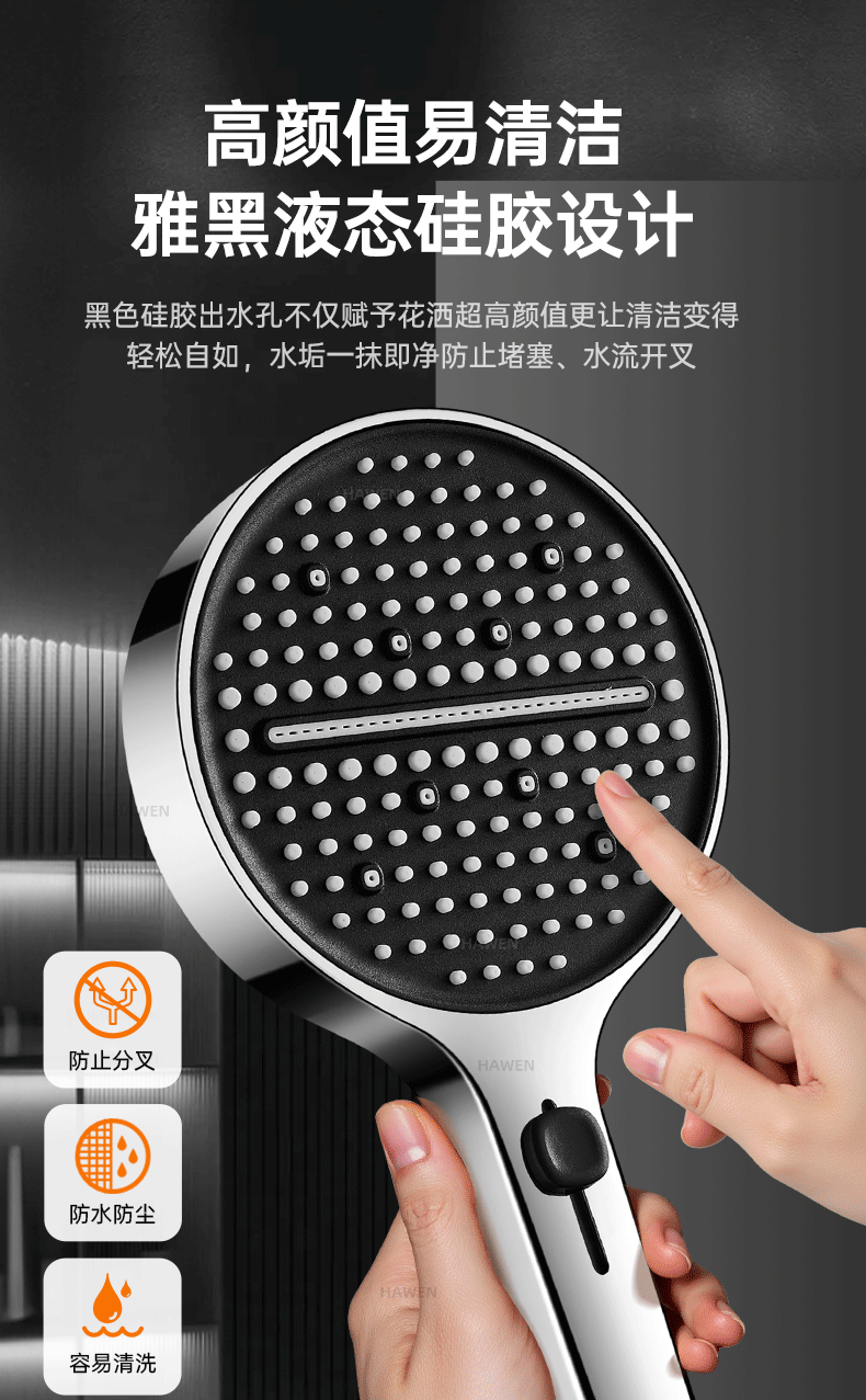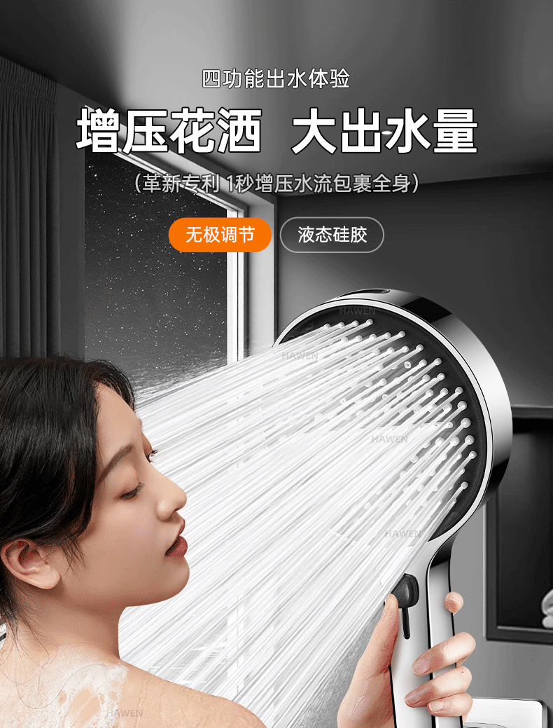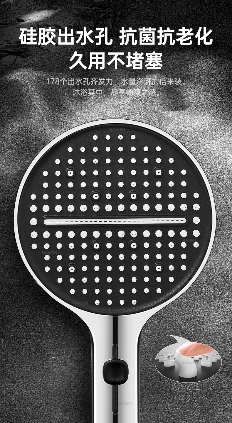 hawen【德国】增压花洒淋浴喷头家用浴室多功能加压手持莲蓬头无极花洒 【银黑】花洒+软管丨无极按键调节 四档切换丨硅胶大面板丨AIR空气超强增压