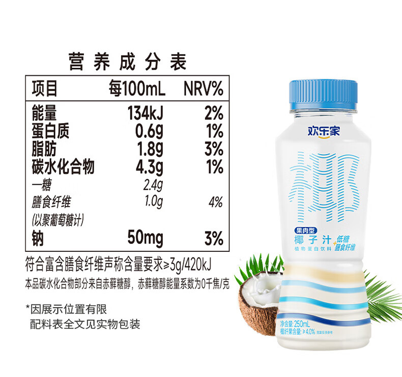 欢乐家低糖椰子汁250ml*15瓶 椰奶椰汁植物蛋白饮料 节日礼盒 【整箱】椰汁250ml*15瓶