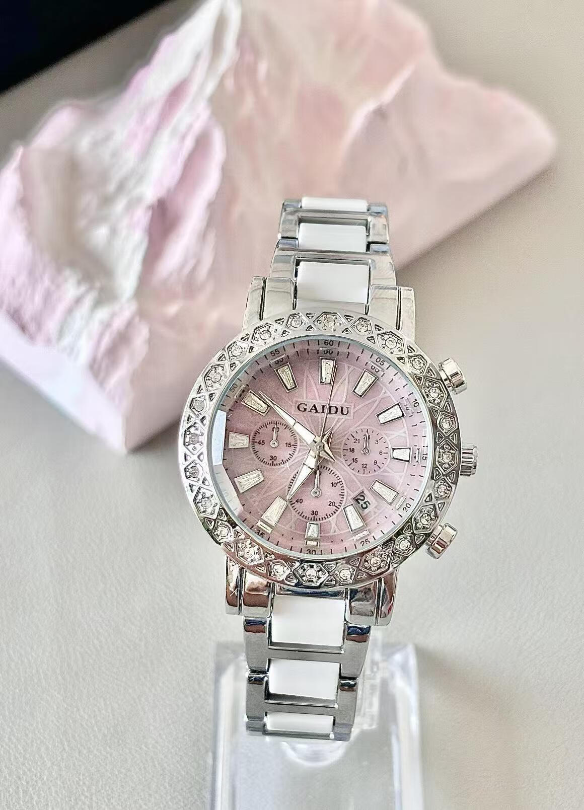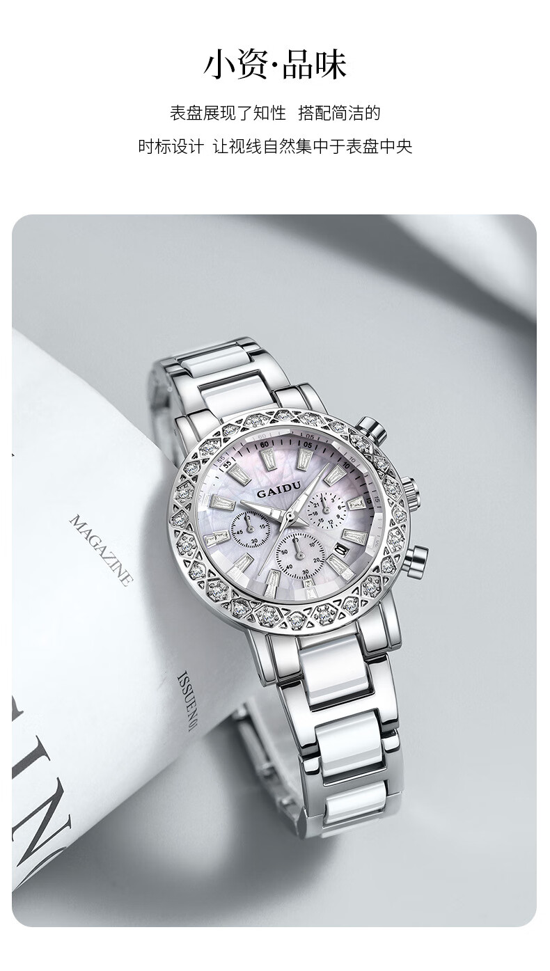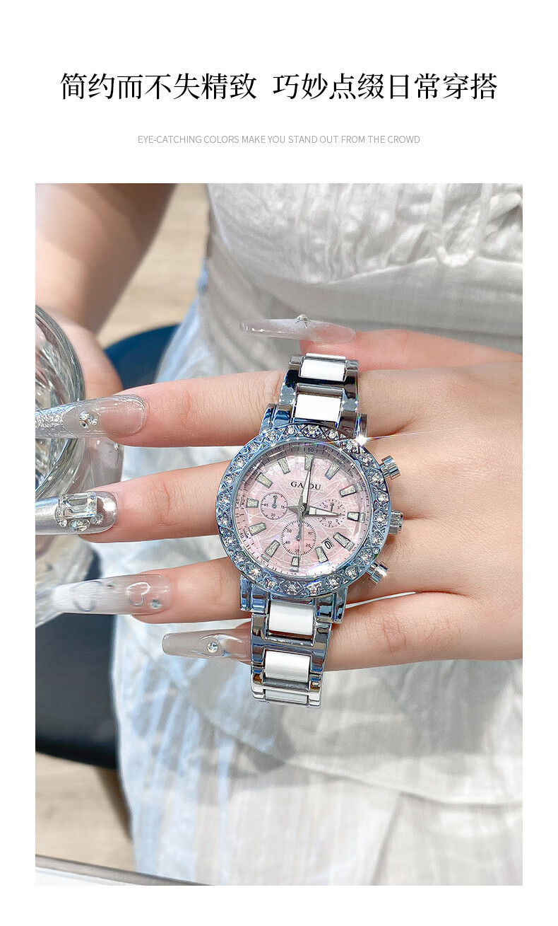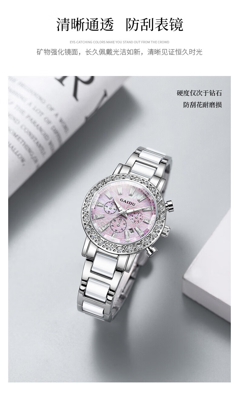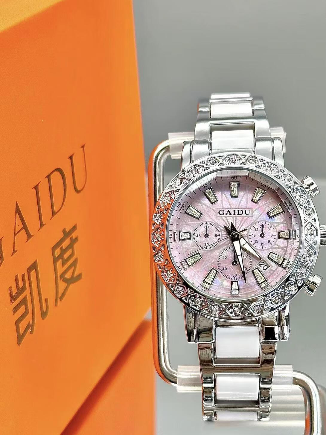 凯度(GAIDU)轻奢小众手表正品名牌时尚机械风镶钻陶瓷大表盘女士石英表礼物 陶瓷粉(送高档礼盒套装)