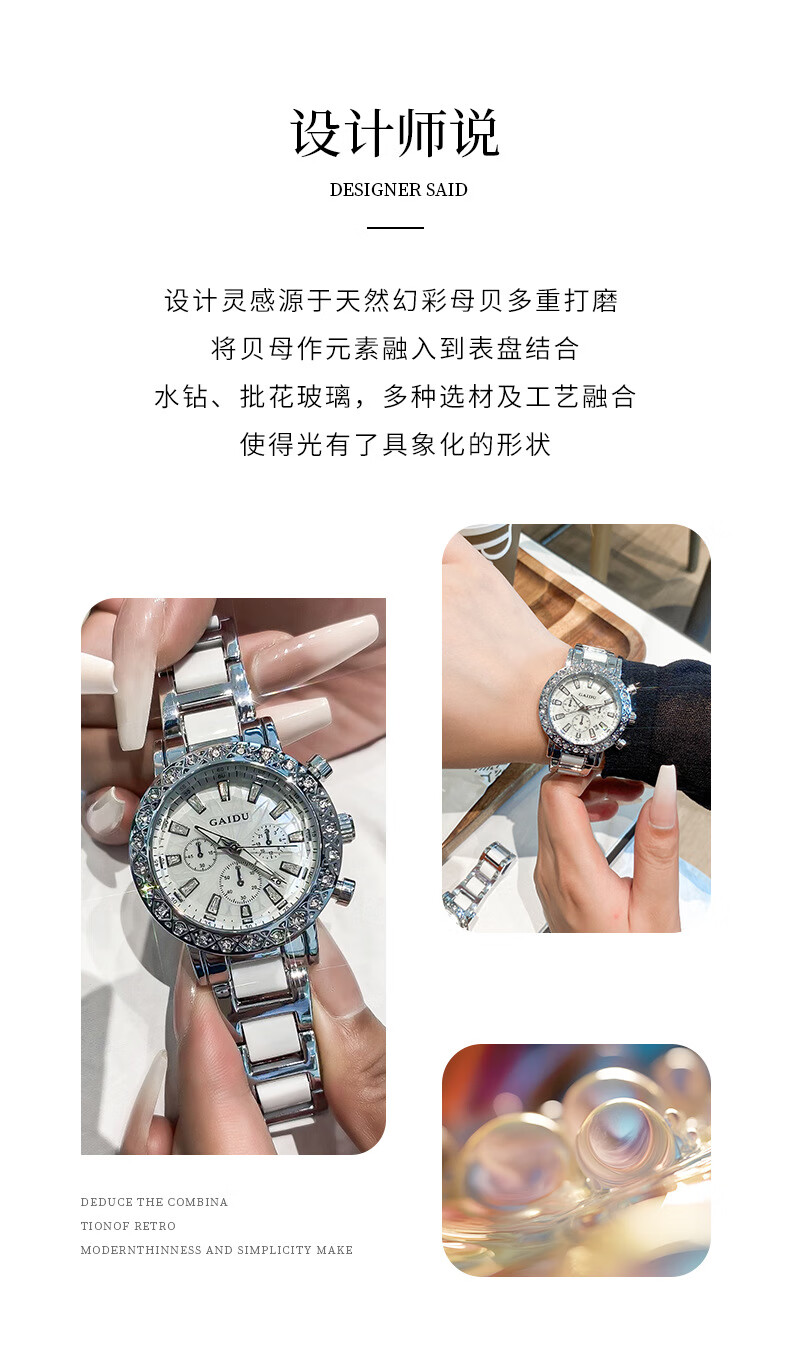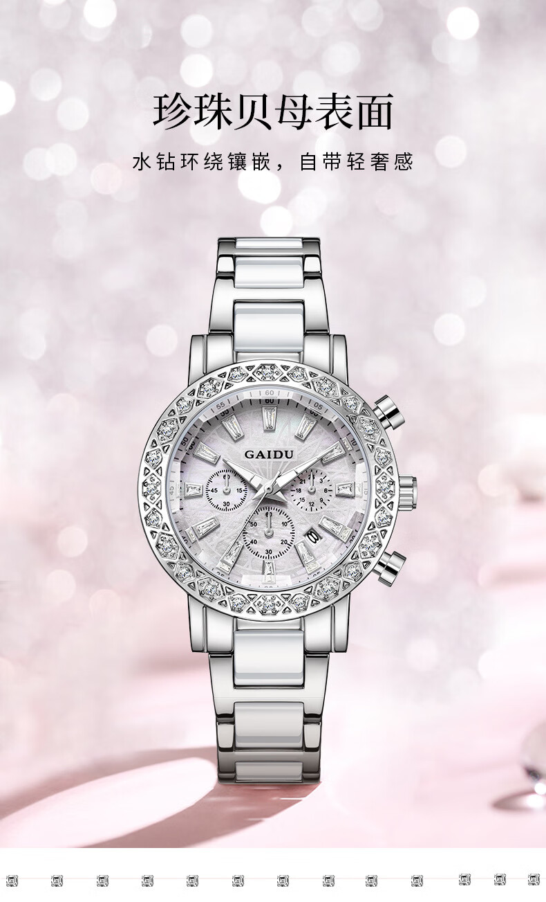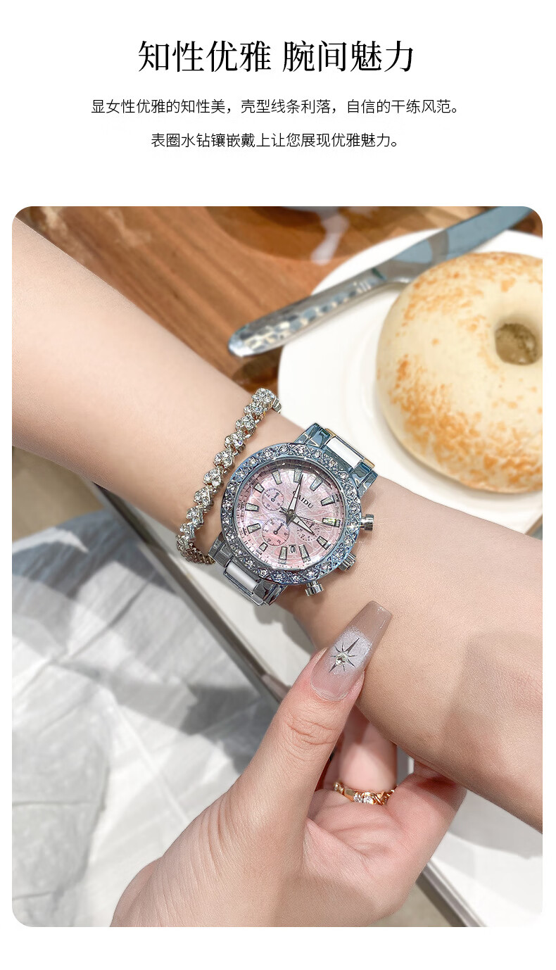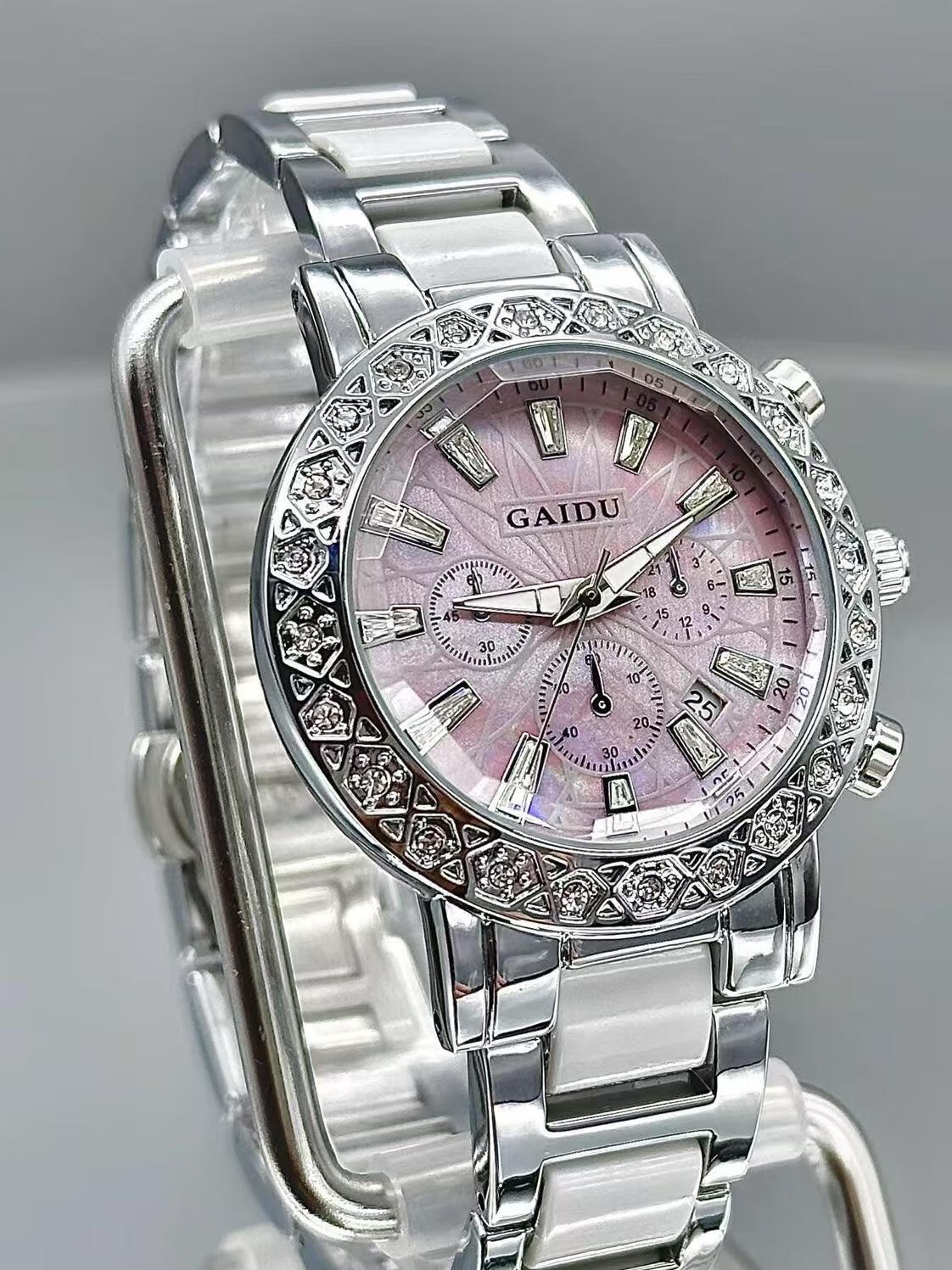凯度(GAIDU)轻奢小众手表正品名牌时尚机械风镶钻陶瓷大表盘女士石英表礼物 陶瓷粉(送高档礼盒套装)