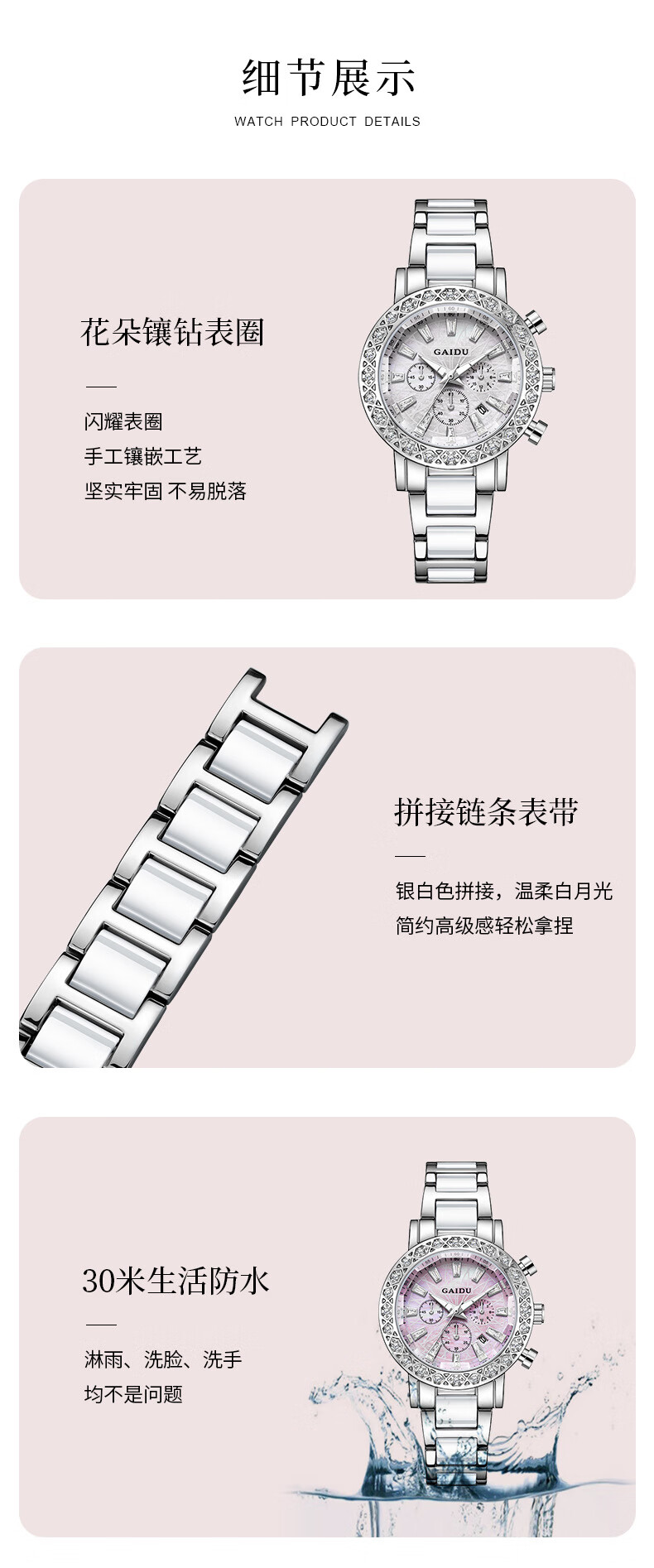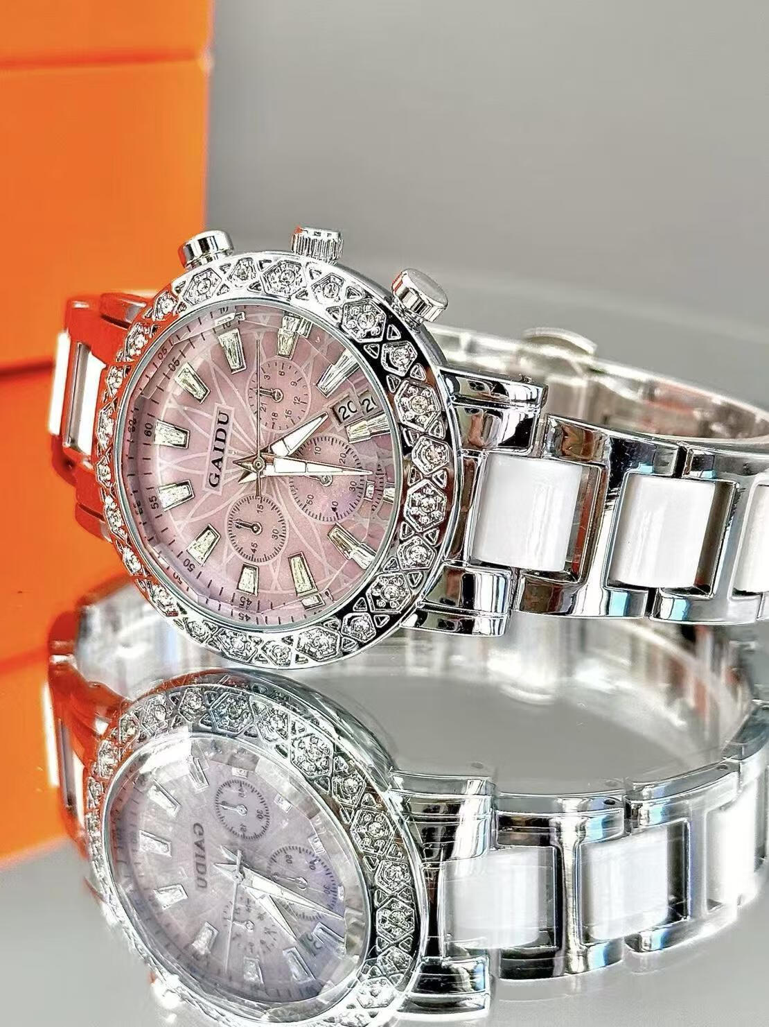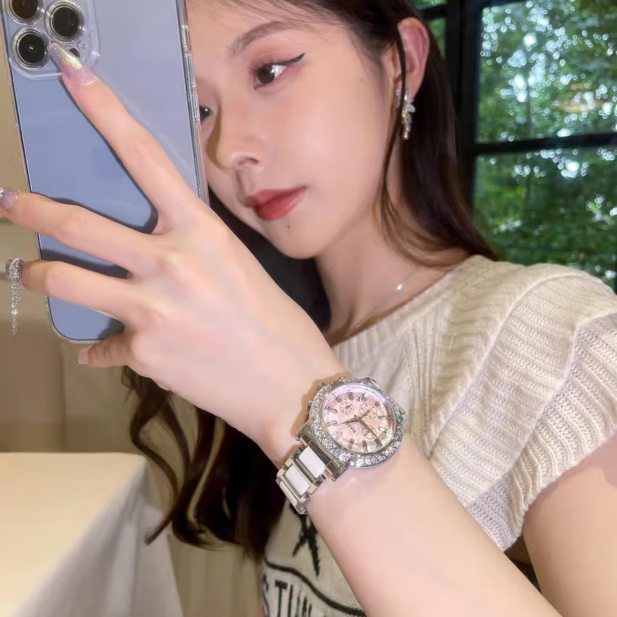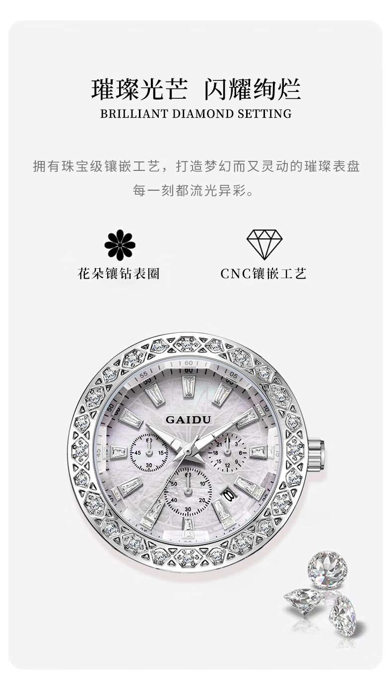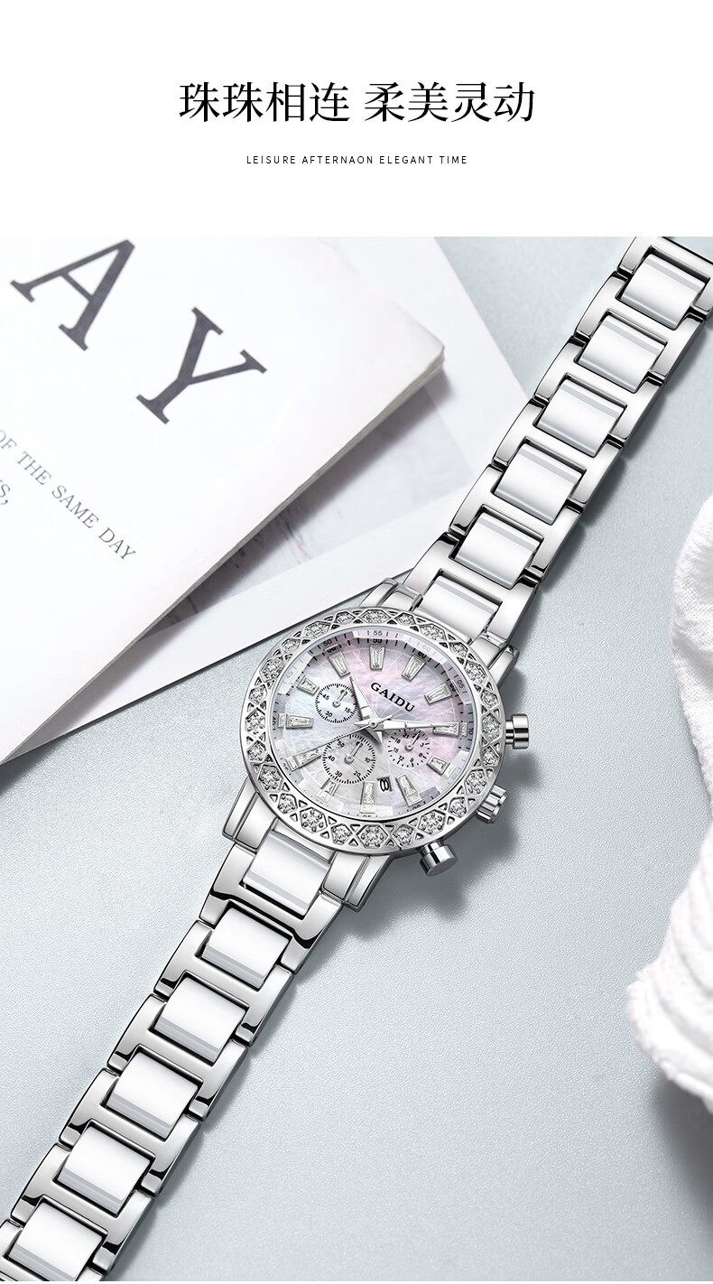 凯度(GAIDU)轻奢小众手表正品名牌时尚机械风镶钻陶瓷大表盘女士石英表礼物 陶瓷粉(送高档礼盒套装)