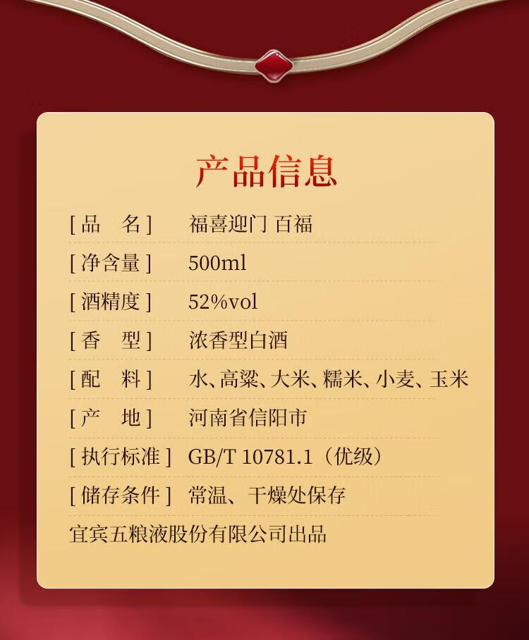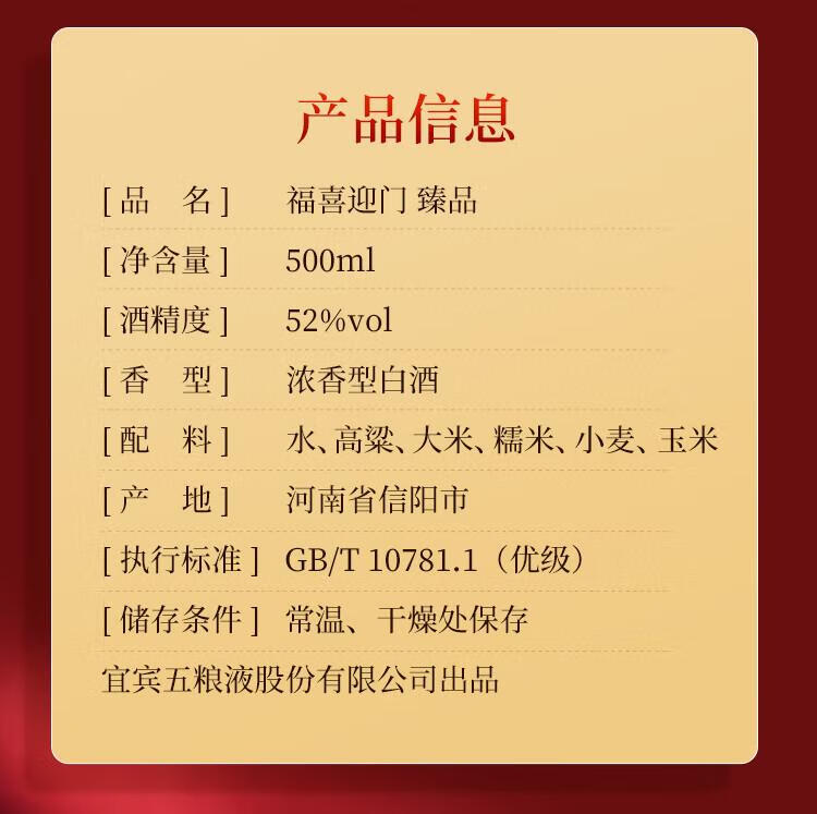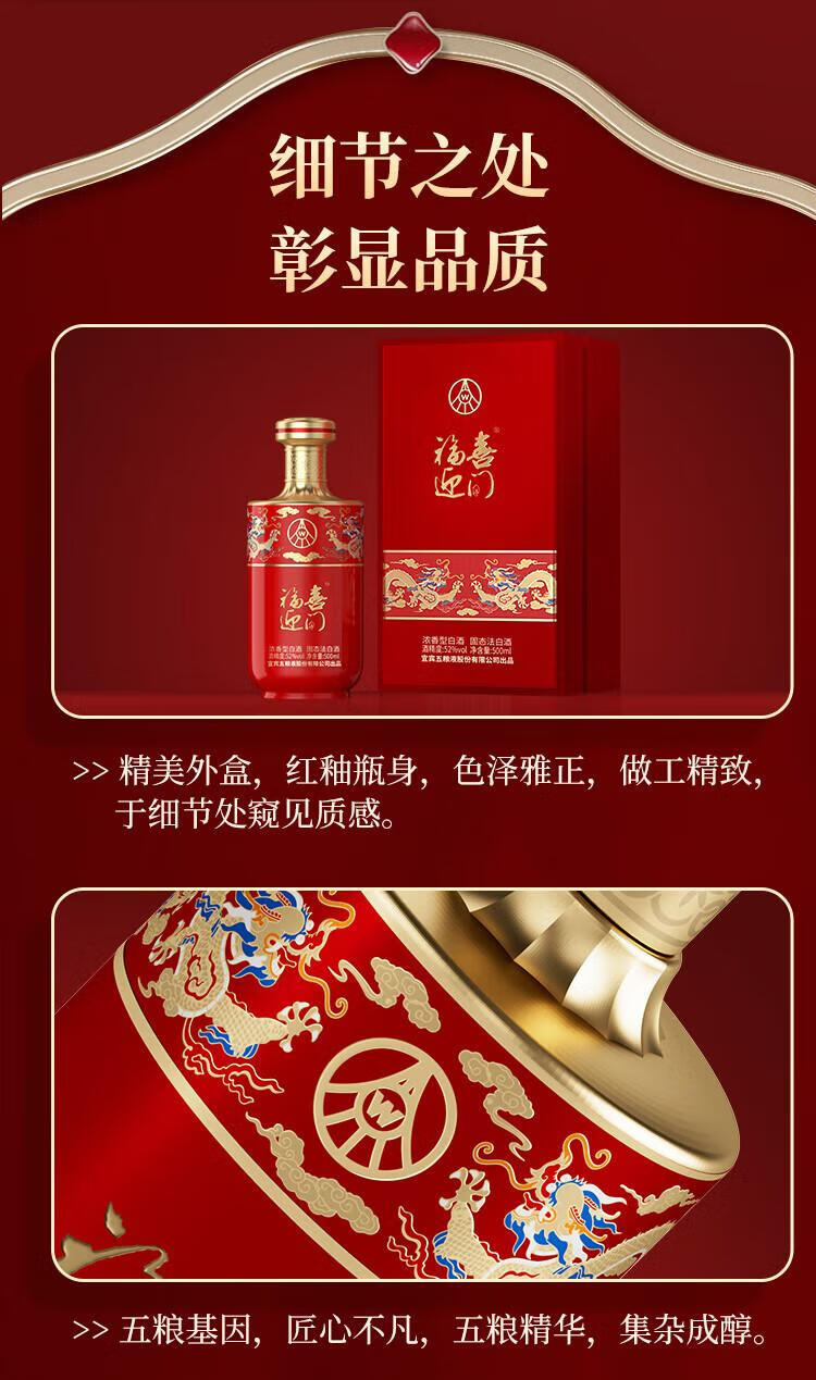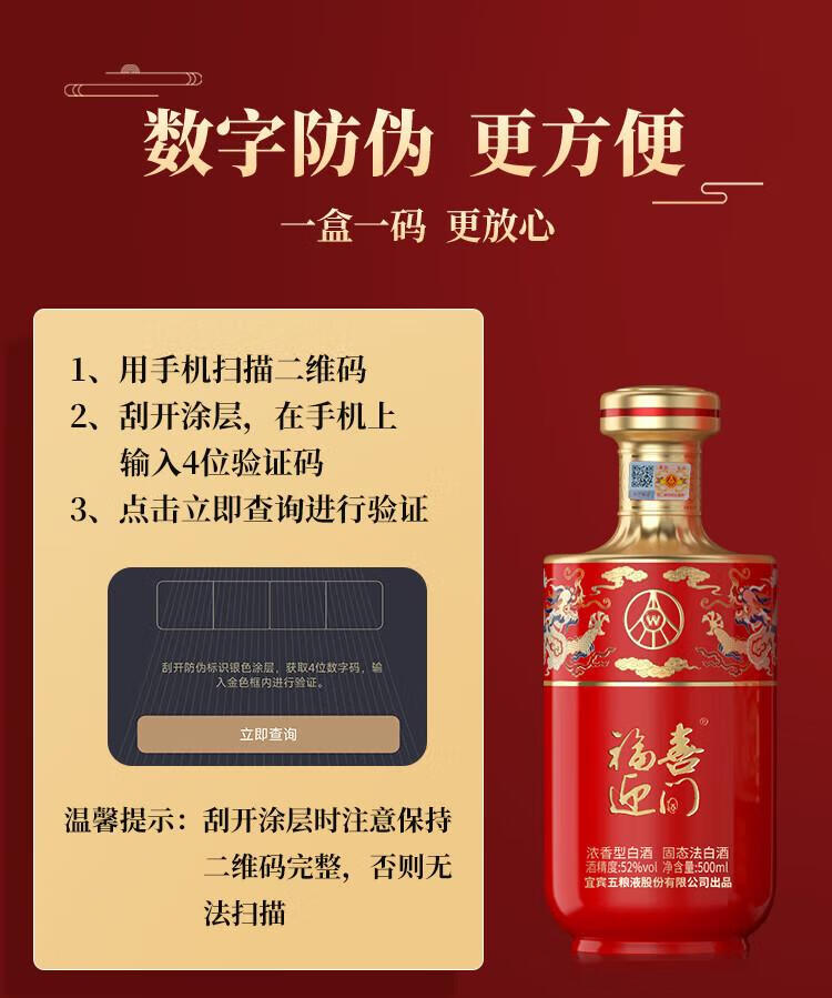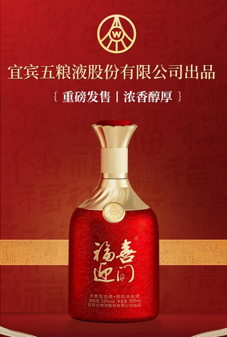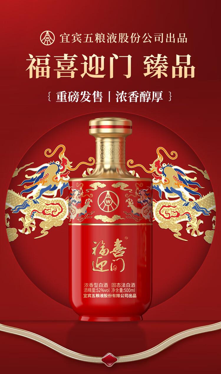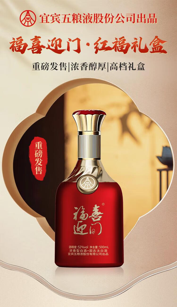 五粮浓香【五粮液出品】 福喜迎门 粮食酒浓香型白酒 送礼宴饮 52度 500mL 2瓶 臻选红双瓶