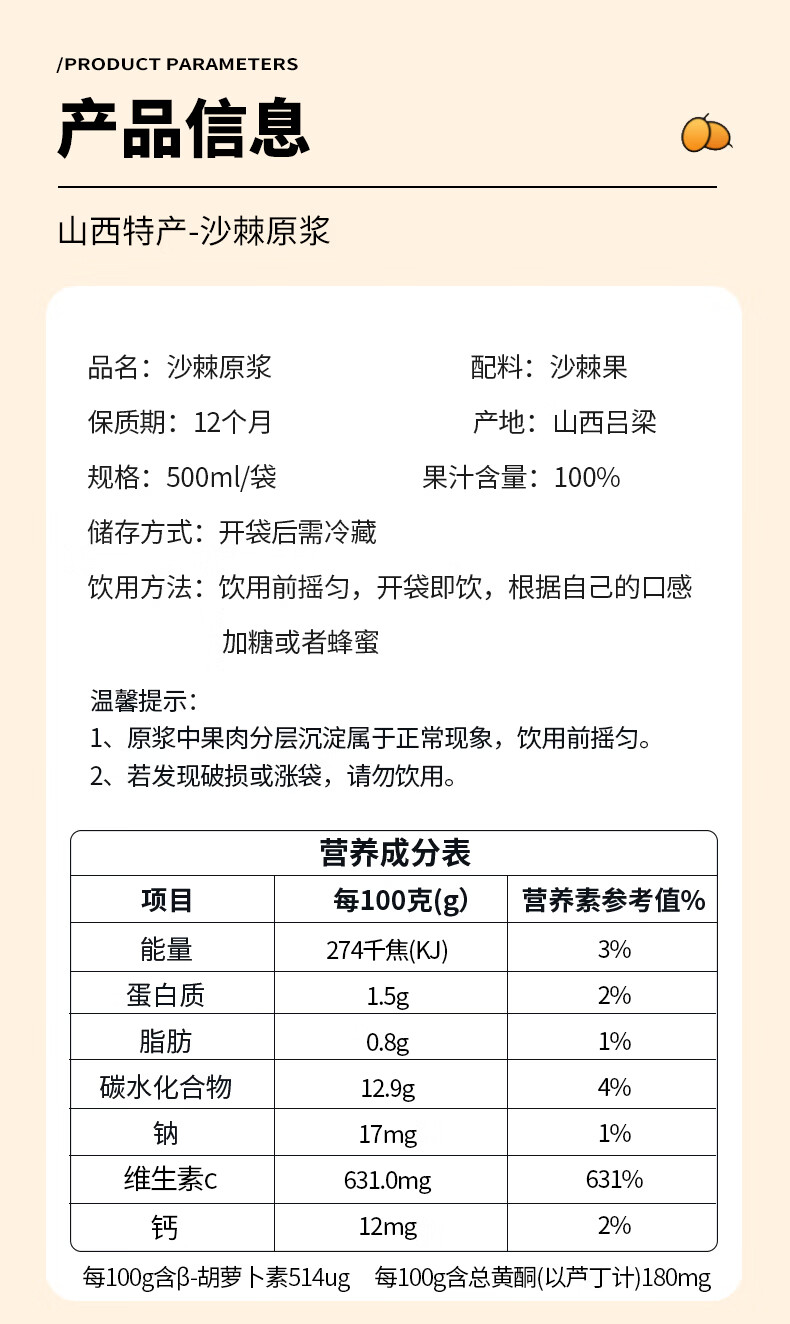 山西沙棘原浆原滋原味丰富果油酸甜可口 500g*1袋