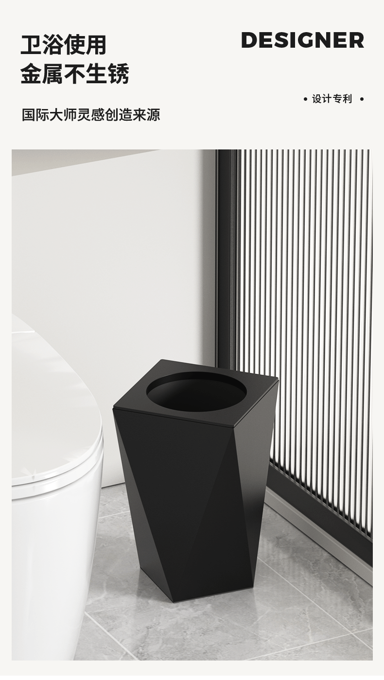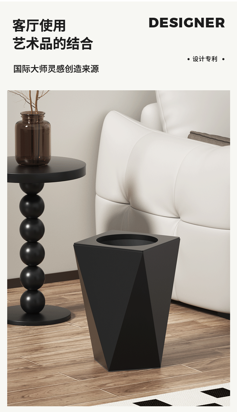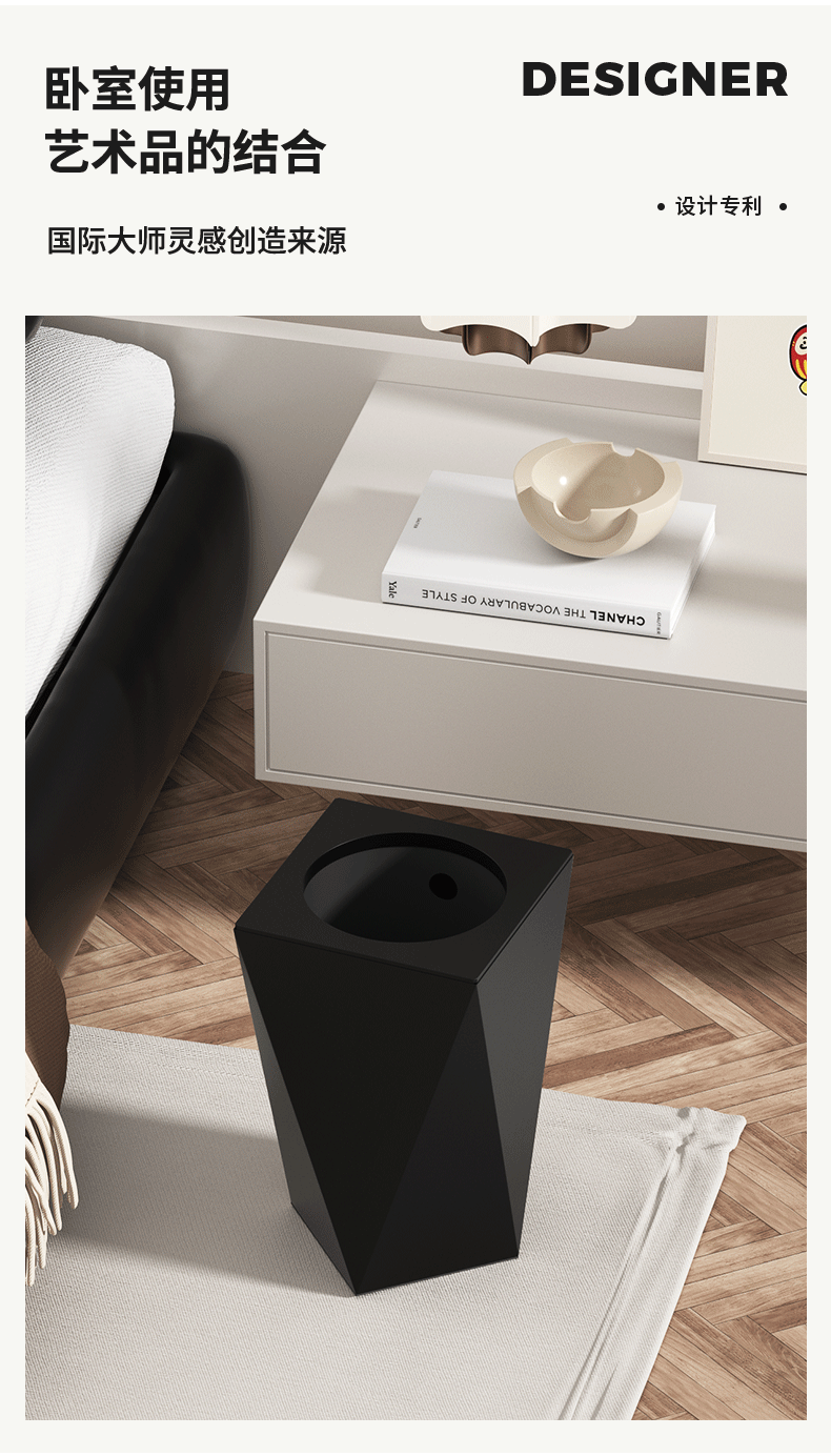科灵创意菱形垃圾桶家用客厅卧室卫生间厕所高档酒店商用纸篓多边无盖 【2025新升级木纹压圈】 质感黑/ 木纹压圈款- 10L