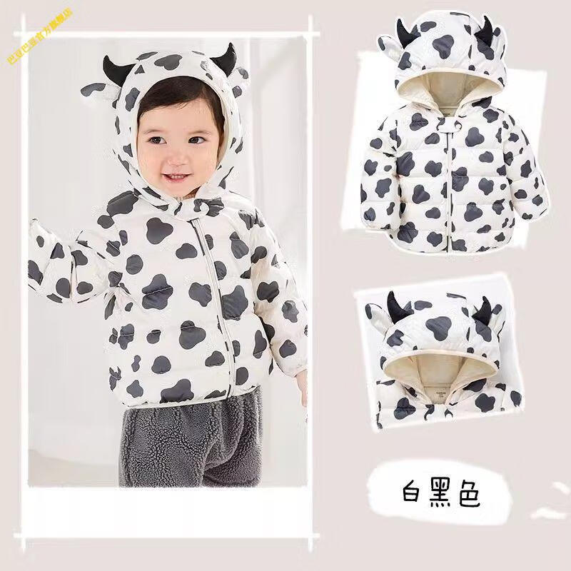 G.duck小黄鸭宝宝羽绒服男女童婴幼儿2025秋冬新款轻薄外套防风保暖白鸭 黑白蓝色调 奶牛印花 110 【建议身高85-95cm】