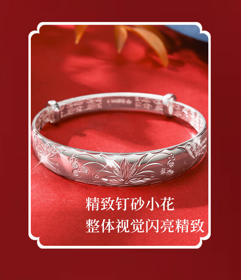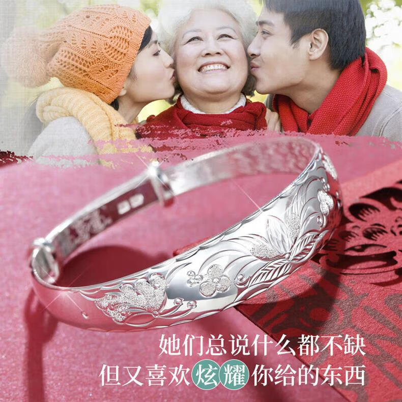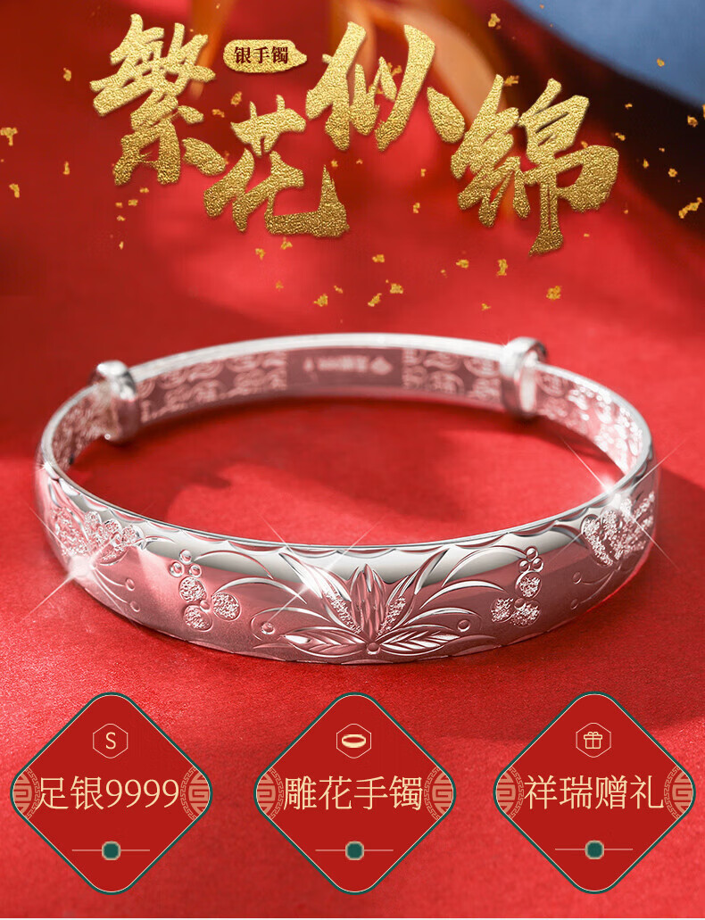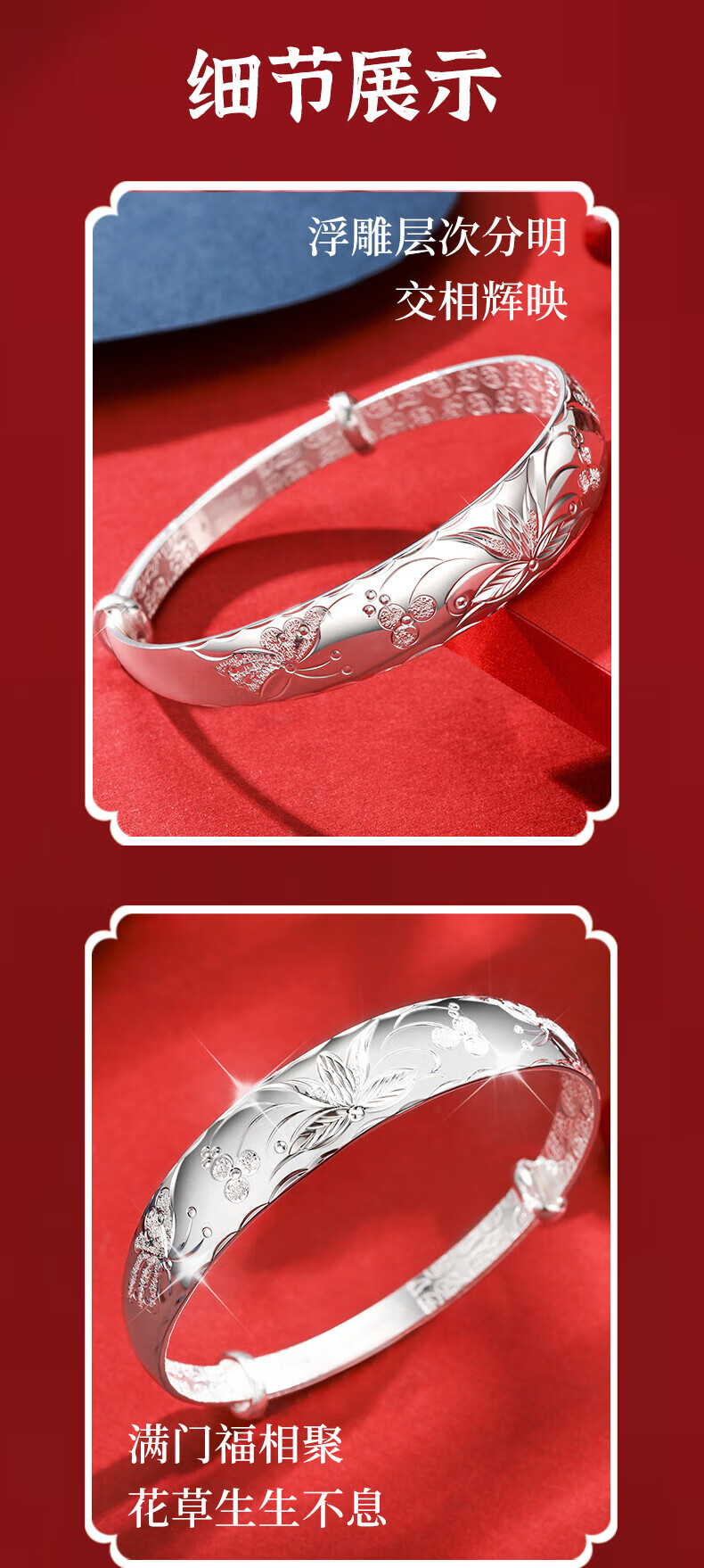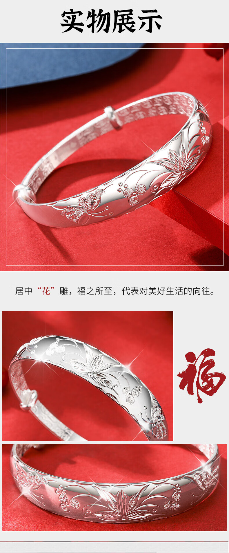 妈妈款银手镯女繁花似锦9999足银实心银镯子送奶奶丈母娘 蓬莲心经古法25(证书+礼盒