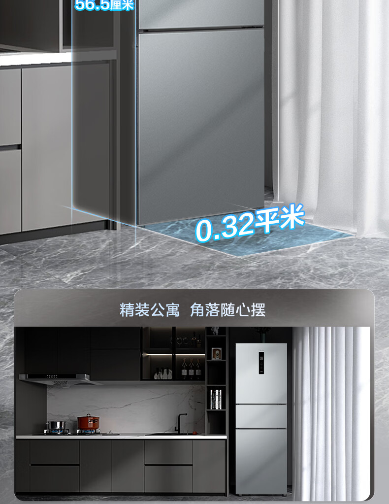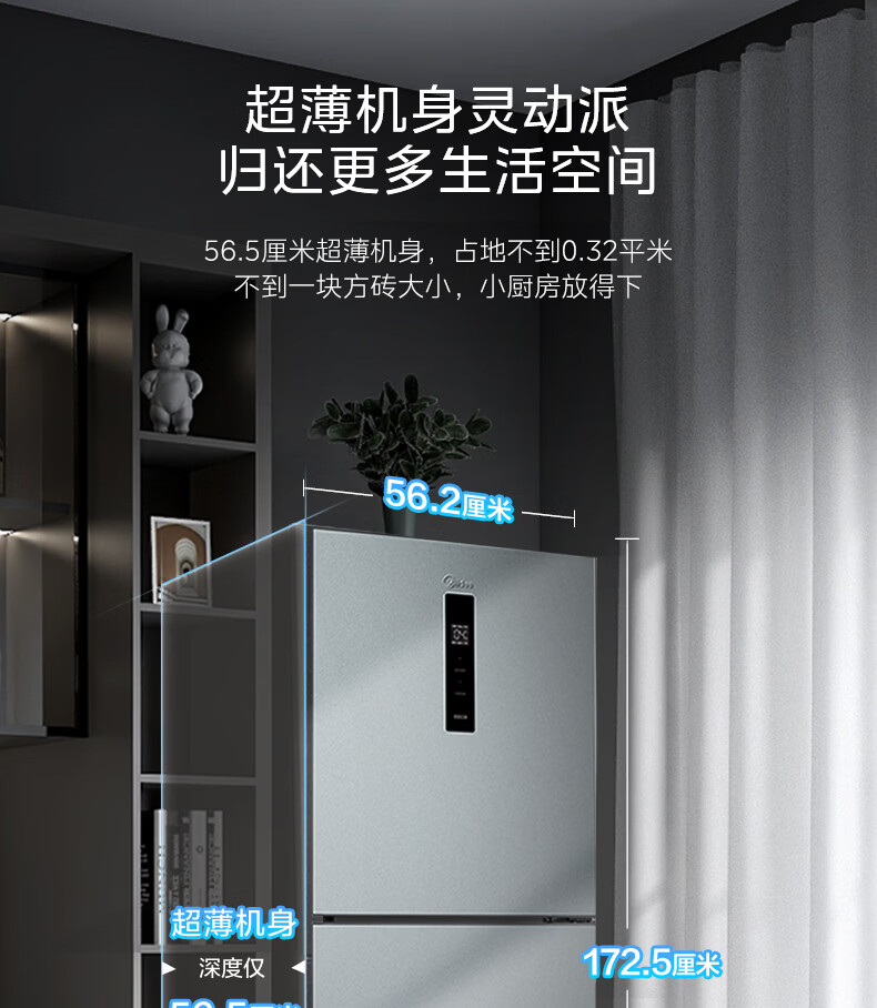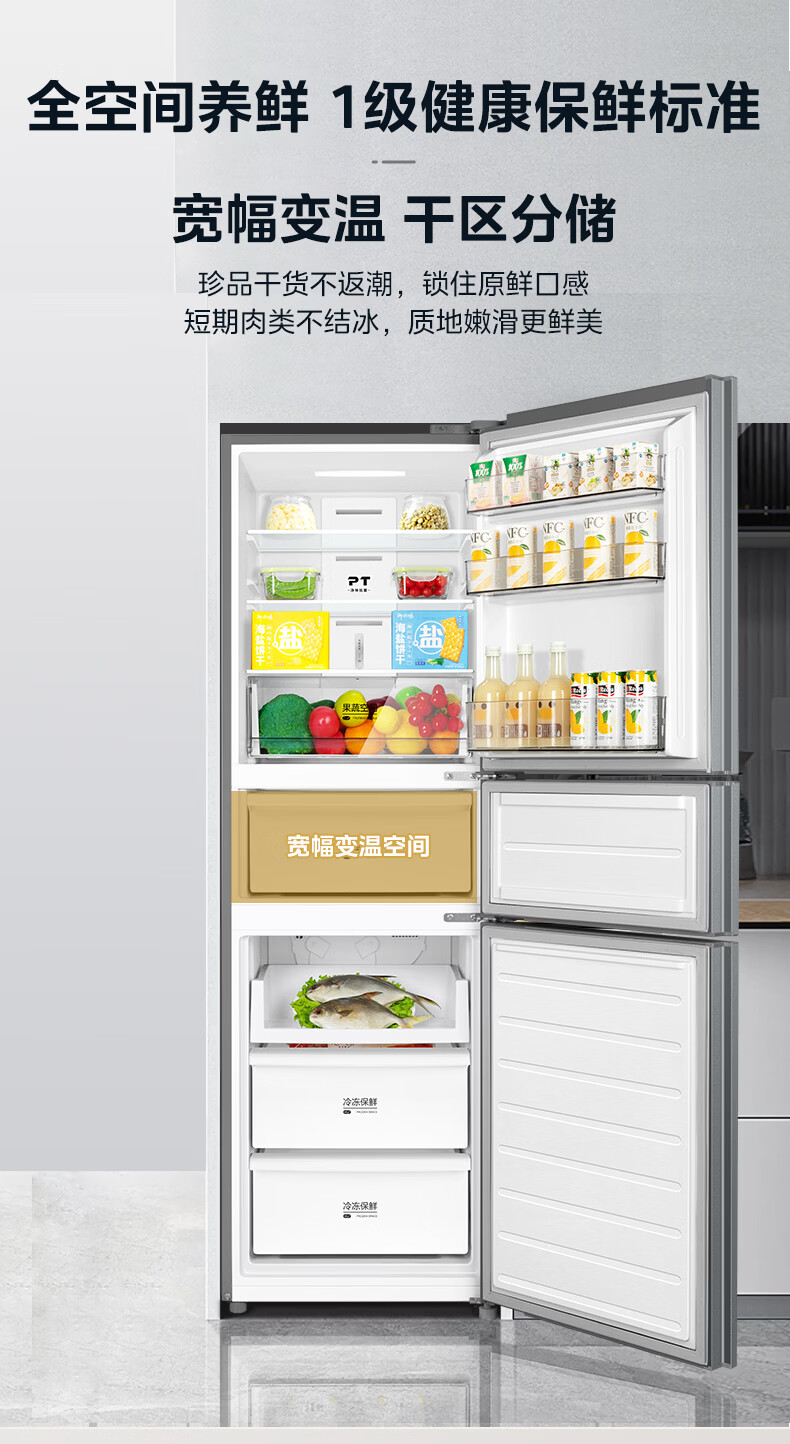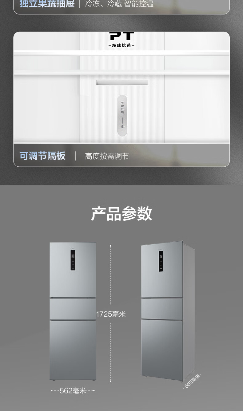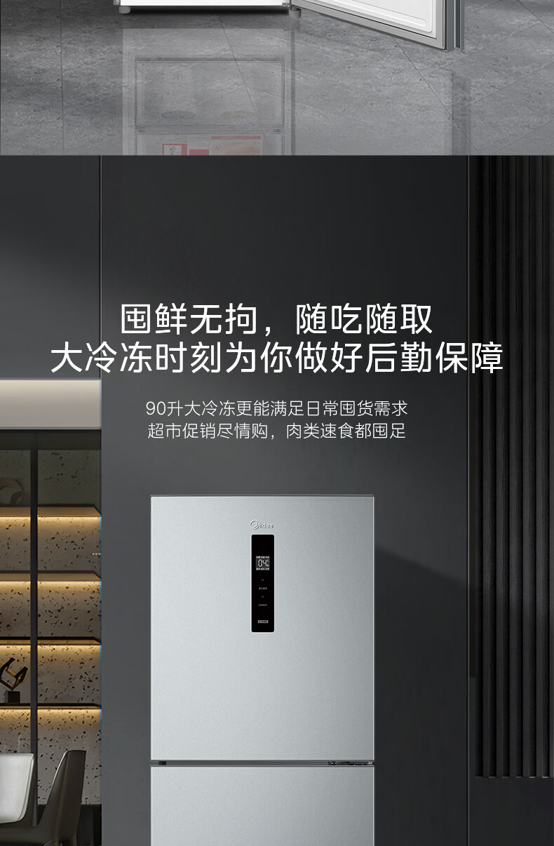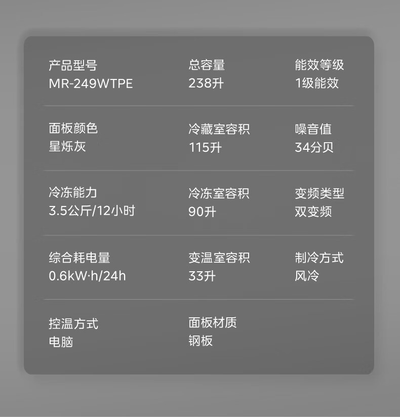 美的(Midea)238升三门冰箱灰色小型风冷家用变频一级能效宿舍租房以旧换新小冰箱MR-249WTPE【国家补贴】