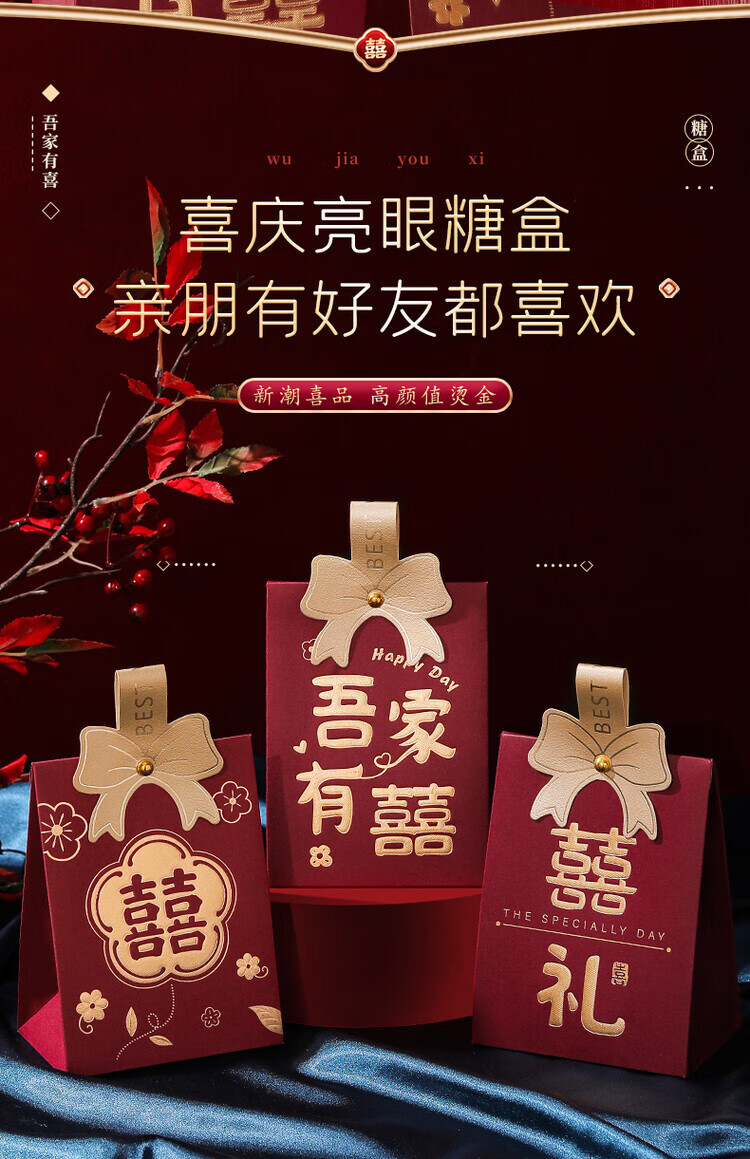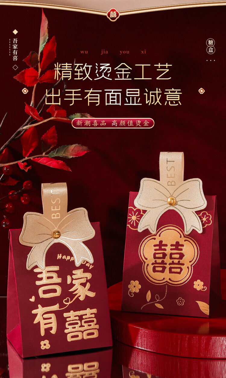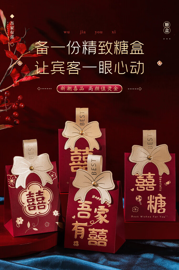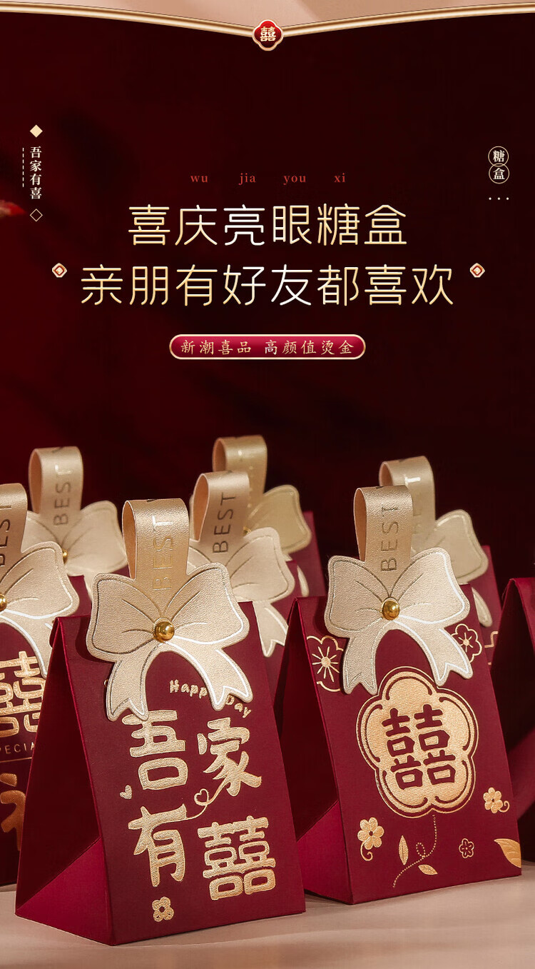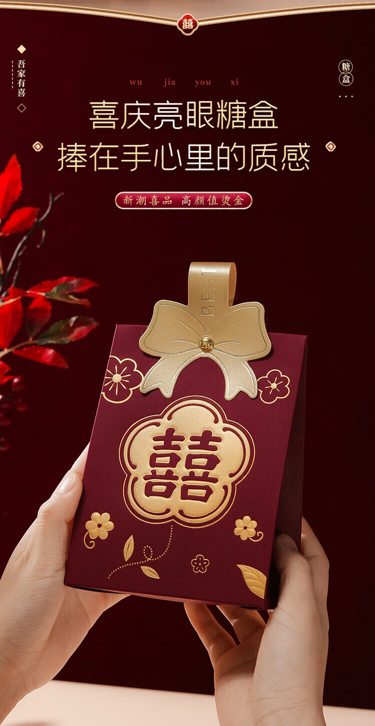OYKTN结婚喜糖盒子2026新款婚礼高级伴手礼盒空盒包装盒订婚手提糖果袋 酒红磨砂B【囍-百年好合】 小号【10个】