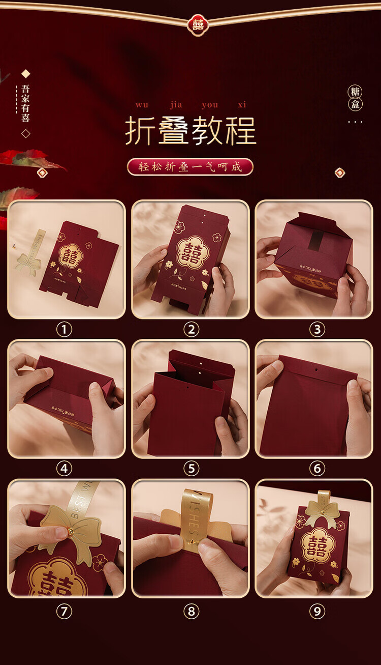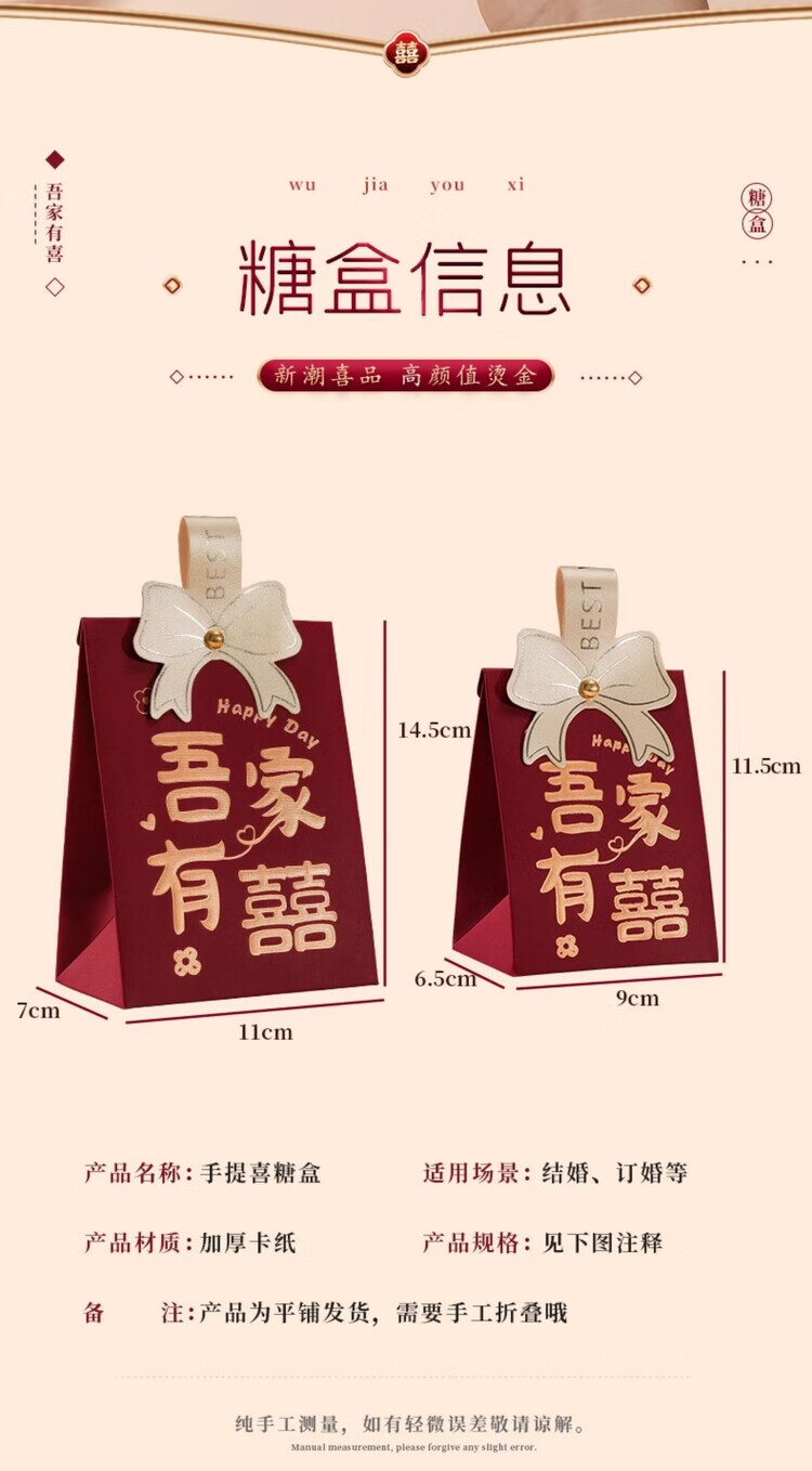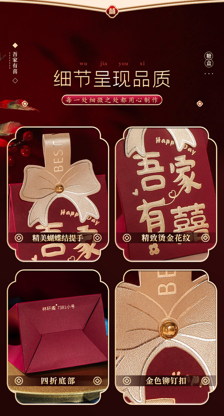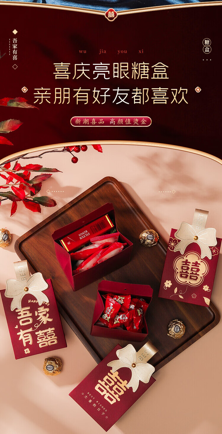 OYKTN结婚喜糖盒子2026新款婚礼高级伴手礼盒空盒包装盒订婚手提糖果袋 酒红磨砂B【囍-百年好合】 小号【10个】