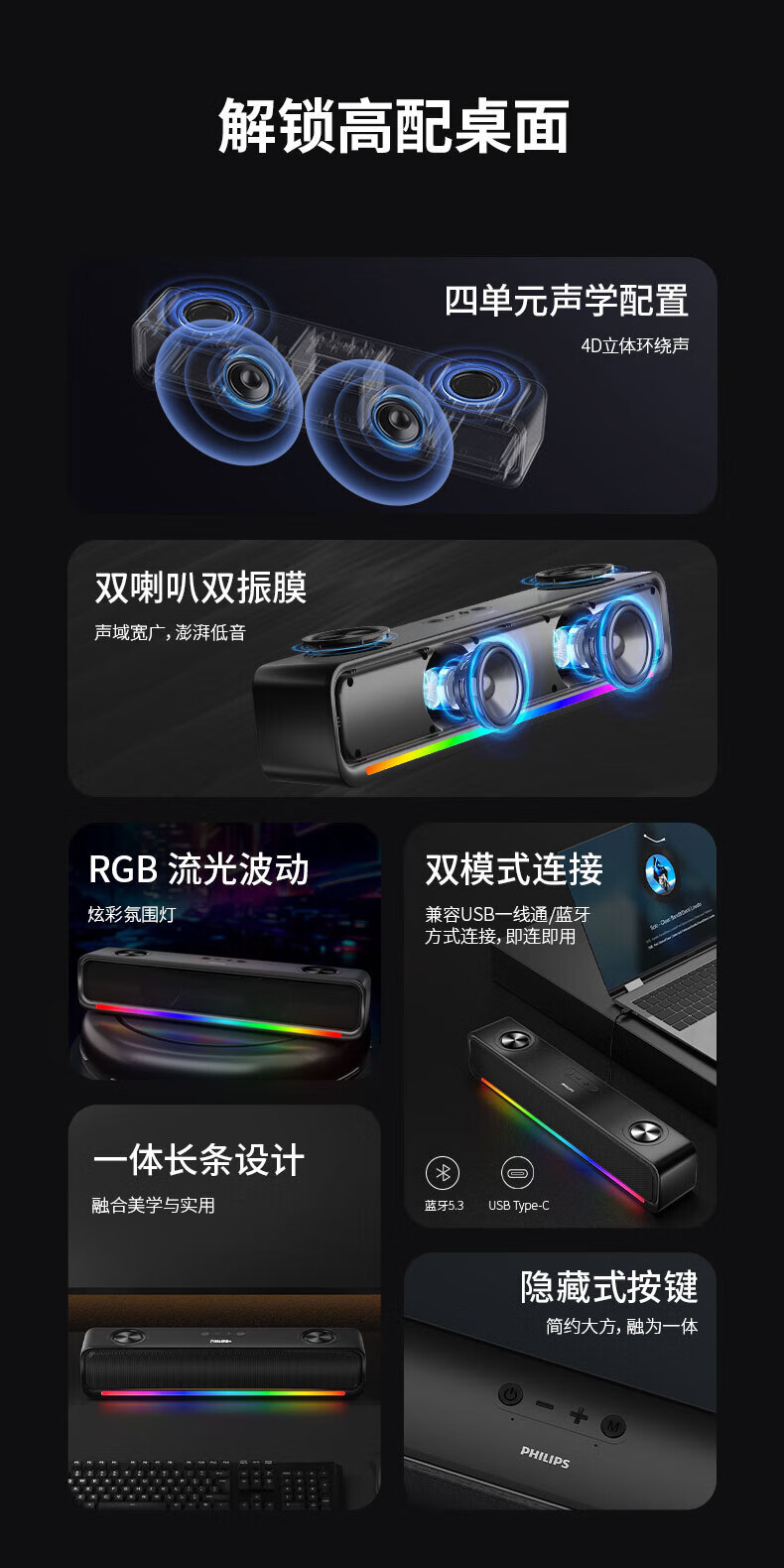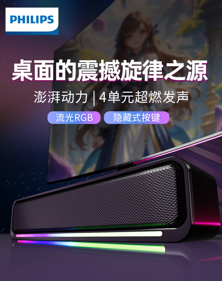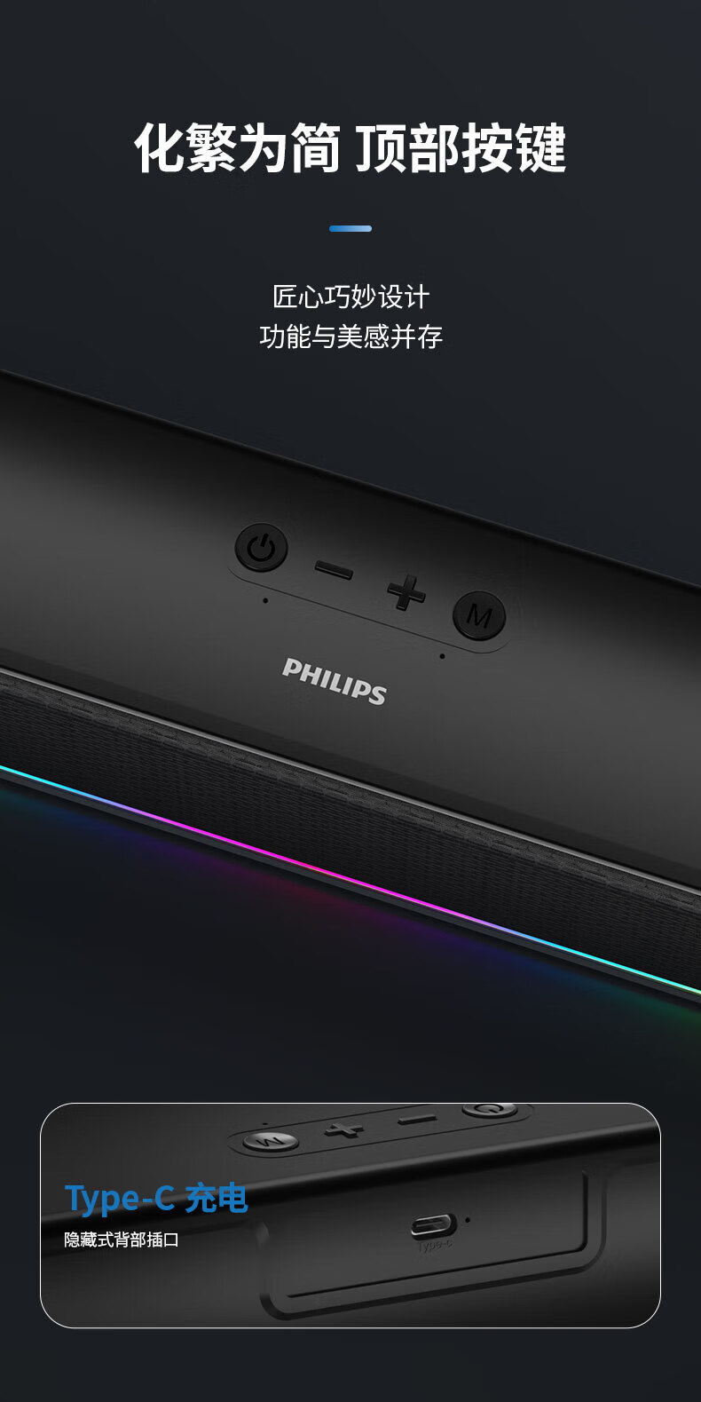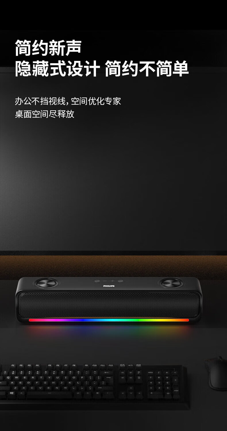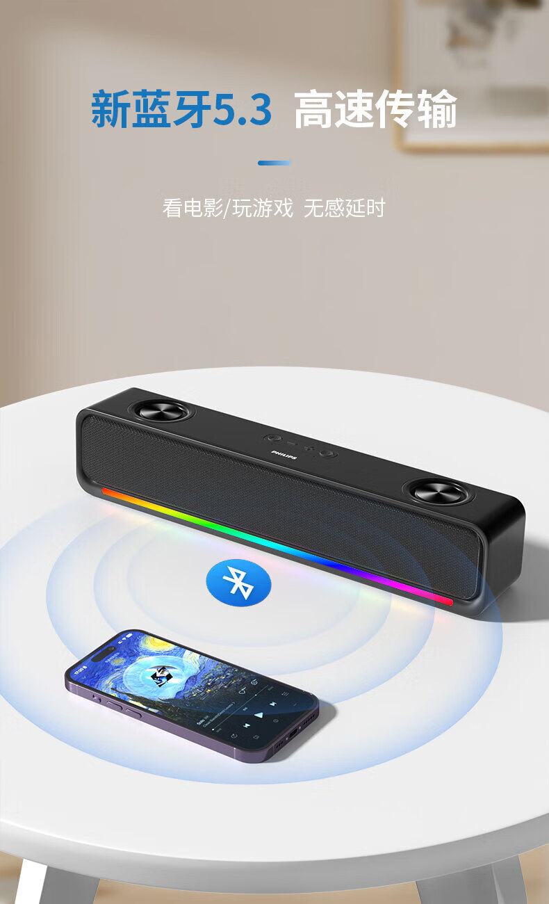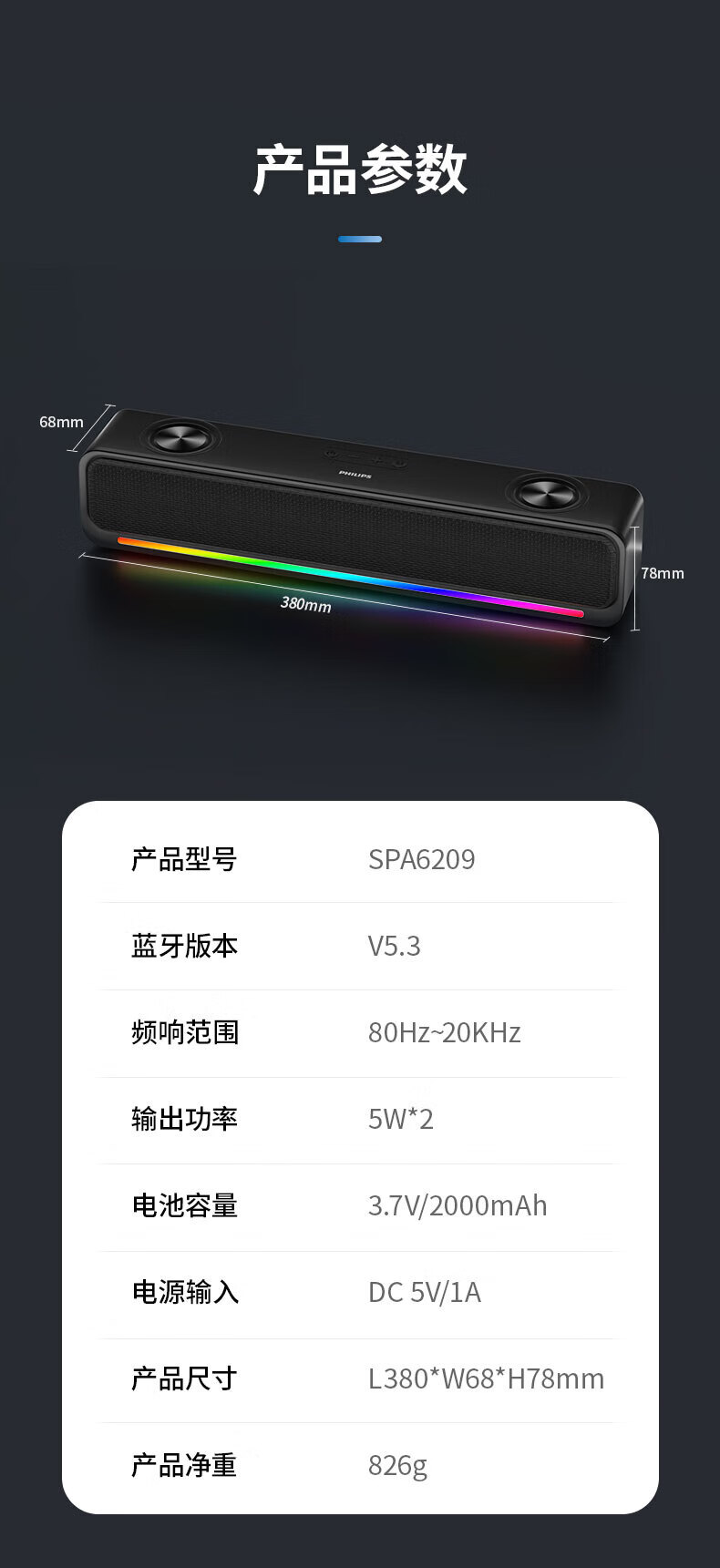 飞利浦(PHILIPS)蓝牙音响 SPA6209 电脑音响 HiFi音质重低音炮RGB炫彩氛围灯笔记本台式双模双喇叭立体音便携音箱 木制音响音响有线/蓝牙双模