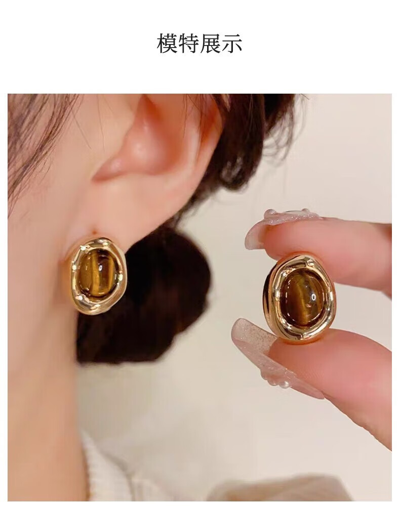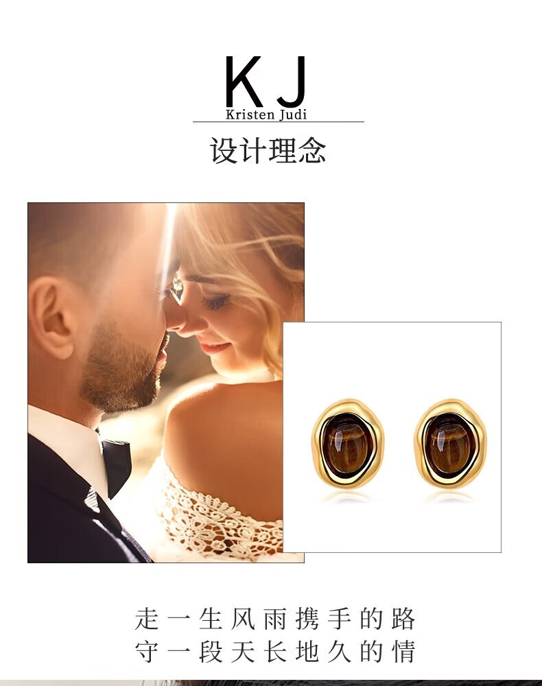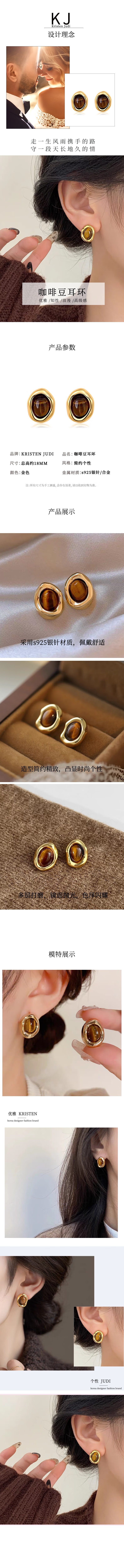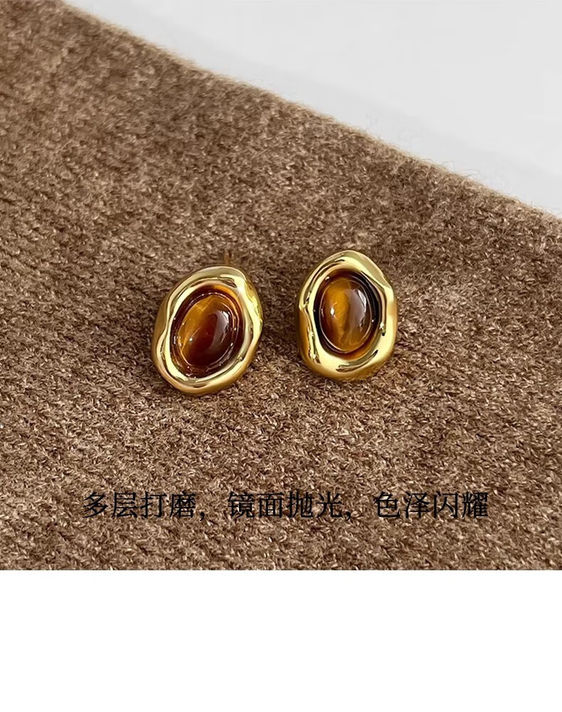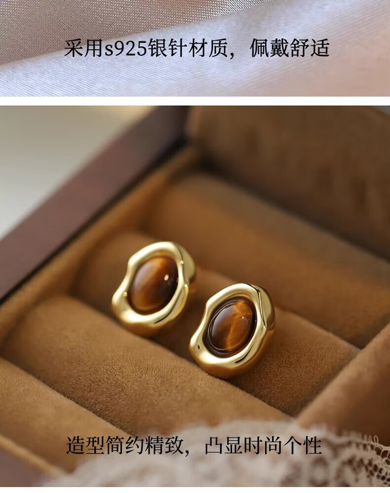 KRISTEN JUDI美拉德虎眼石耳环女银针耳钉新款几何椭圆复古轻奢耳饰品生日礼物 耳环女友老婆闺蜜生日实用礼盒 金色纪念日礼盒包装