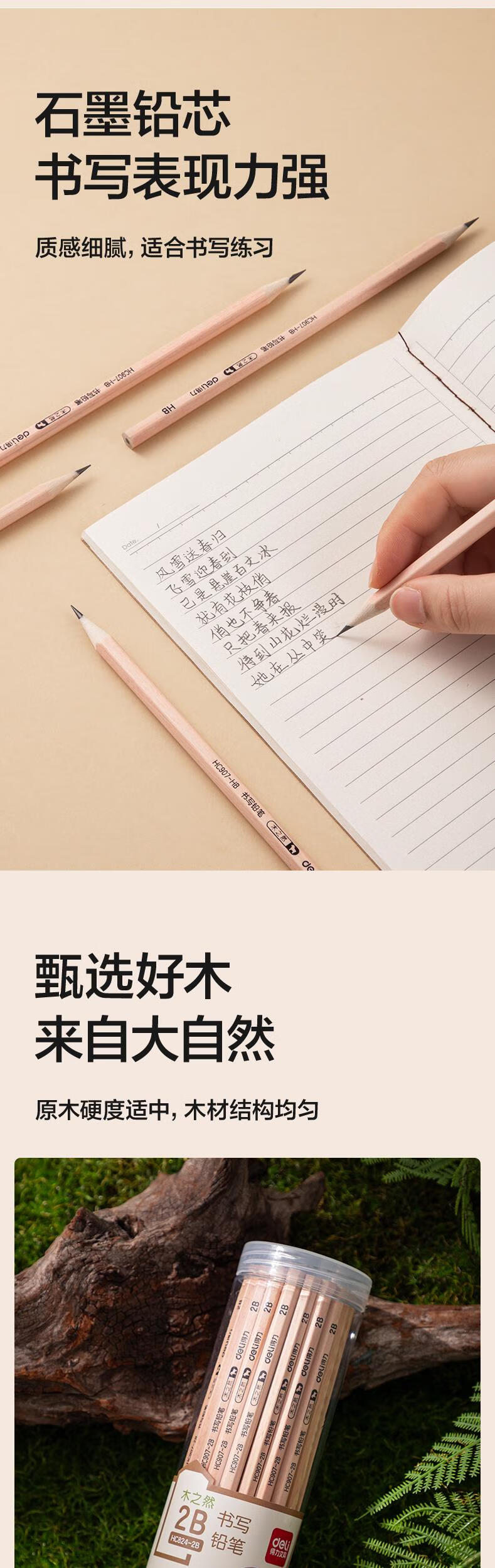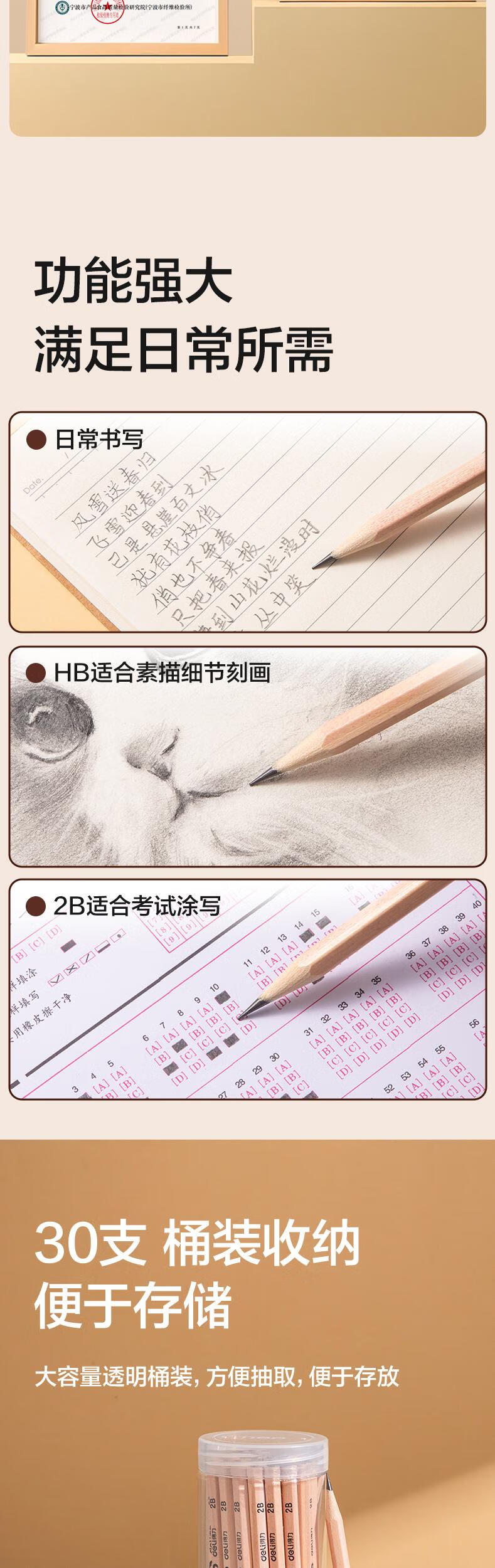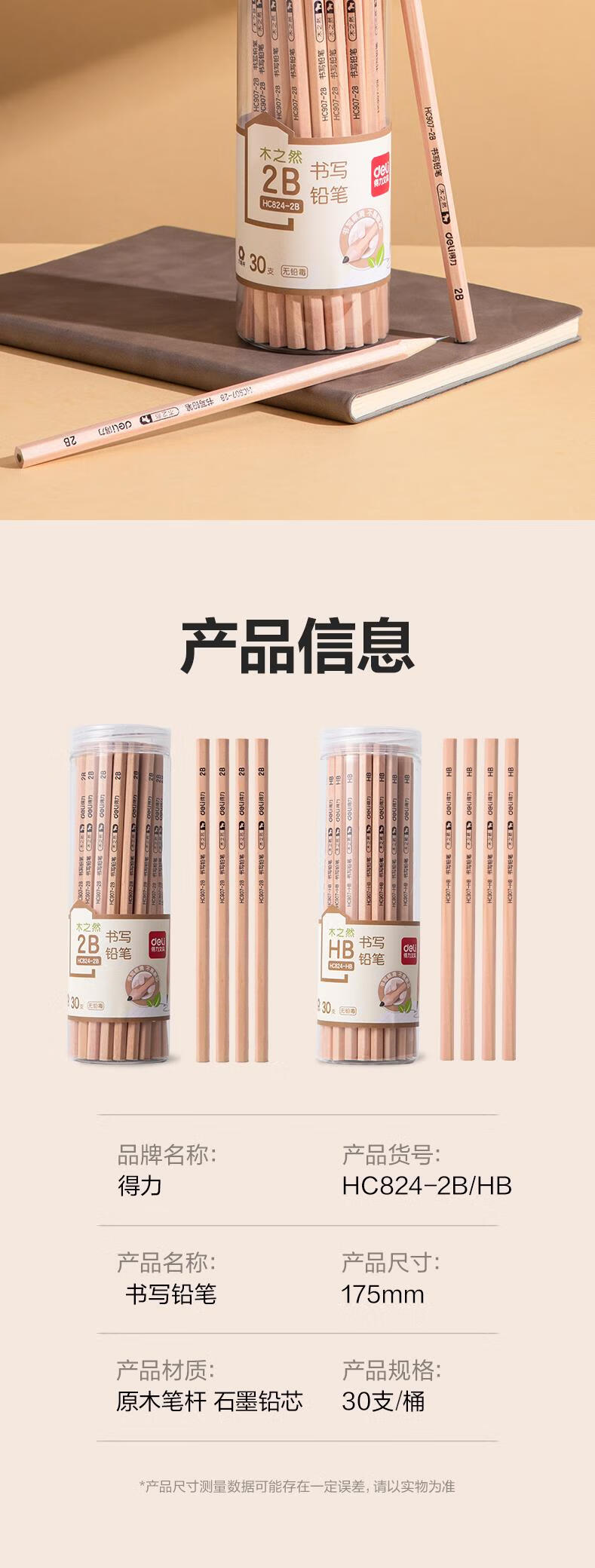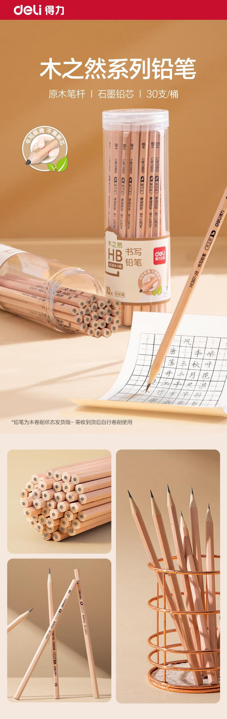 得力(deli)30支2B原木书写铅笔六角杆素描绘图学生铅笔考试涂鸦绘画临摹30支/桶HC824-2B学生开学文具