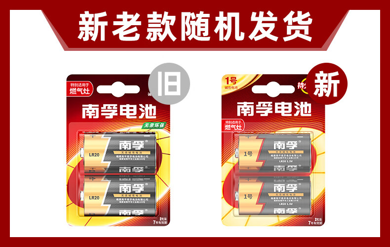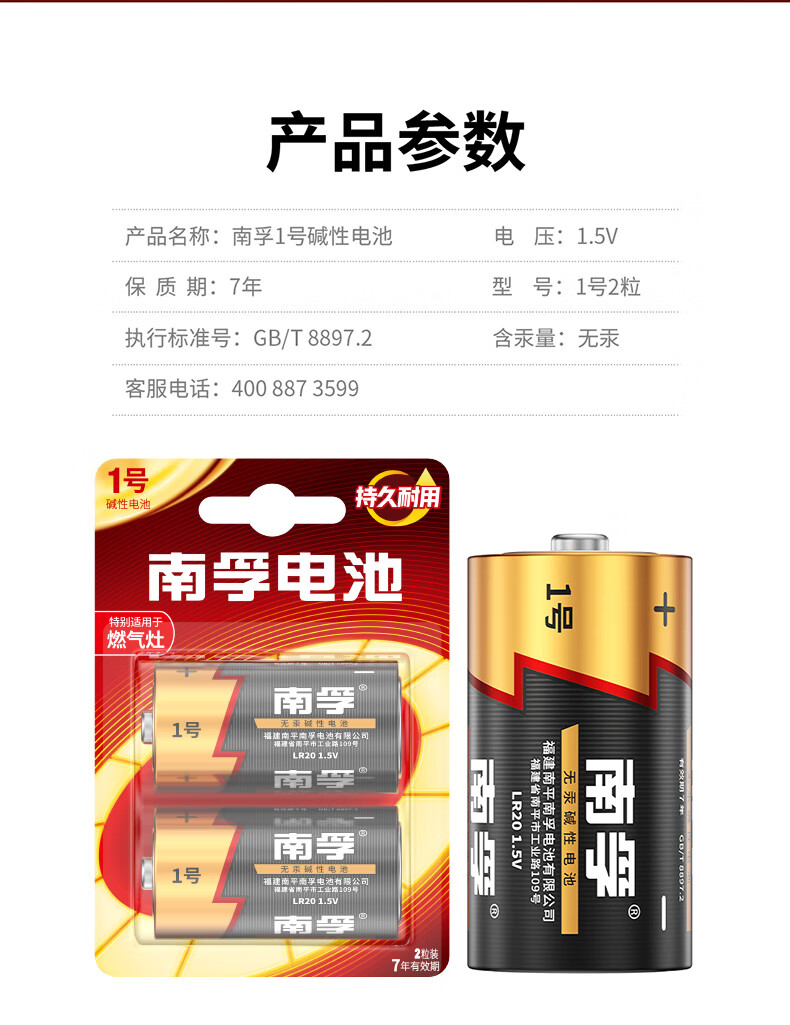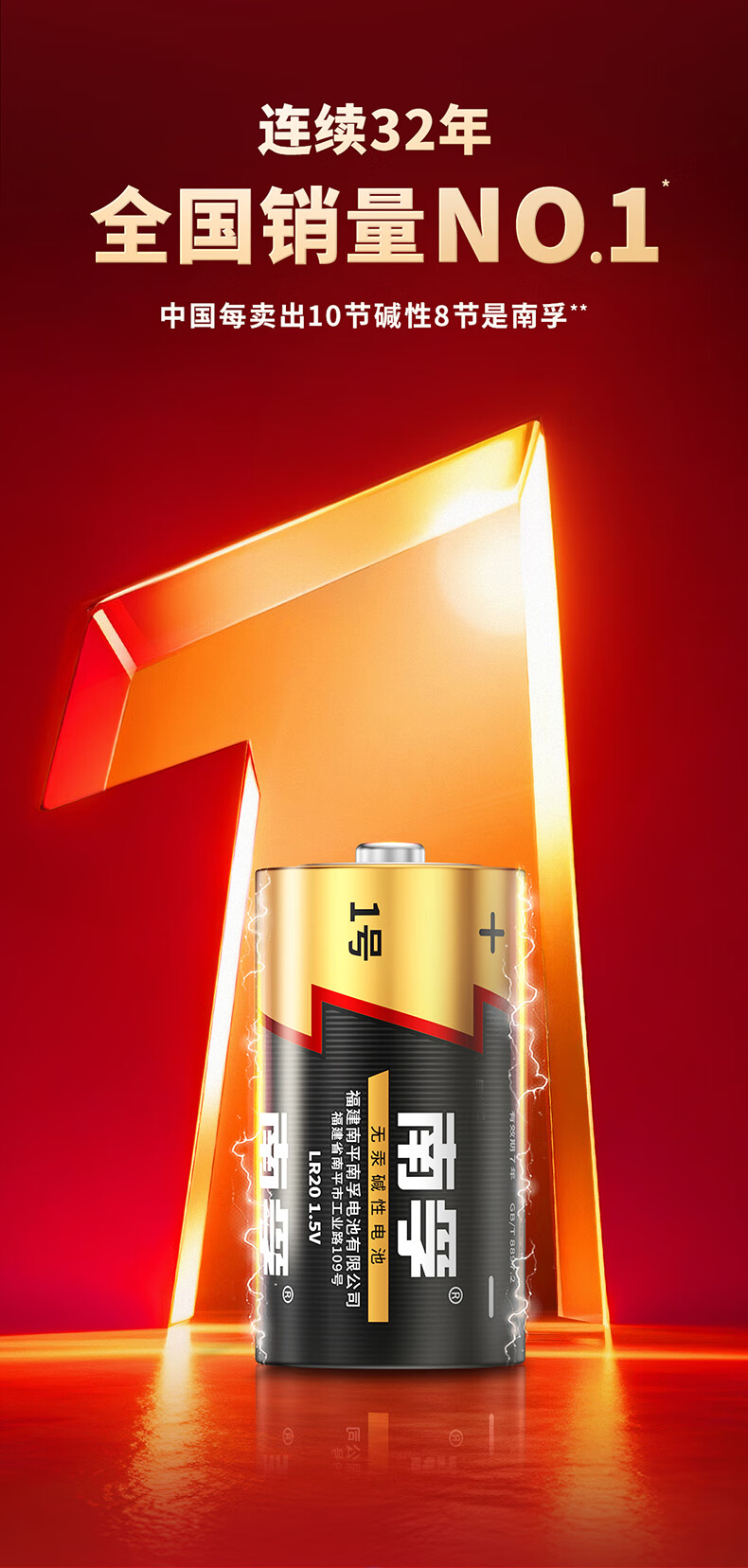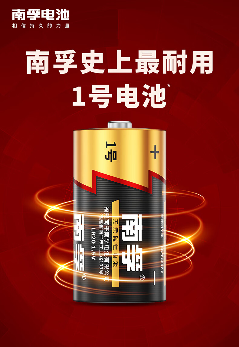 南孚1号碱性电池2粒 大号电池 适用于热水器/煤气燃气灶/手电筒/电子琴/挂钟等 LR20-2B
