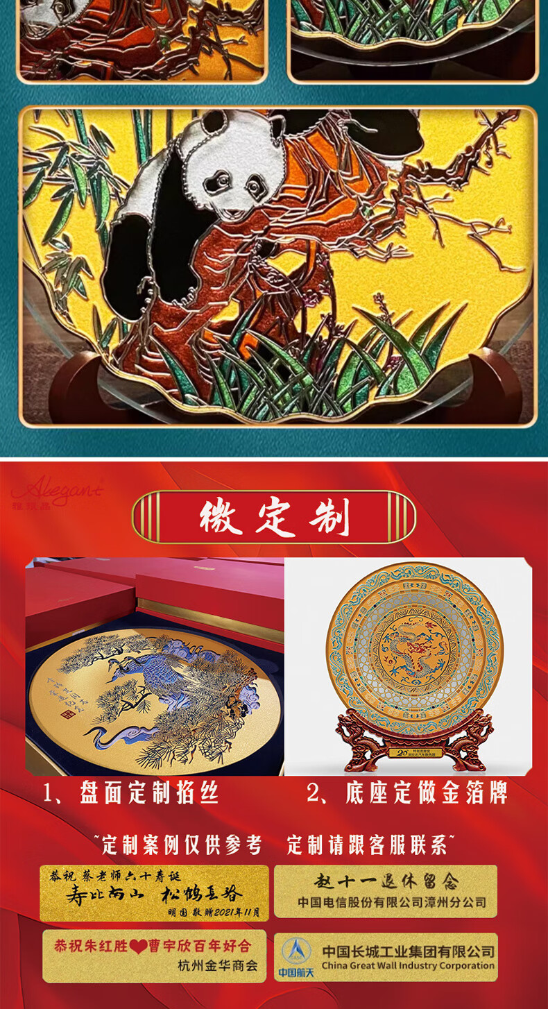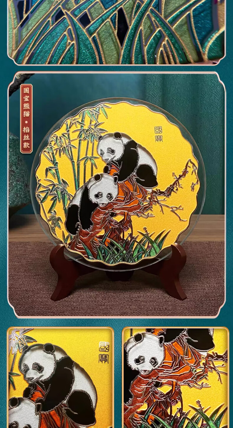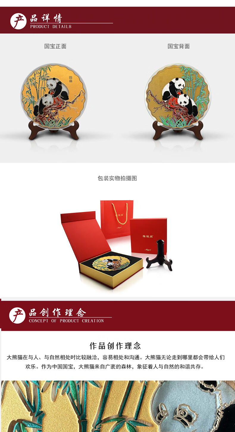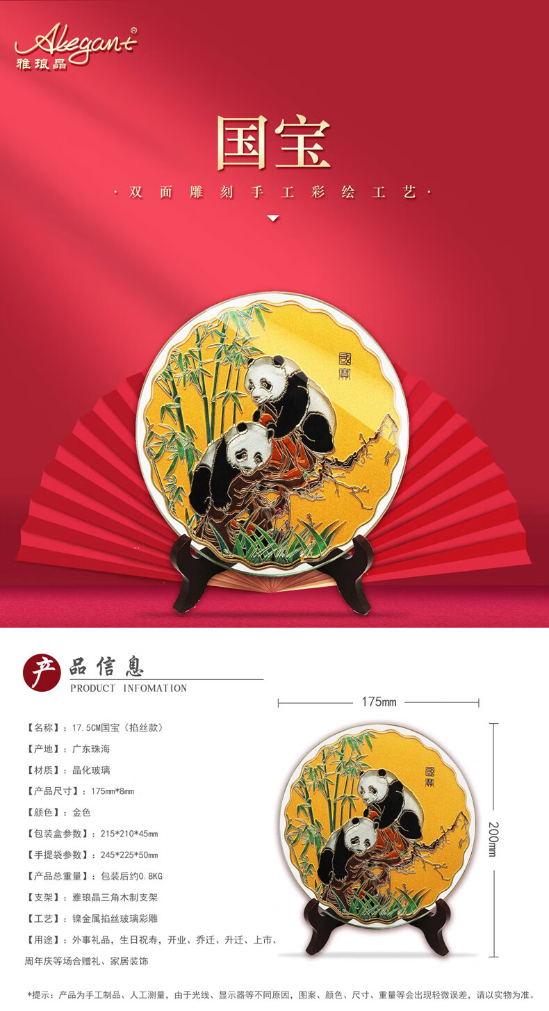 雅琅晶国宝熊猫摆件中国特色桌面工艺创意礼物办公室玄关装饰伴手纪念品 国宝熊猫晶雕手绘盘-金Φ17.5cm