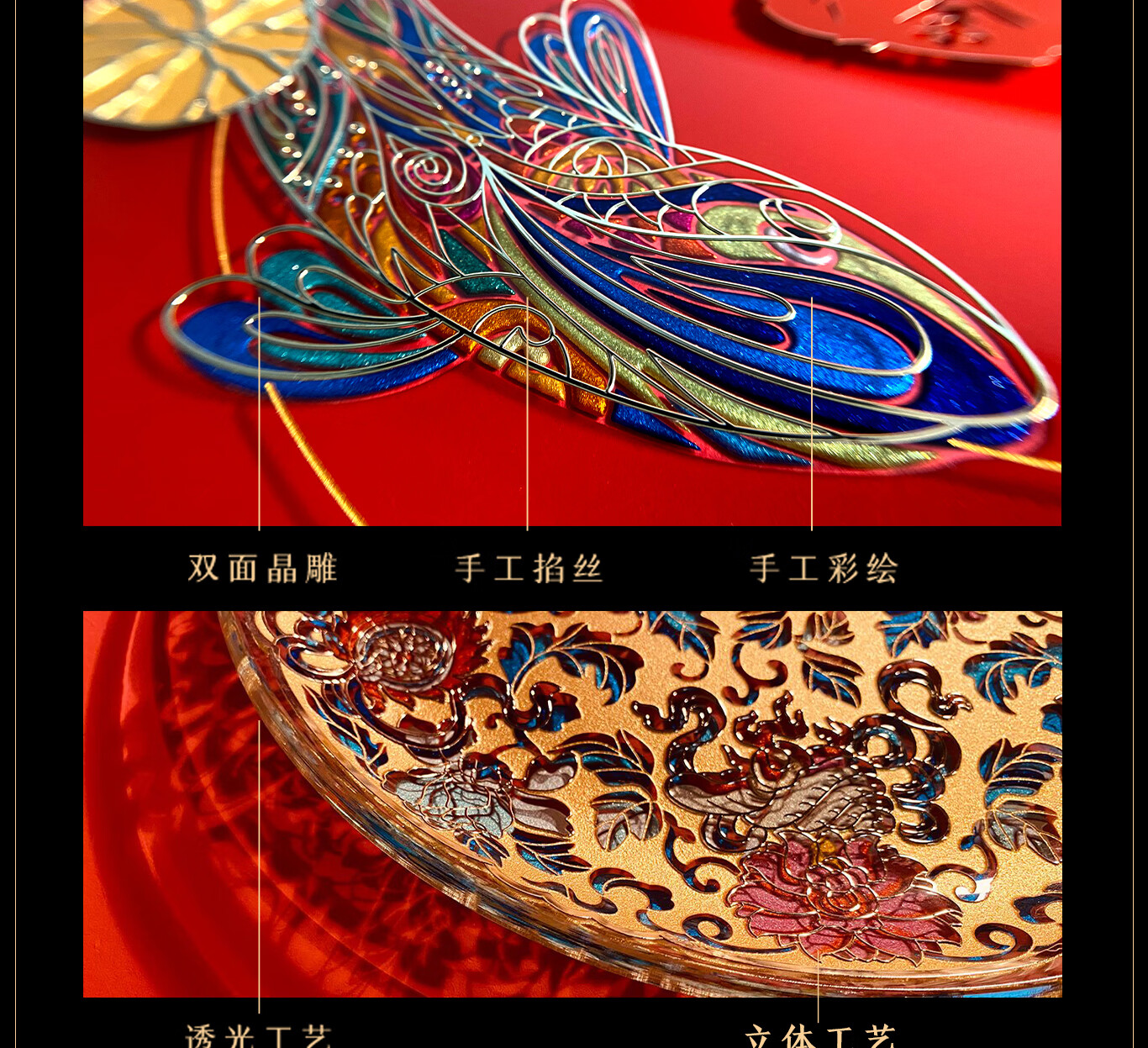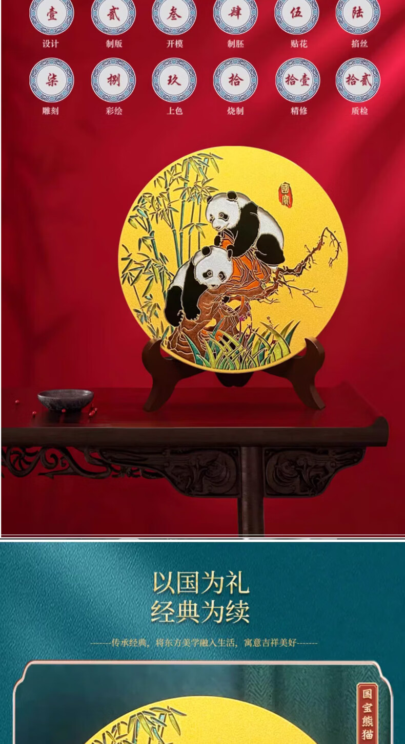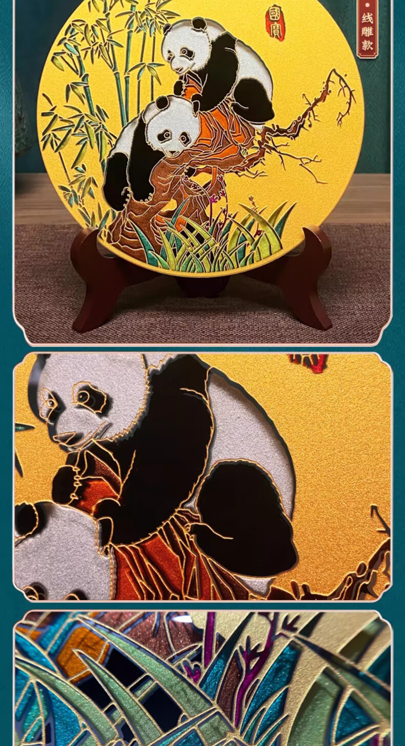 雅琅晶国宝熊猫摆件中国特色桌面工艺创意礼物办公室玄关装饰伴手纪念品 国宝熊猫晶雕手绘盘-金Φ17.5cm