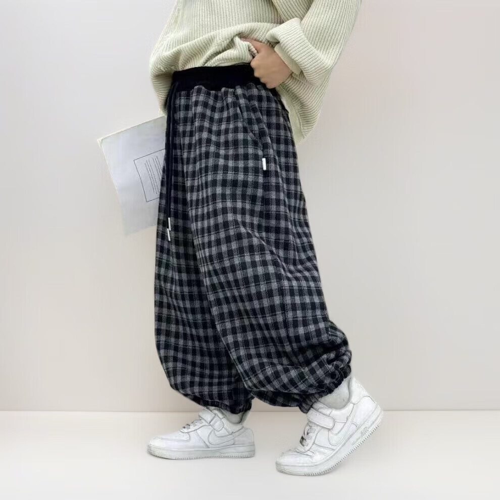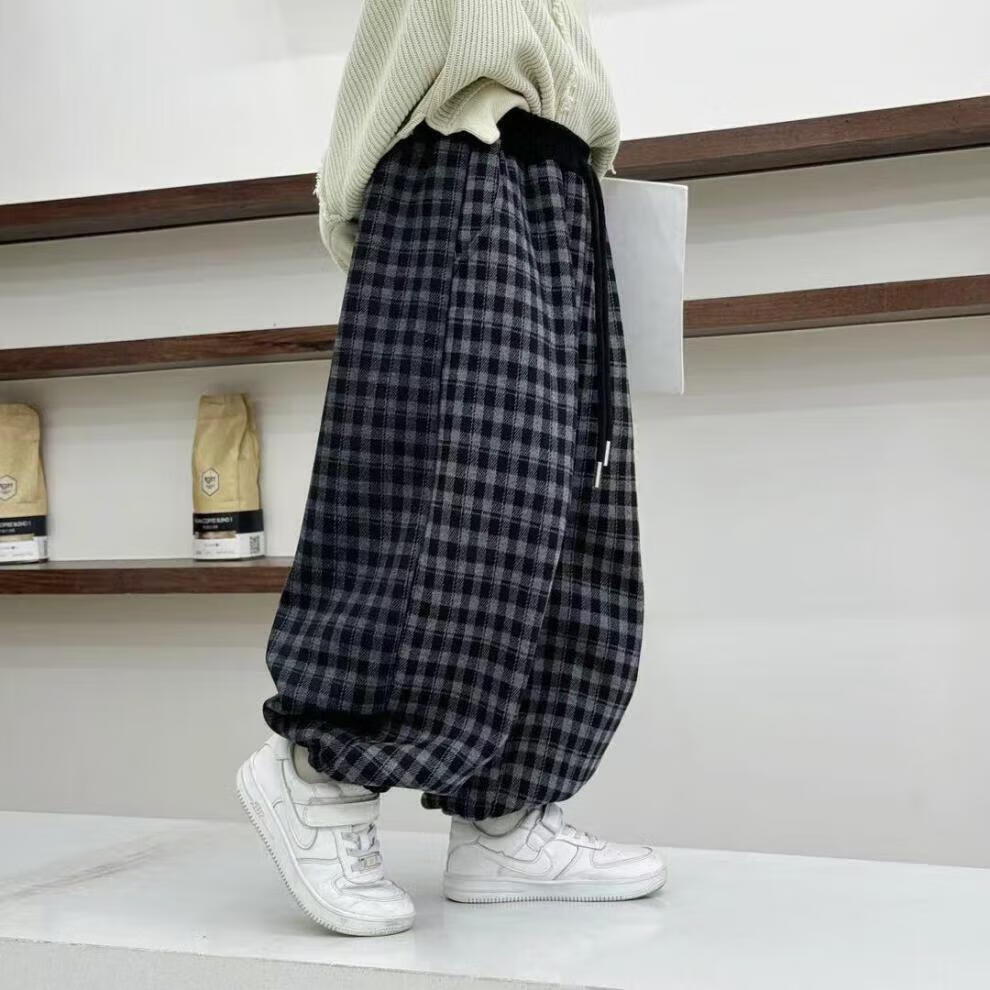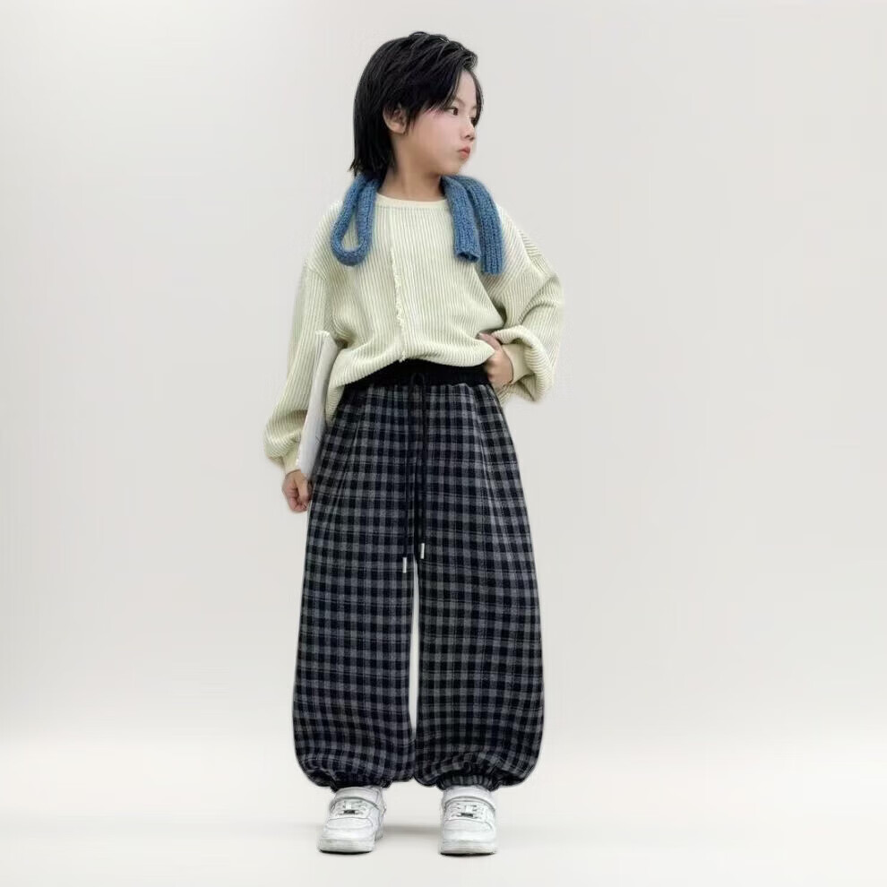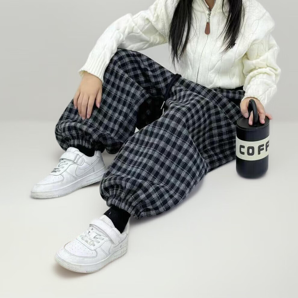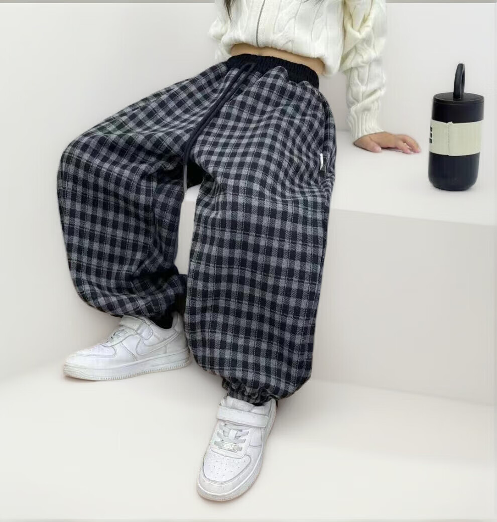 小猪班纳(PEPCO)儿童2025年冬装男女童拼腰格子加绒保暖休闲韩版束口长裤运动裤 拼腰格子加绒裤-黑色 100 cm