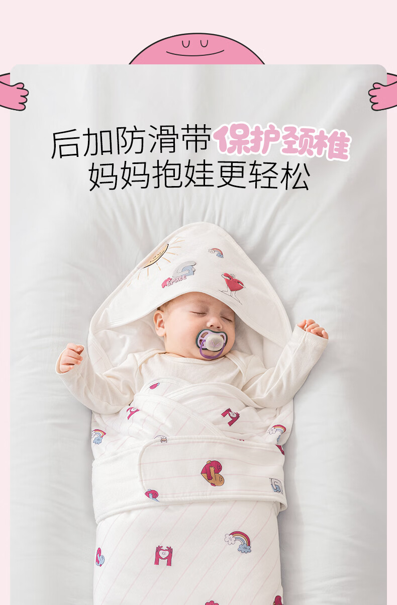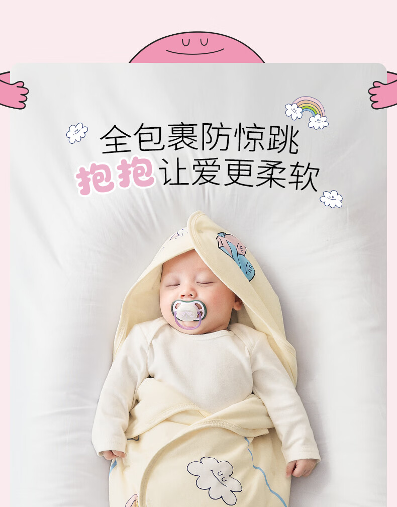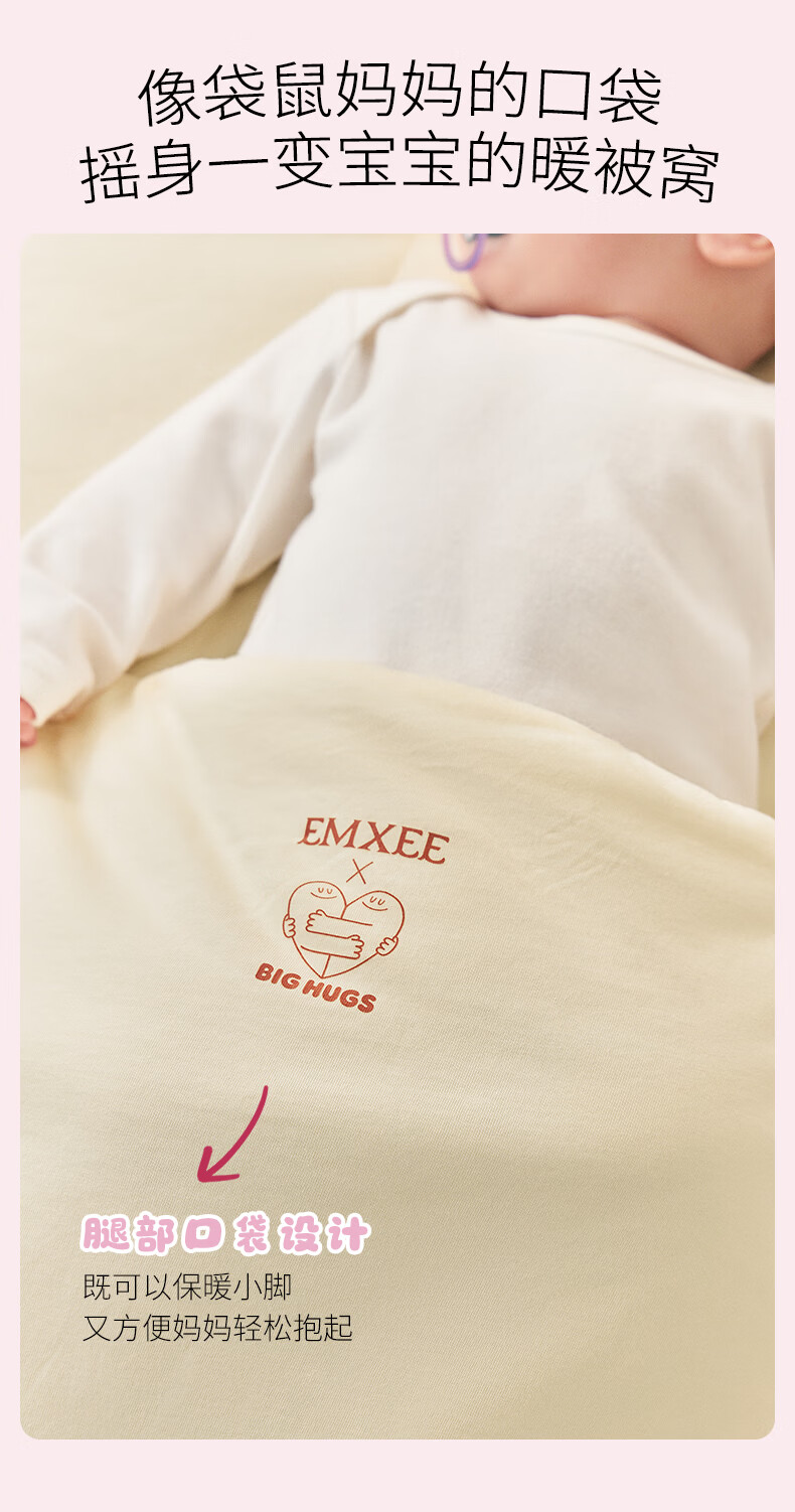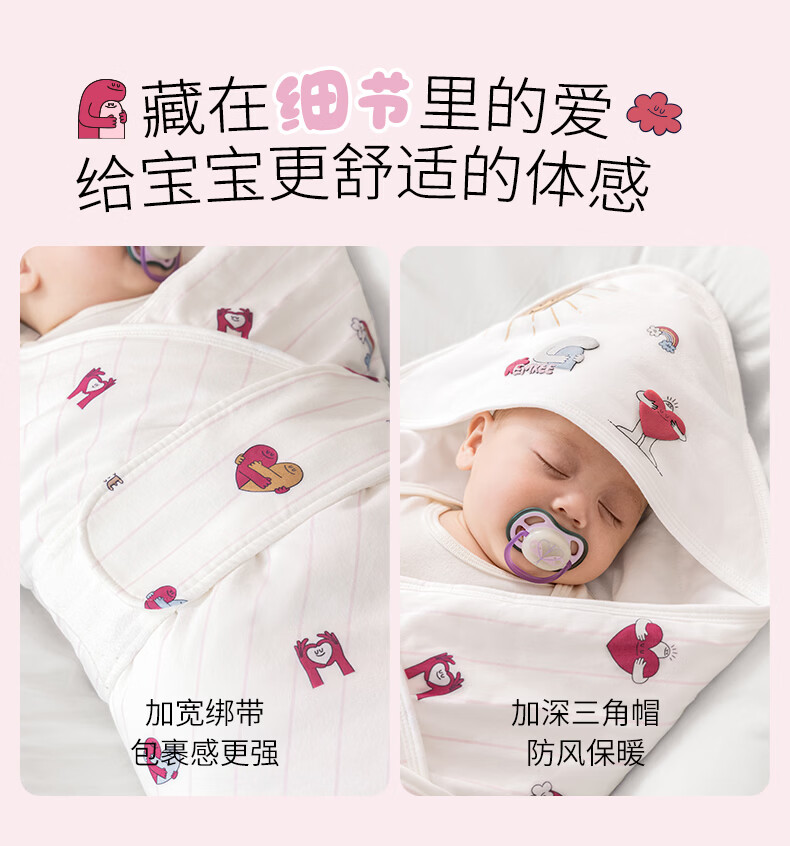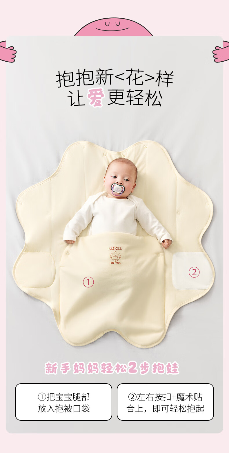 嫚熙(EMXEE)【抱抱人联名】婴儿包被初生宝宝包单防惊跳包巾四季外出抱被 【四季款】爱的抱抱-白底粉条 室温18-26℃ 90*90cm