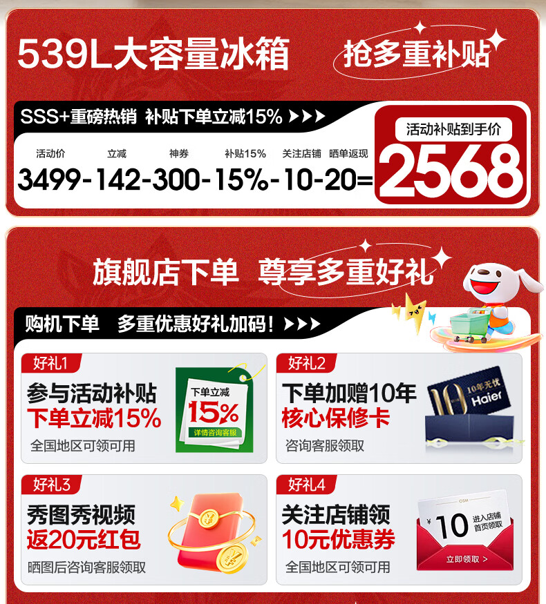 海尔冰箱出品统帅539升四开门十字对开门560嵌入式冰箱风冷无霜一级双变频干湿分储以旧换新电冰箱 阻氧干湿分储+黑金净化+一级双变频
