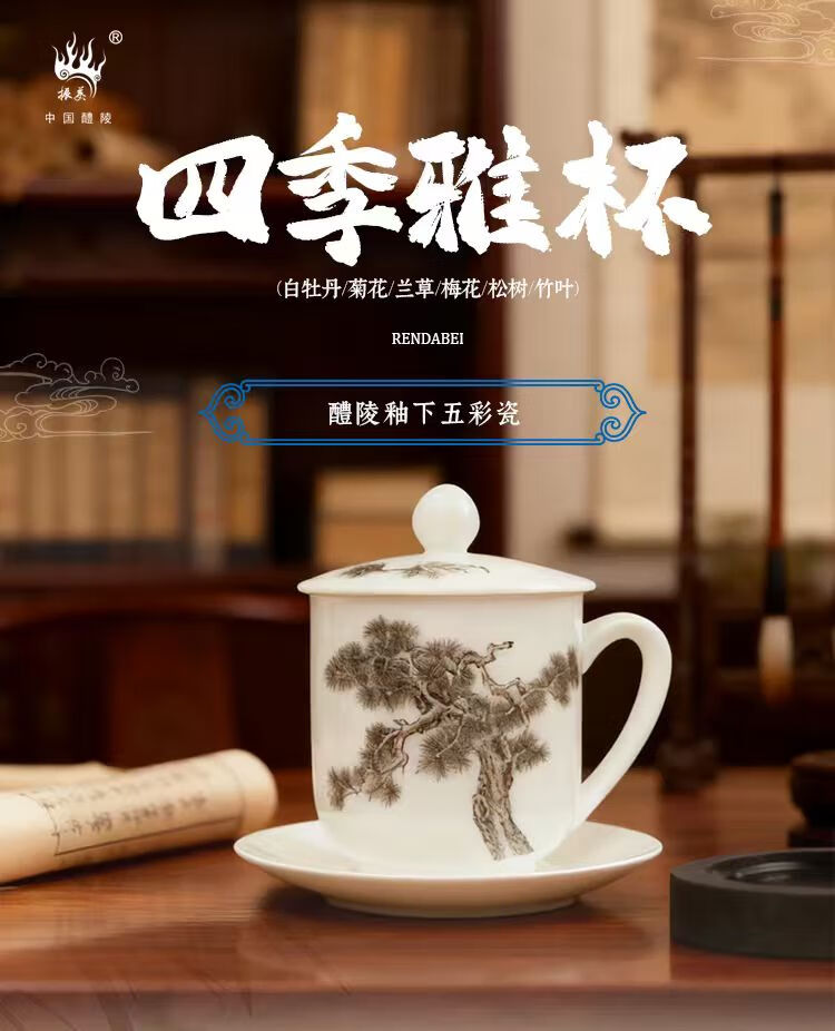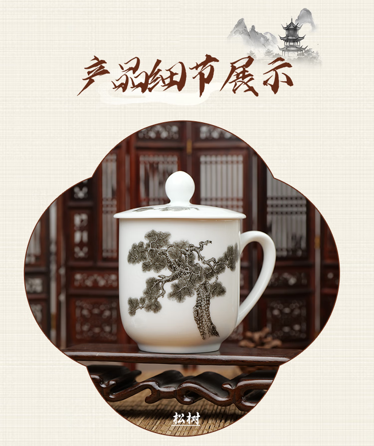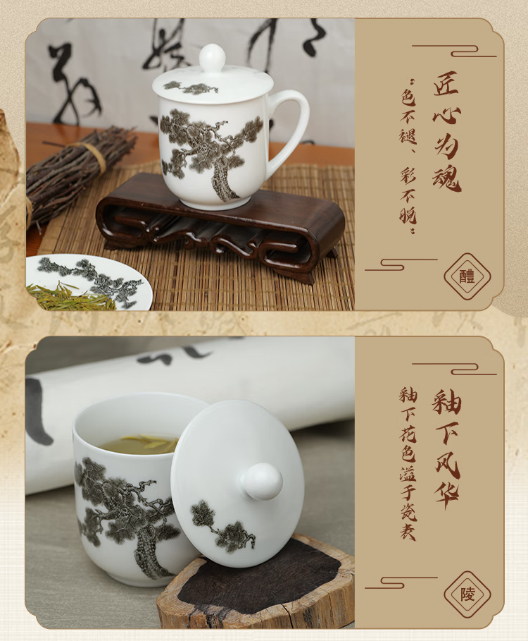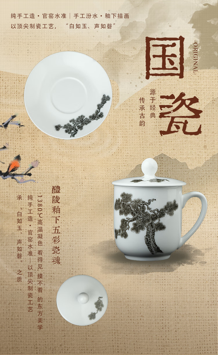振美醴陵办公室茶杯带盖会议杯 主人杯喝水杯 国瓷陶瓷 人民水杯400ml 松树单杯-礼盒装
