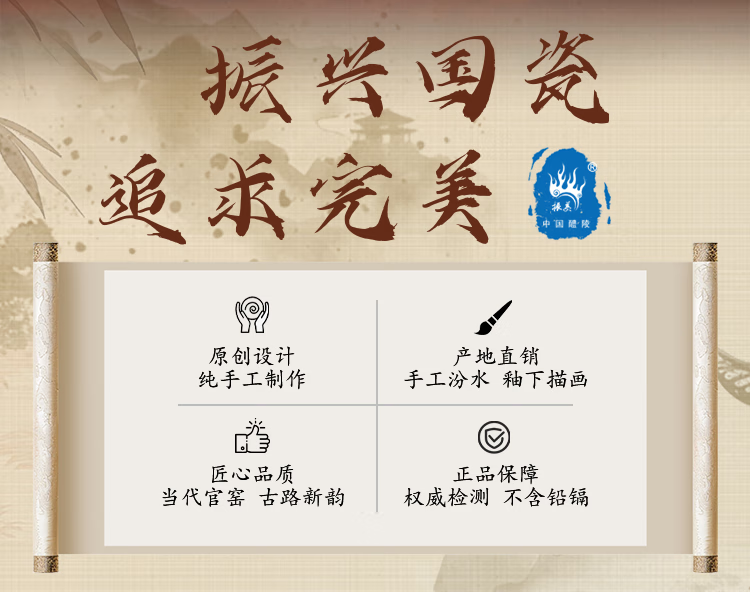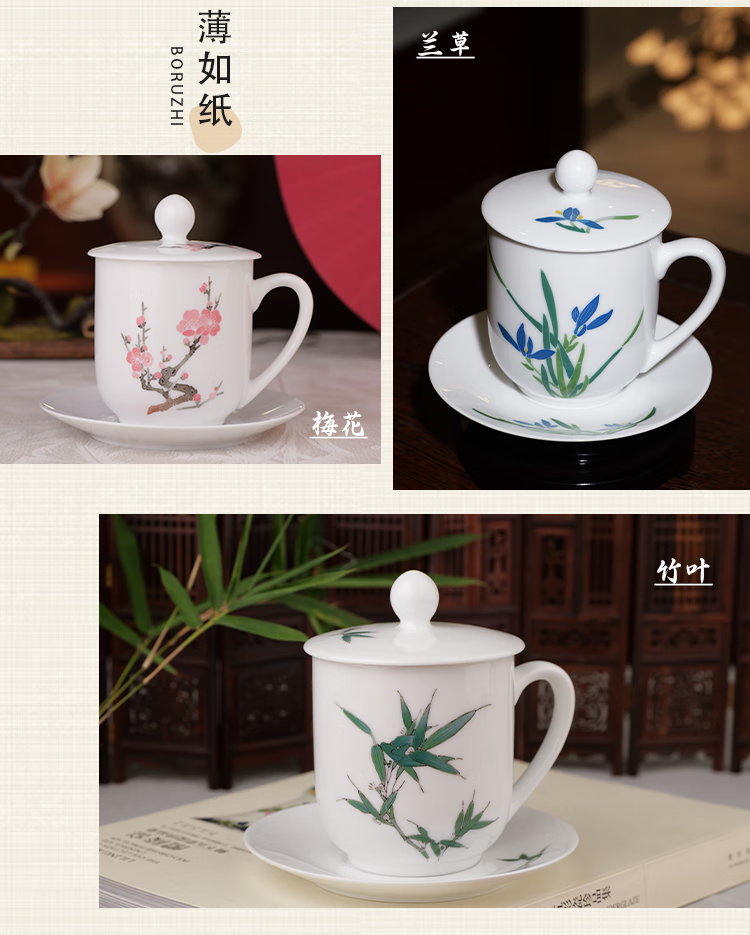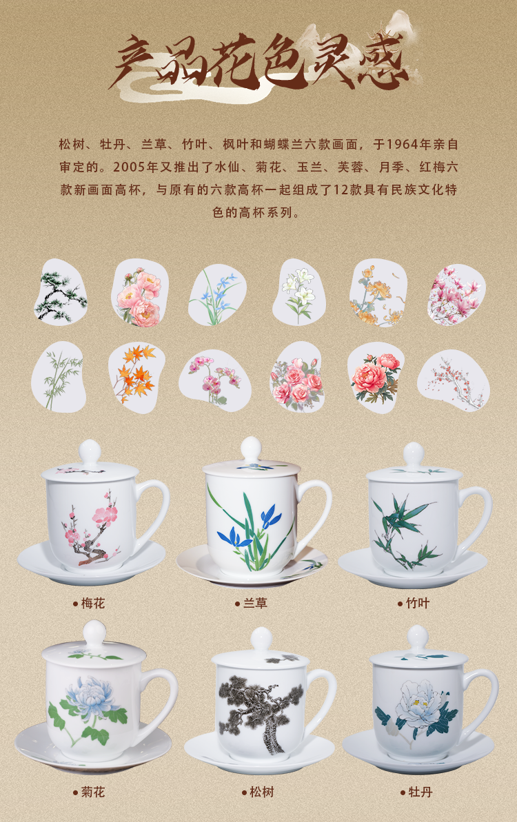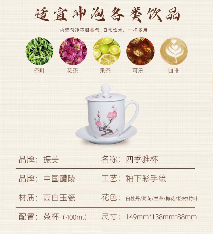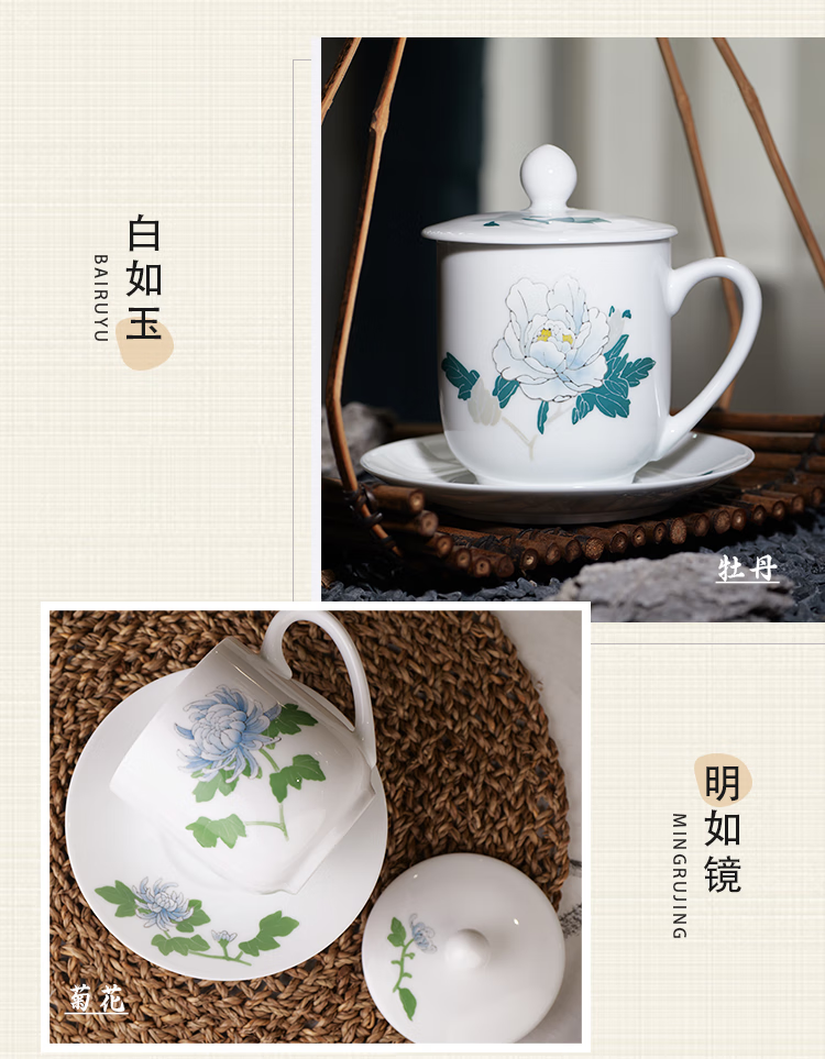 振美醴陵办公室茶杯带盖会议杯 主人杯喝水杯 国瓷陶瓷 人民水杯400ml 松树单杯-礼盒装