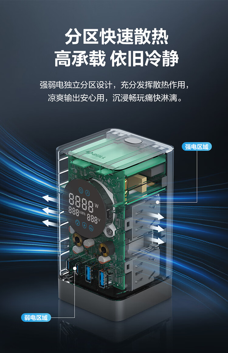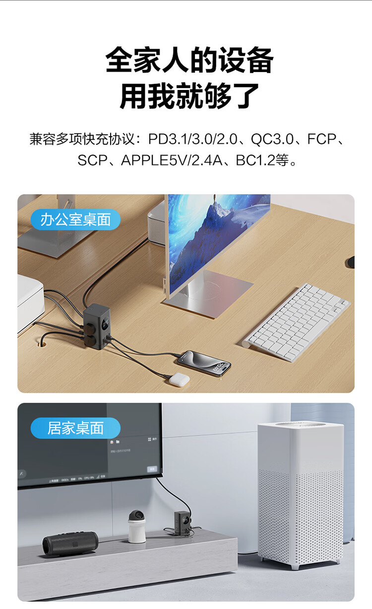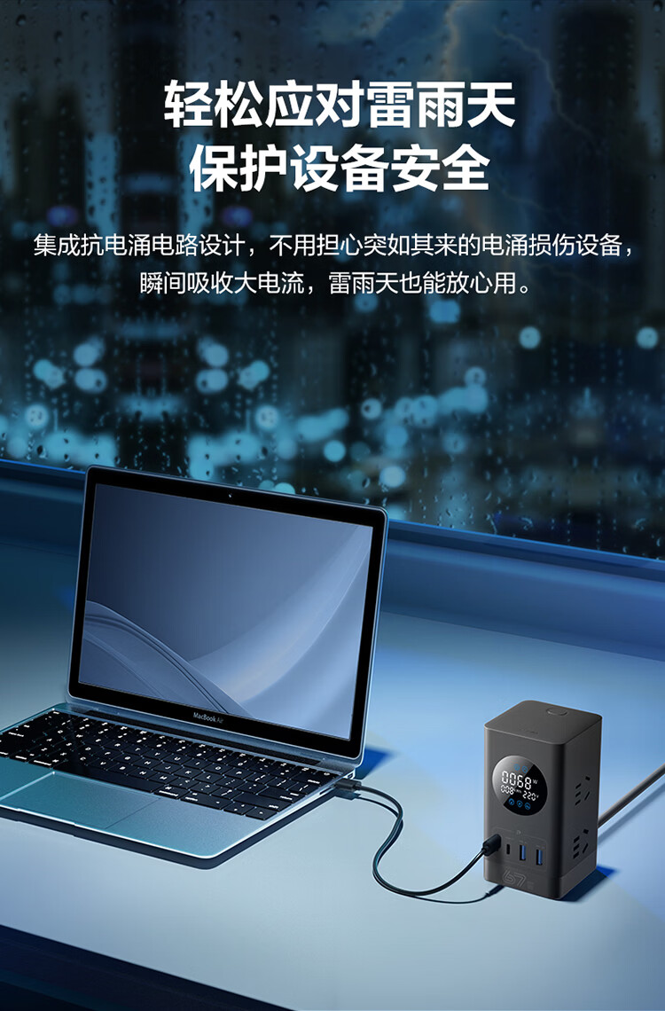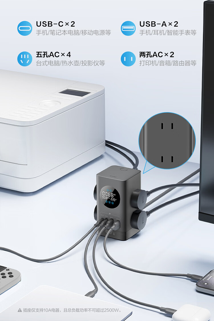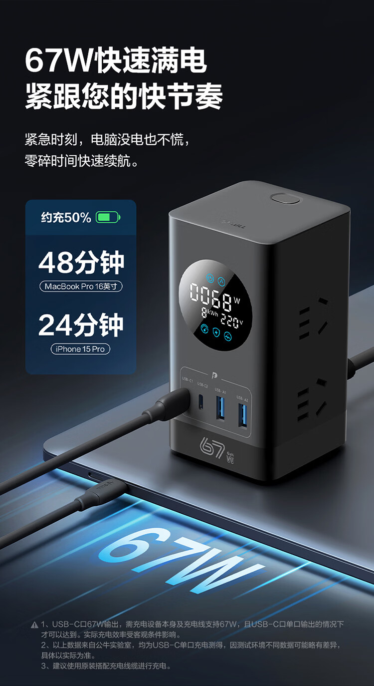 公牛(BULL)插座USB快充智能数显立式插排多功能桌面充电站办公插线板排插35W/67W/100W 【35W快充-10合1】-卵石灰1.5米