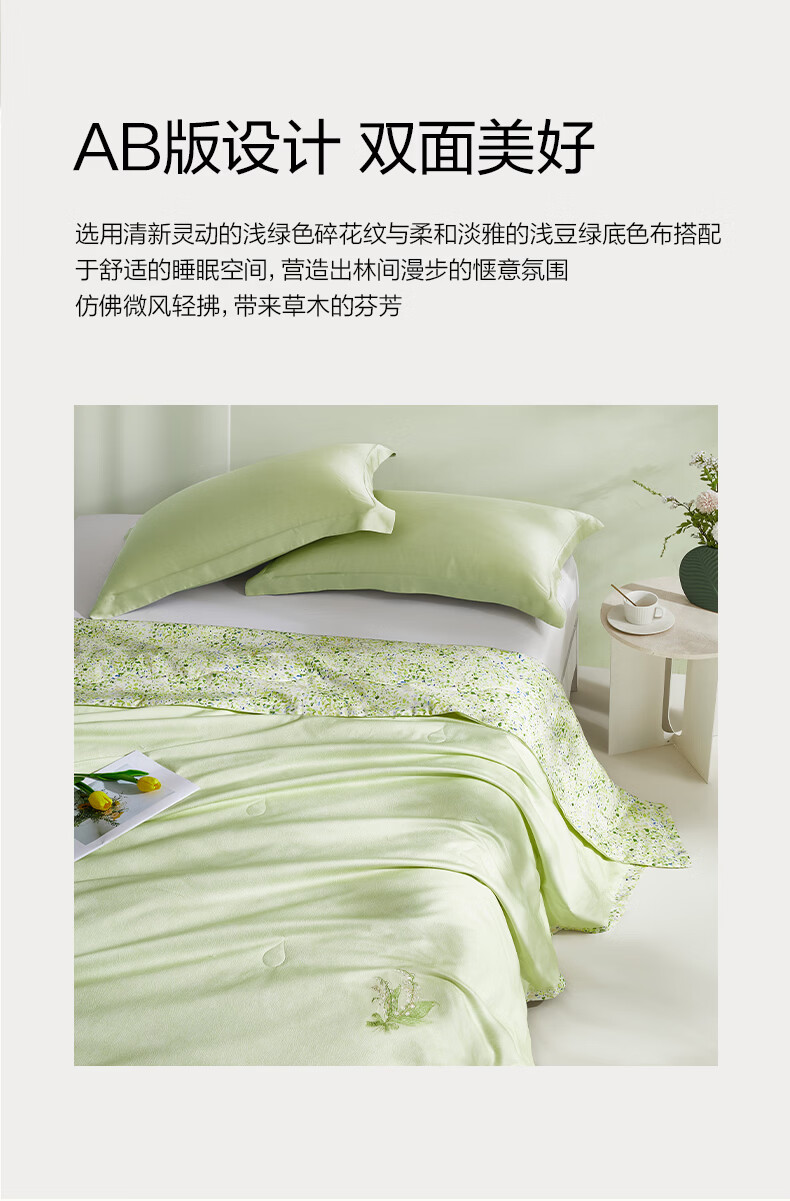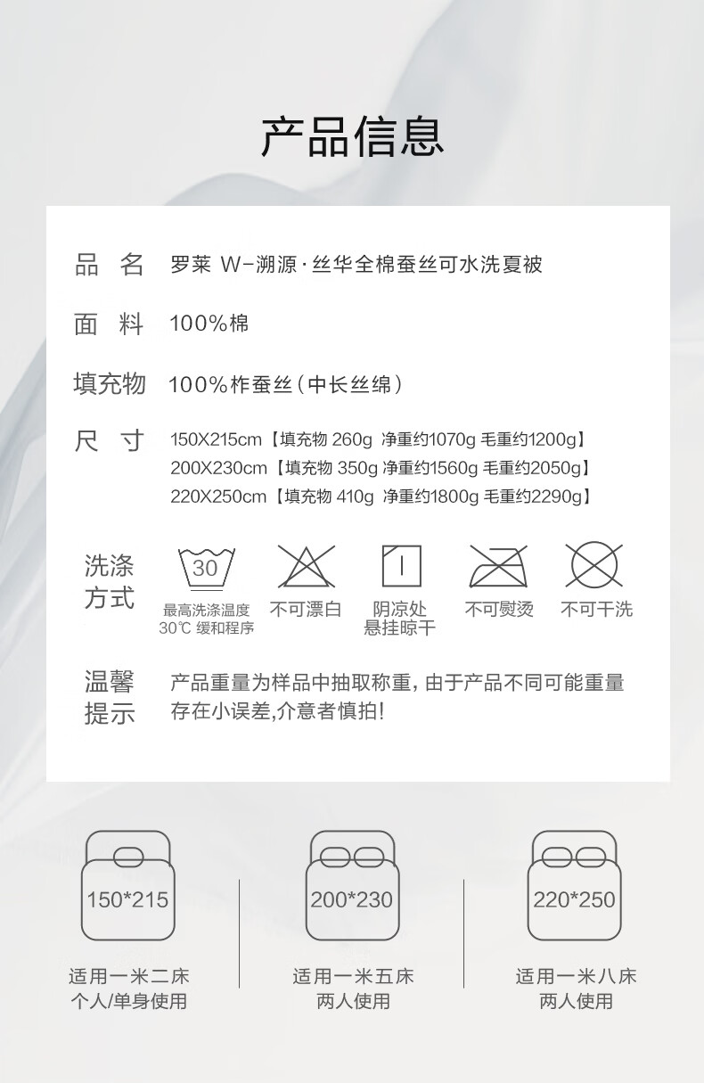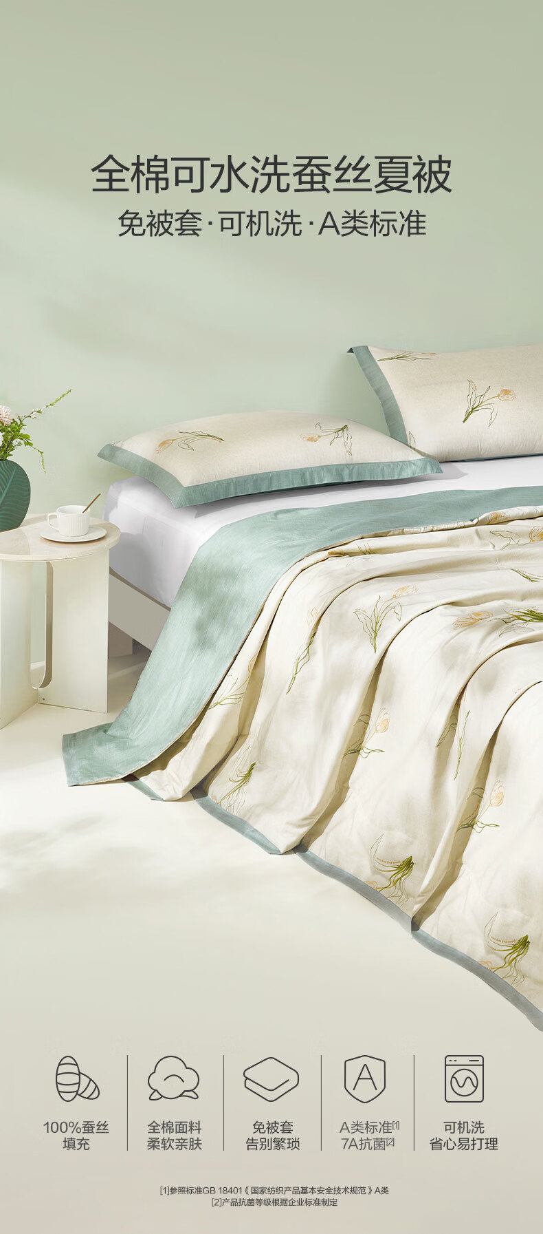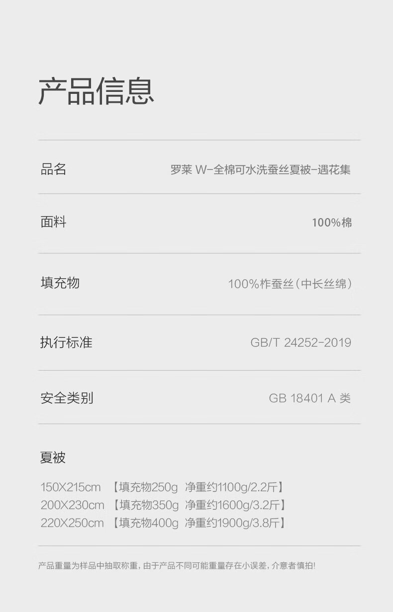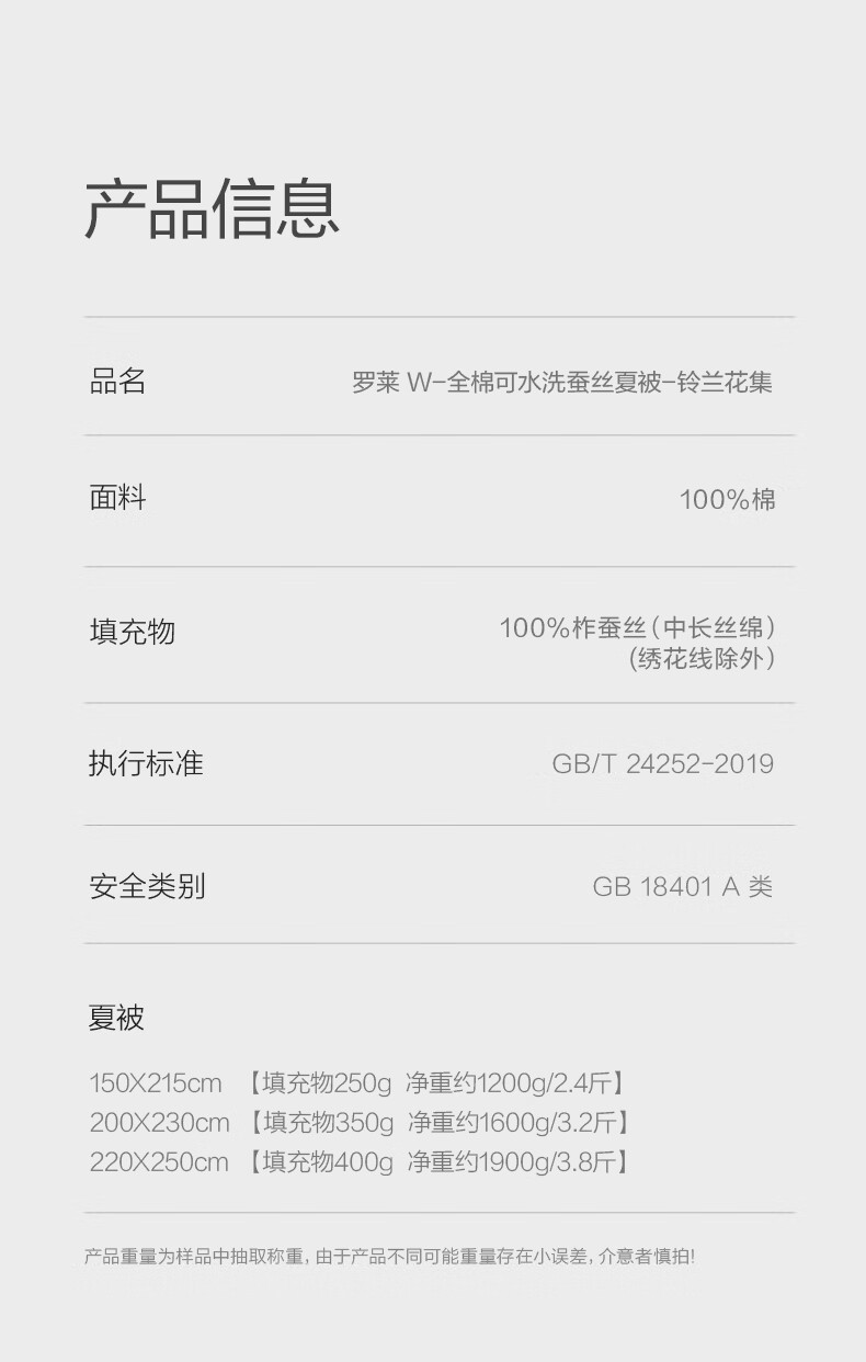 罗莱家纺A类全棉抗菌可水洗100%蚕丝夏被凉感被空调被 【成人A类 性价比之选】全棉可水洗蚕丝夏被-铃兰花集 150cm*215cm